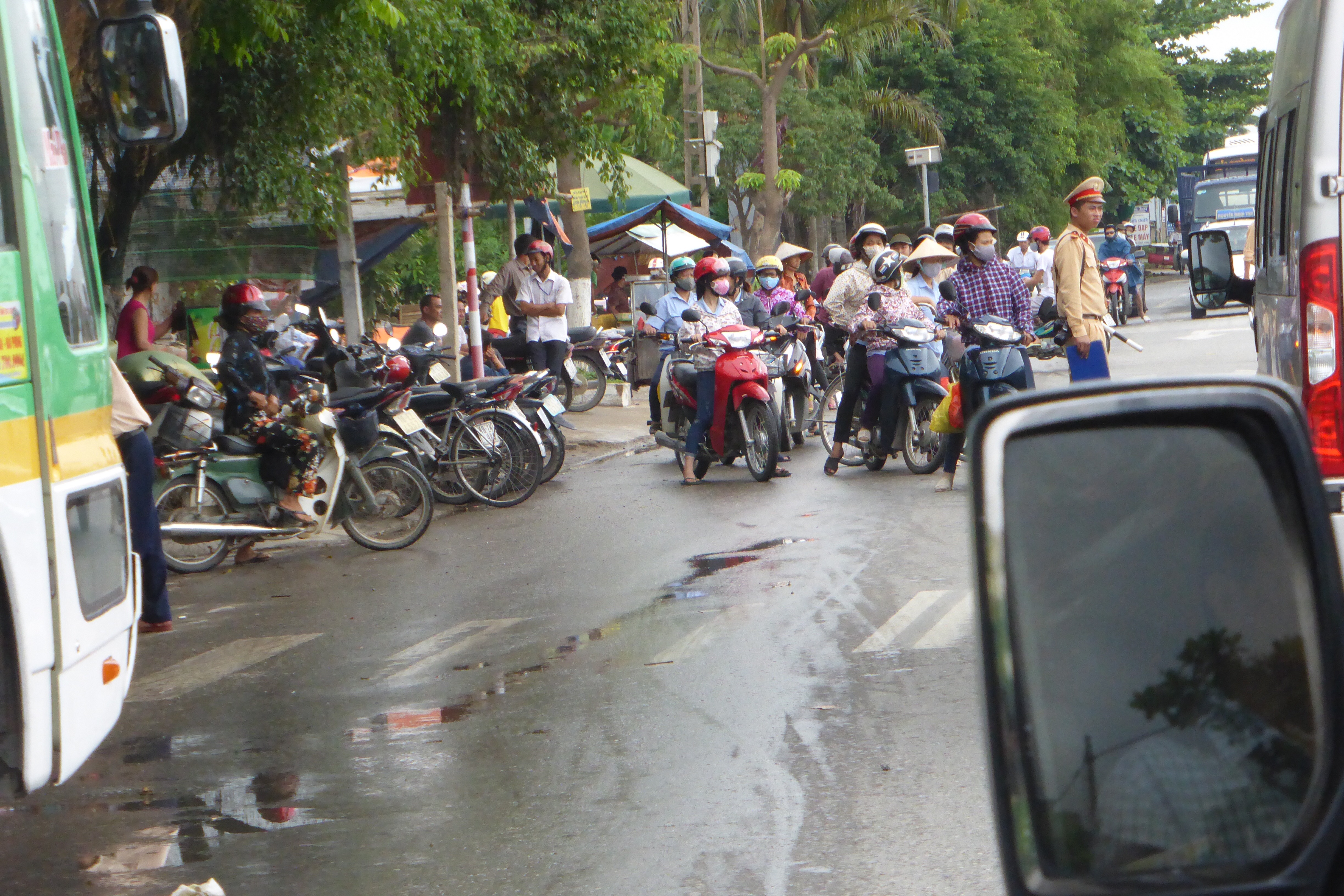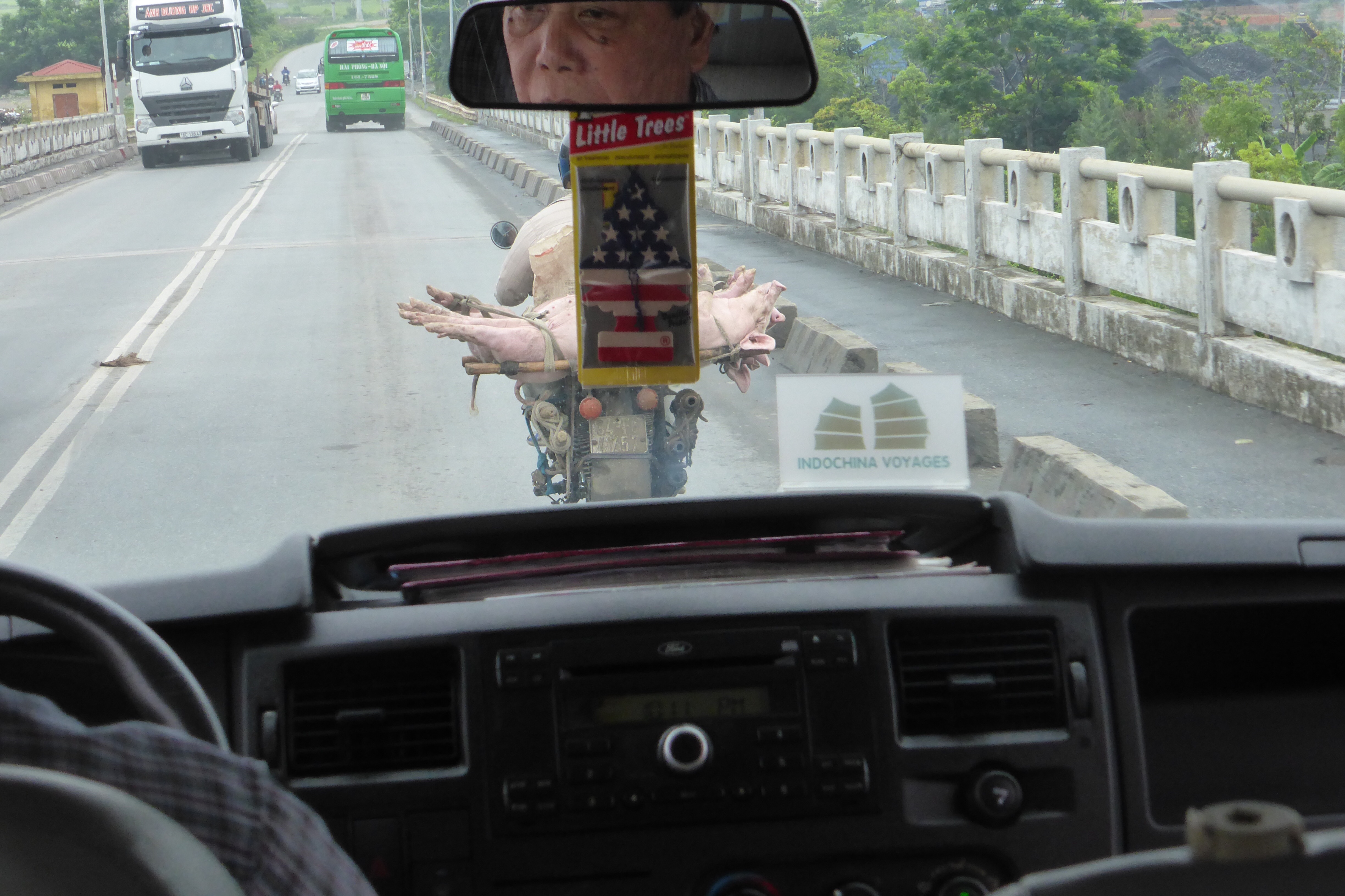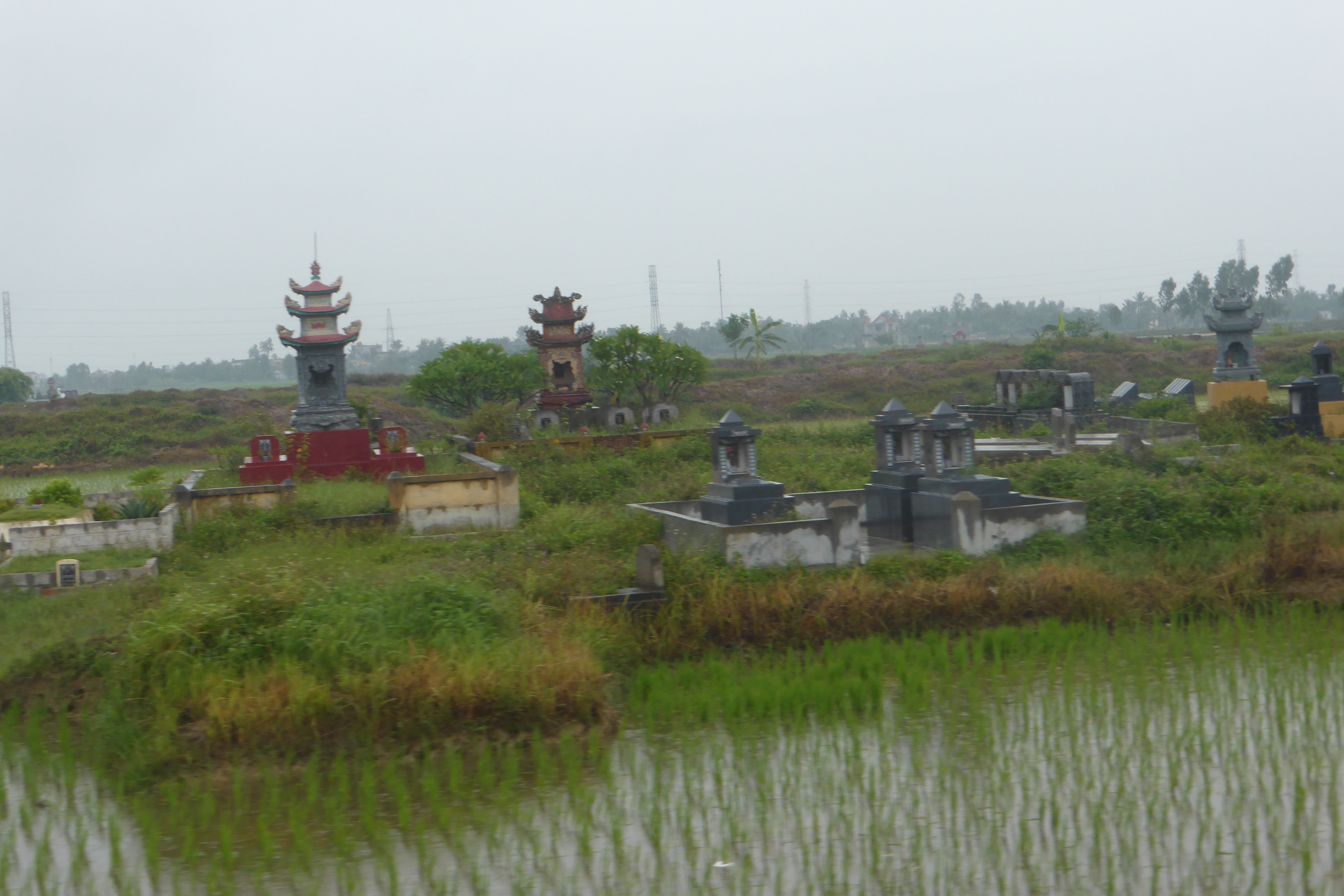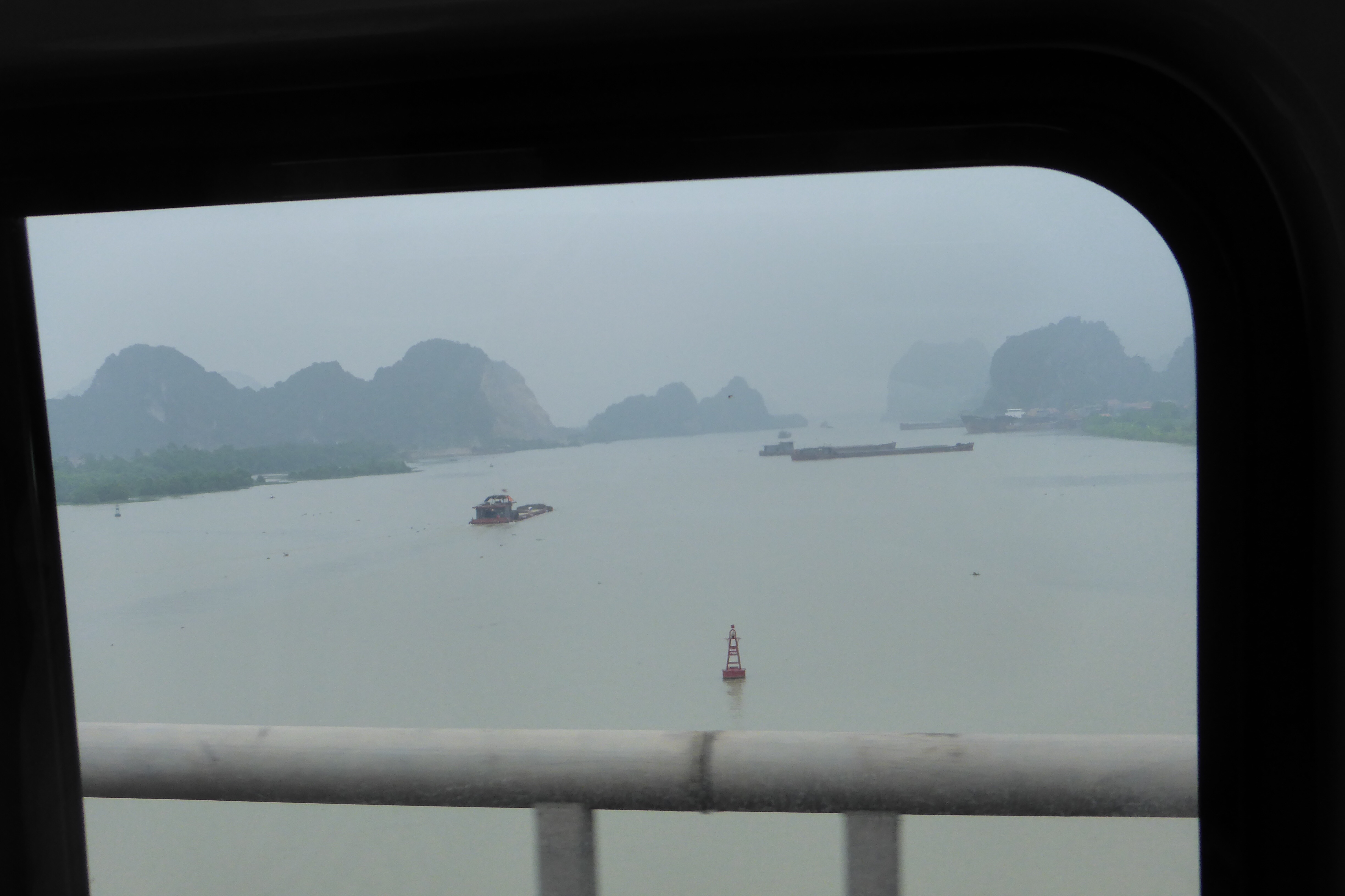 It was a four hour drive from Ninh Binh to Halong Bay, made quite comfortable in our air conditioned van. The road was good and the traffic was steady, without ever becoming too heavy. It rained on and off. In one place the traffic ground almost to a halt. There was a bus stopped on the side of the road and a large group of onlookers. Police were directing traffic around it. As we passed, we could see a motorbike under its front wheels. There was no injured person in sight, and I can only hope that he or she was able to exit the bike before it went under the bus. Despite the traffic chaos and apparent disregard for road rules that we have perceived, this was the first evidence we had seen of anyone coming to grief on a Vietnamese road.