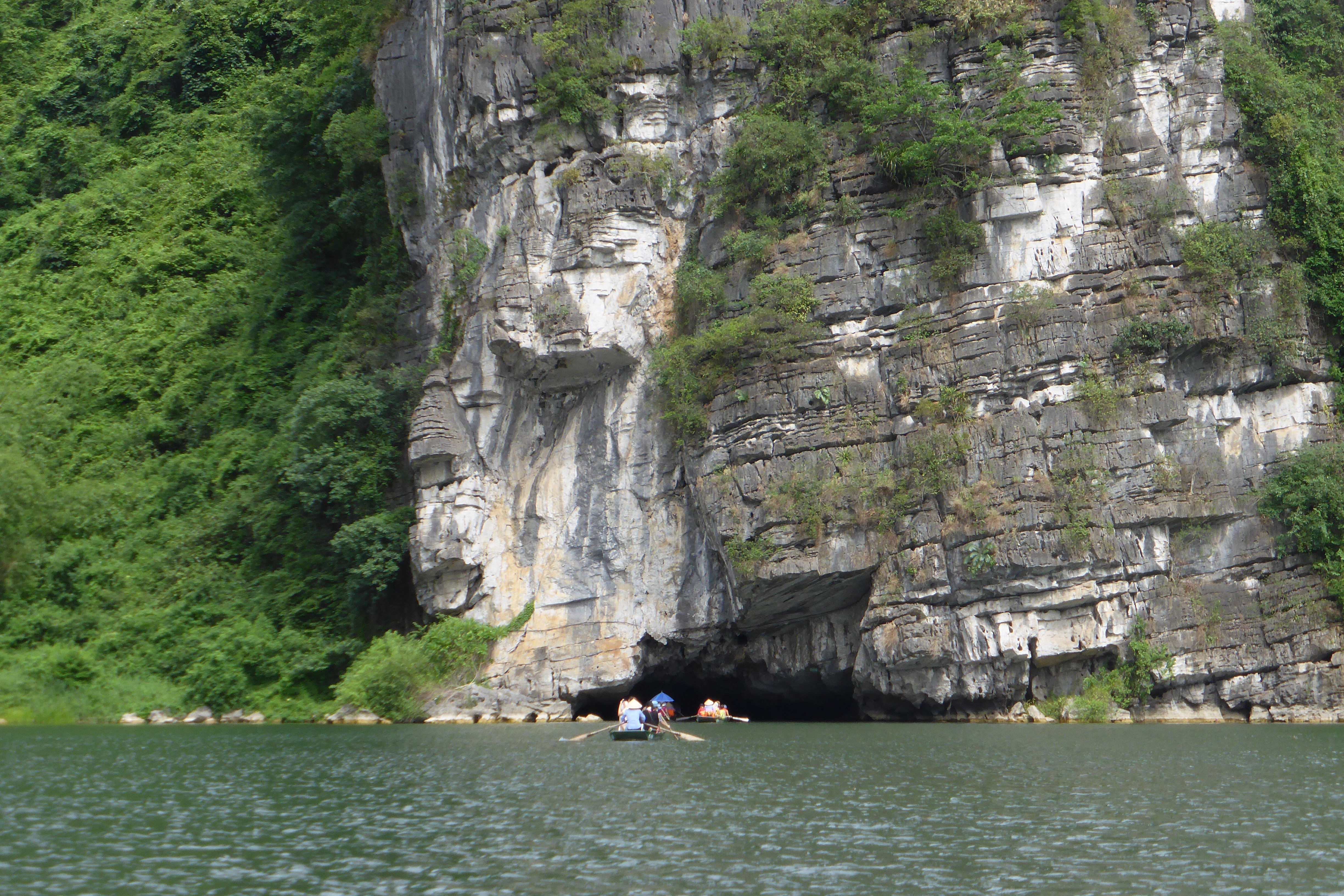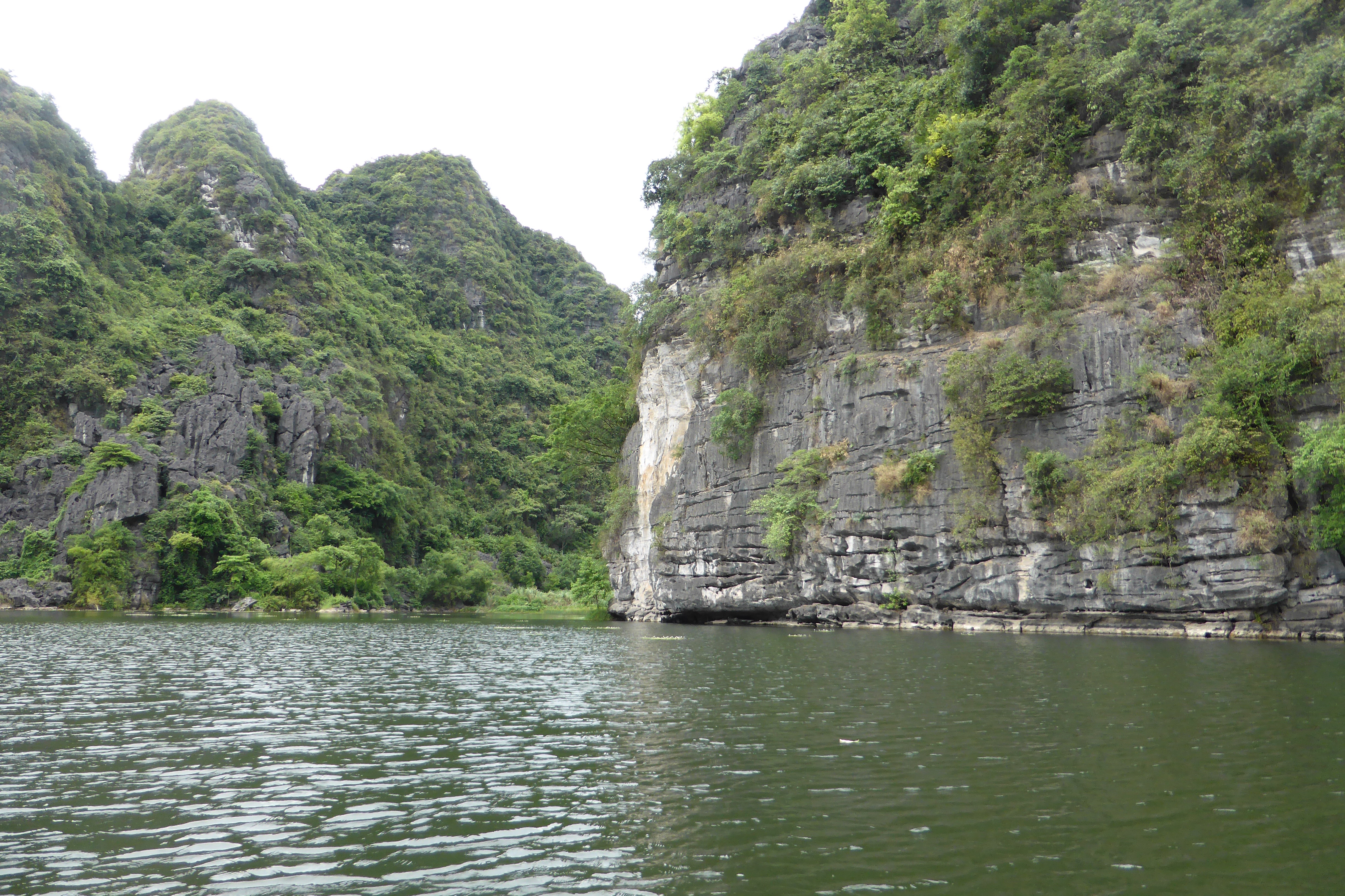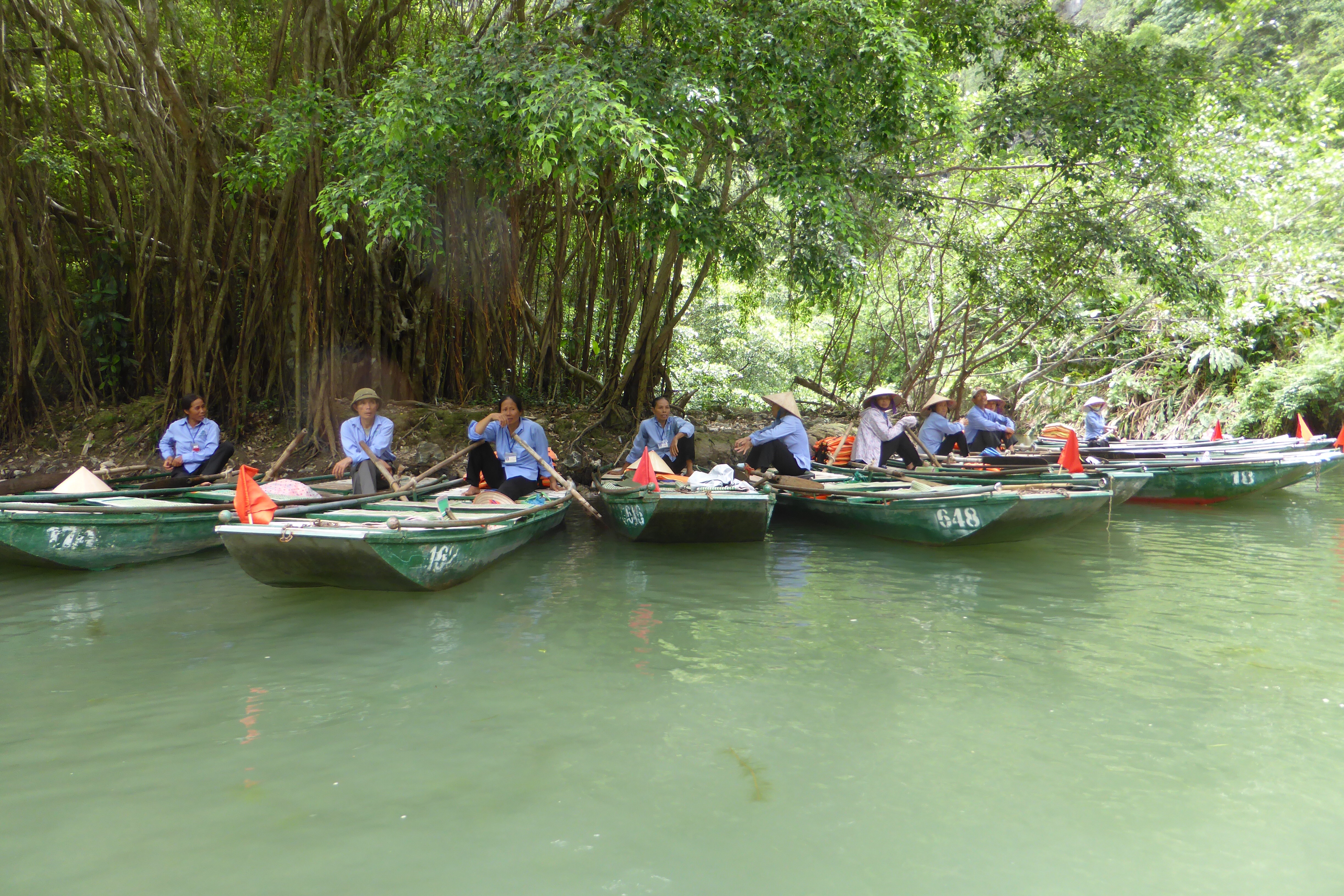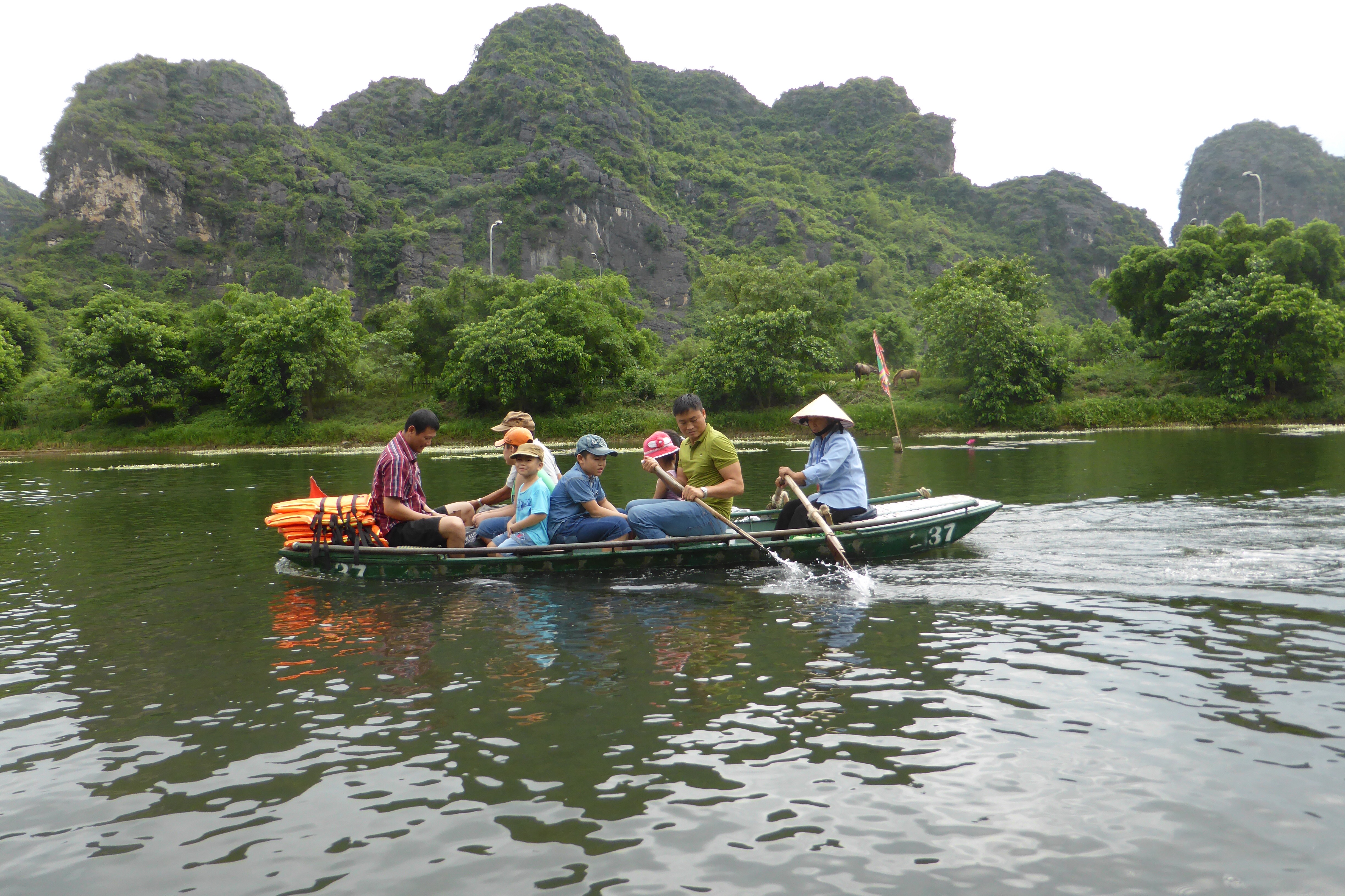 The Trang An Scenic Landscape Complex received UNESCO World Heritage Listing in 2011. It is a stunning geologic region dominated by steep limestone hills known as karsts, flooded inland waterways and nine large grottoes. For two glorious hours we took a leisurely sampan tour through this beautiful natural place. Sinh accompanied us and chatted away in the local language to the slightly built woman who rowed our boat. There are over 2000 sampans here, so it’s lucky that we didn’t come on a weekend when the waterways appear to almost be wall-to-wall people on boats. For a short while we had other sampans alongside us for company, but for much of the time we were on our own floating silently down the waterway, marvelling at the beauty of the forests and the hills and the water plants that we passed.