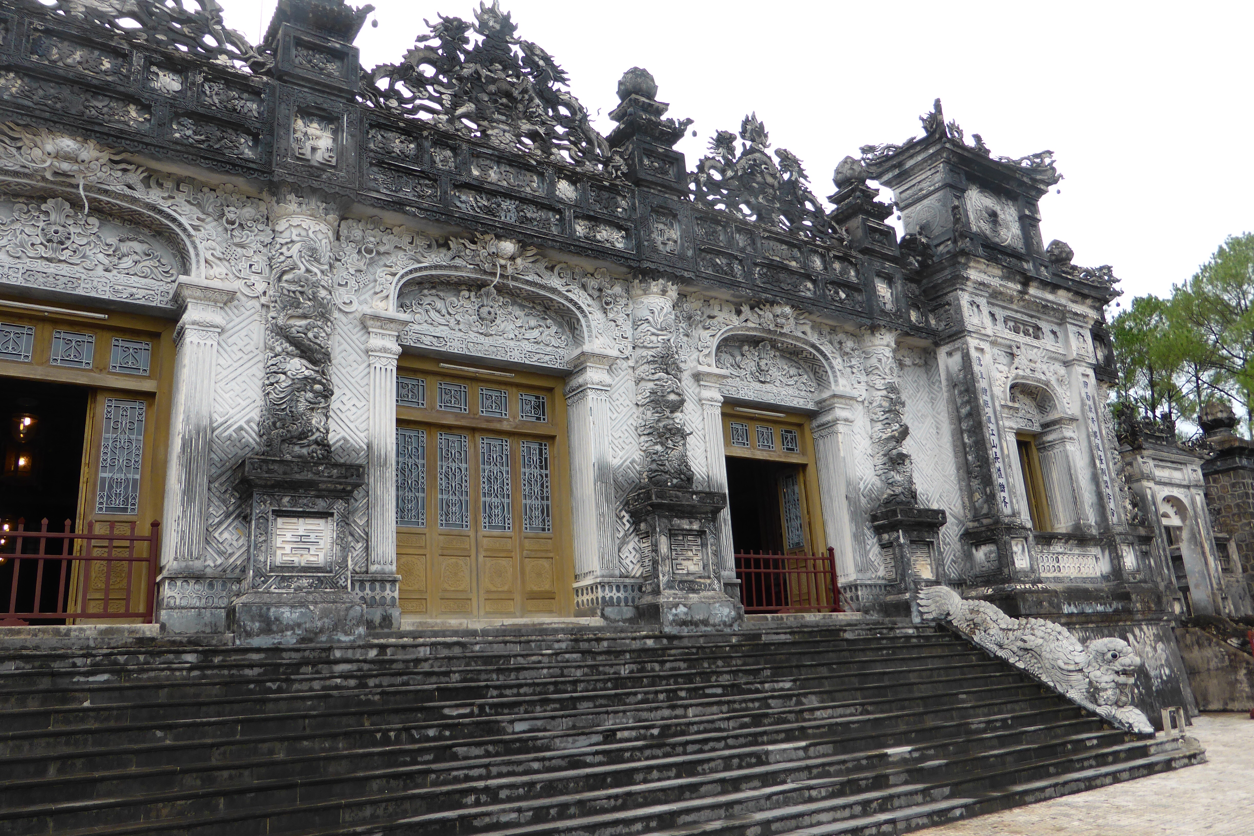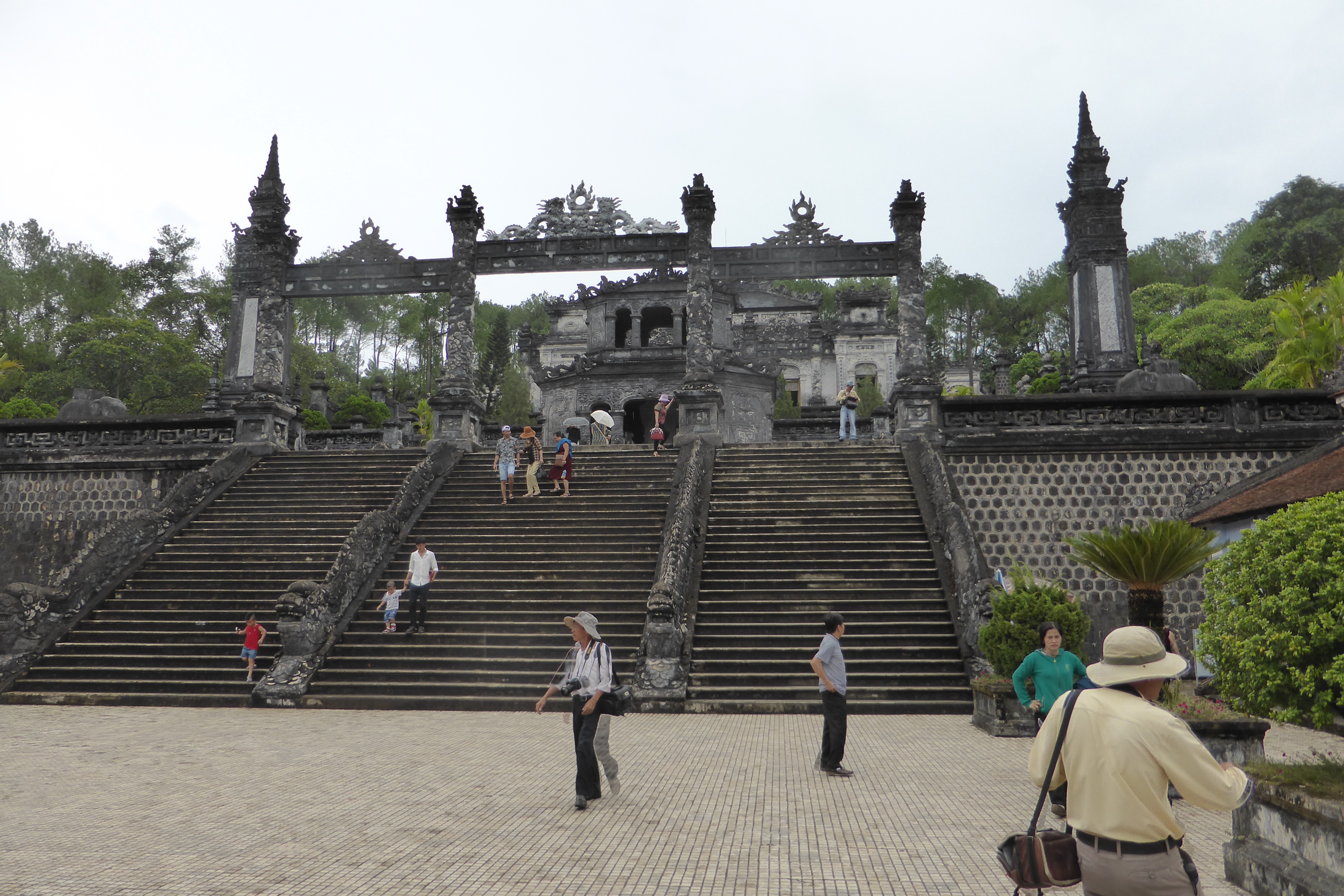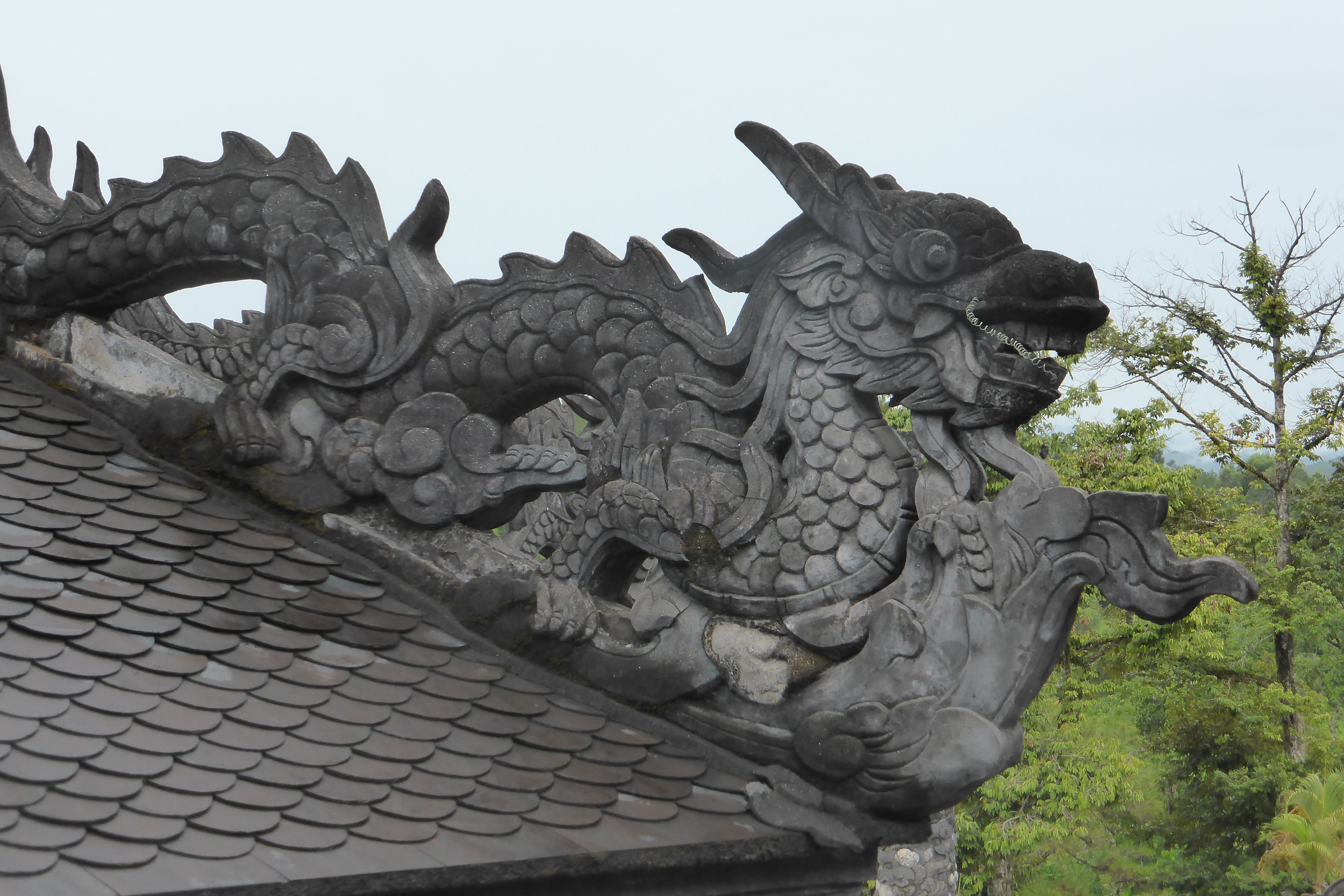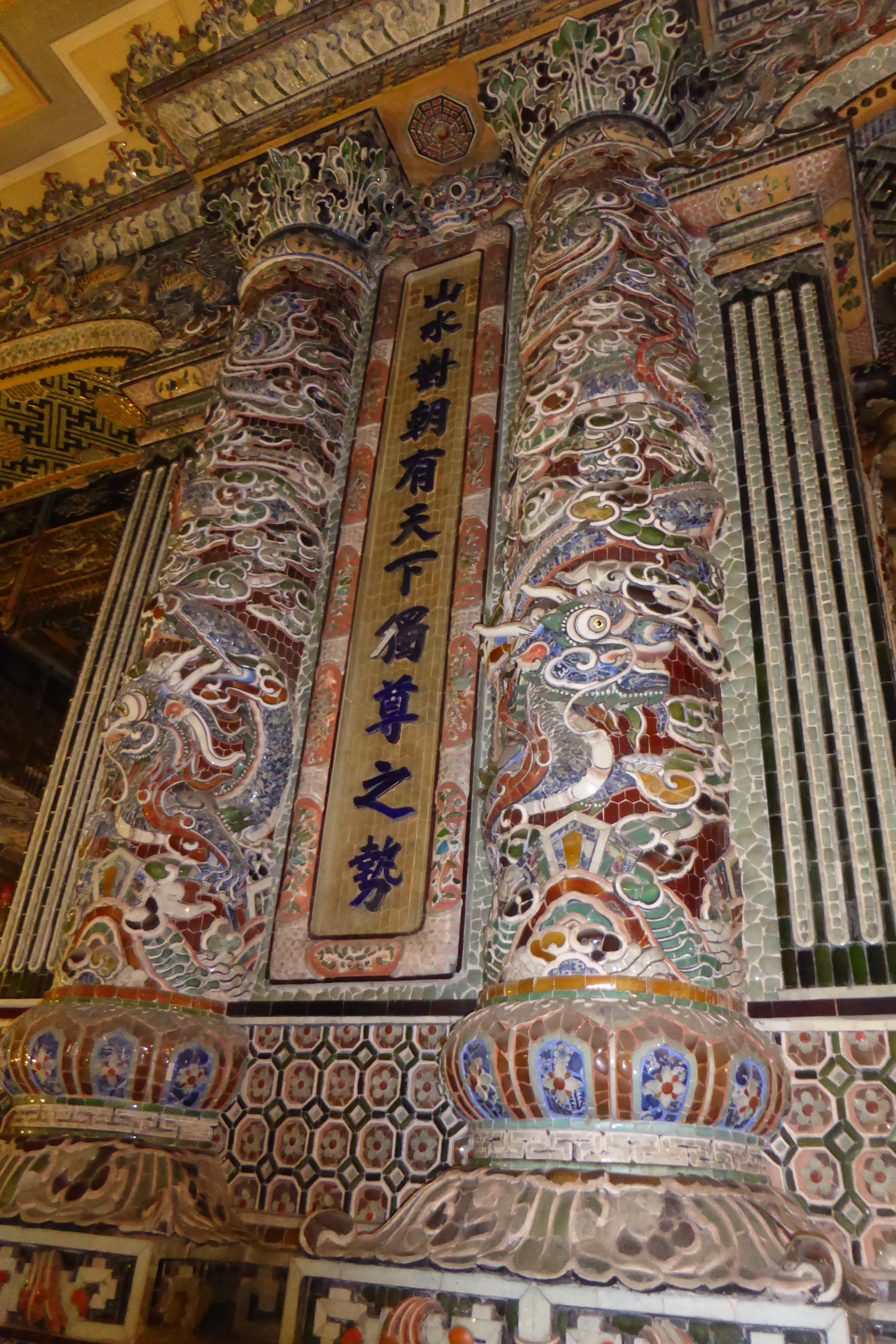 Khai Dinh was the second last of the Nguyen Dynasty emperors, ruling from 1916-1925 under the French, but he died several years before his tomb was completed. It is constructed from concrete. Being on the side of a hill, it is quite imposing when you arrive as it towers over you and there is a fairly steep climb up steps to reach it. Inside the structure, the artistry is quite stunning and in many cases, quite different to that which we had previously seen in historic buildings here in Vietnam. Everything seems rich in meaning – the four seasons, the happiness symbol, the dragon, the five elements, the connection of the person with earth and heaven. This was well worth a visit.
