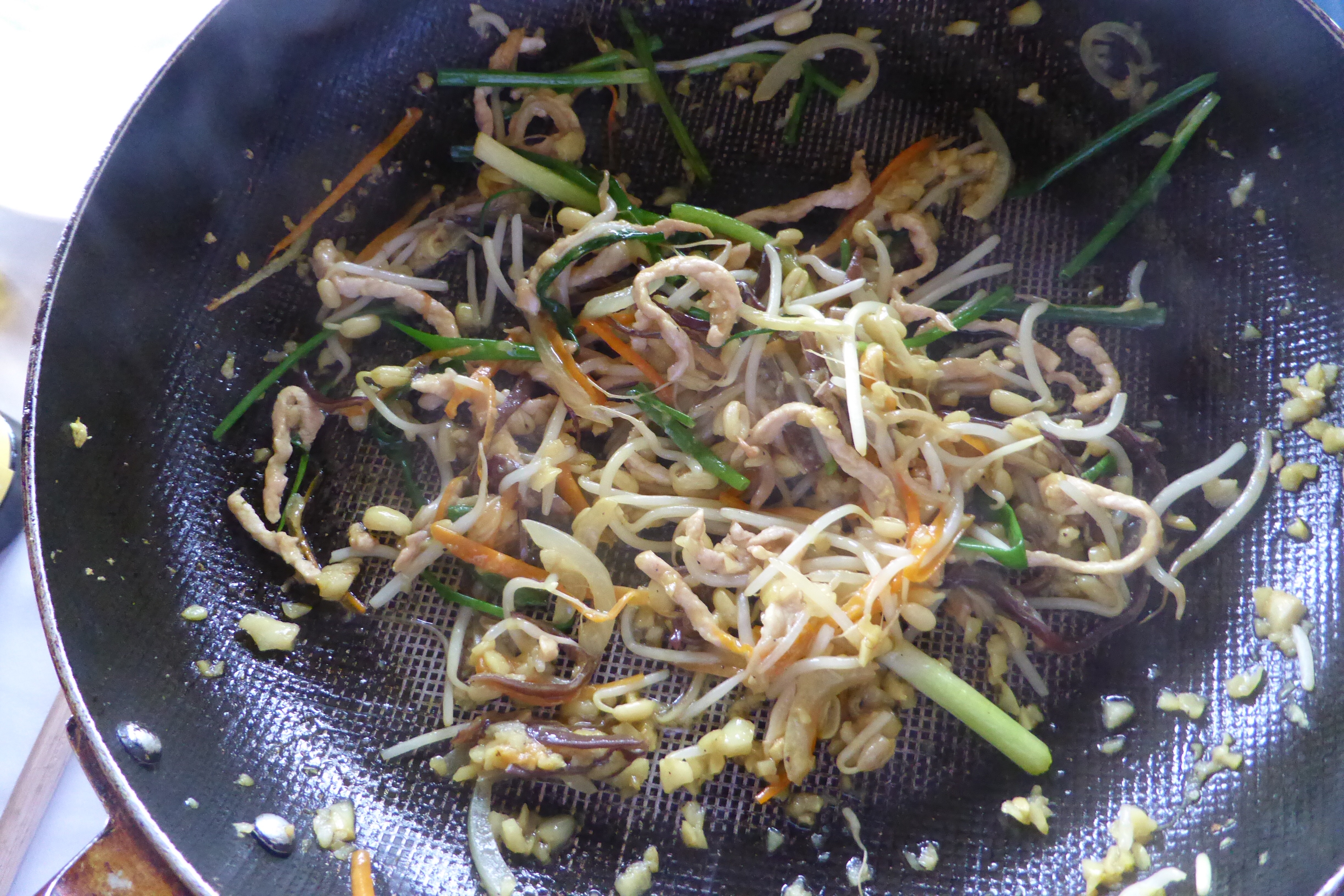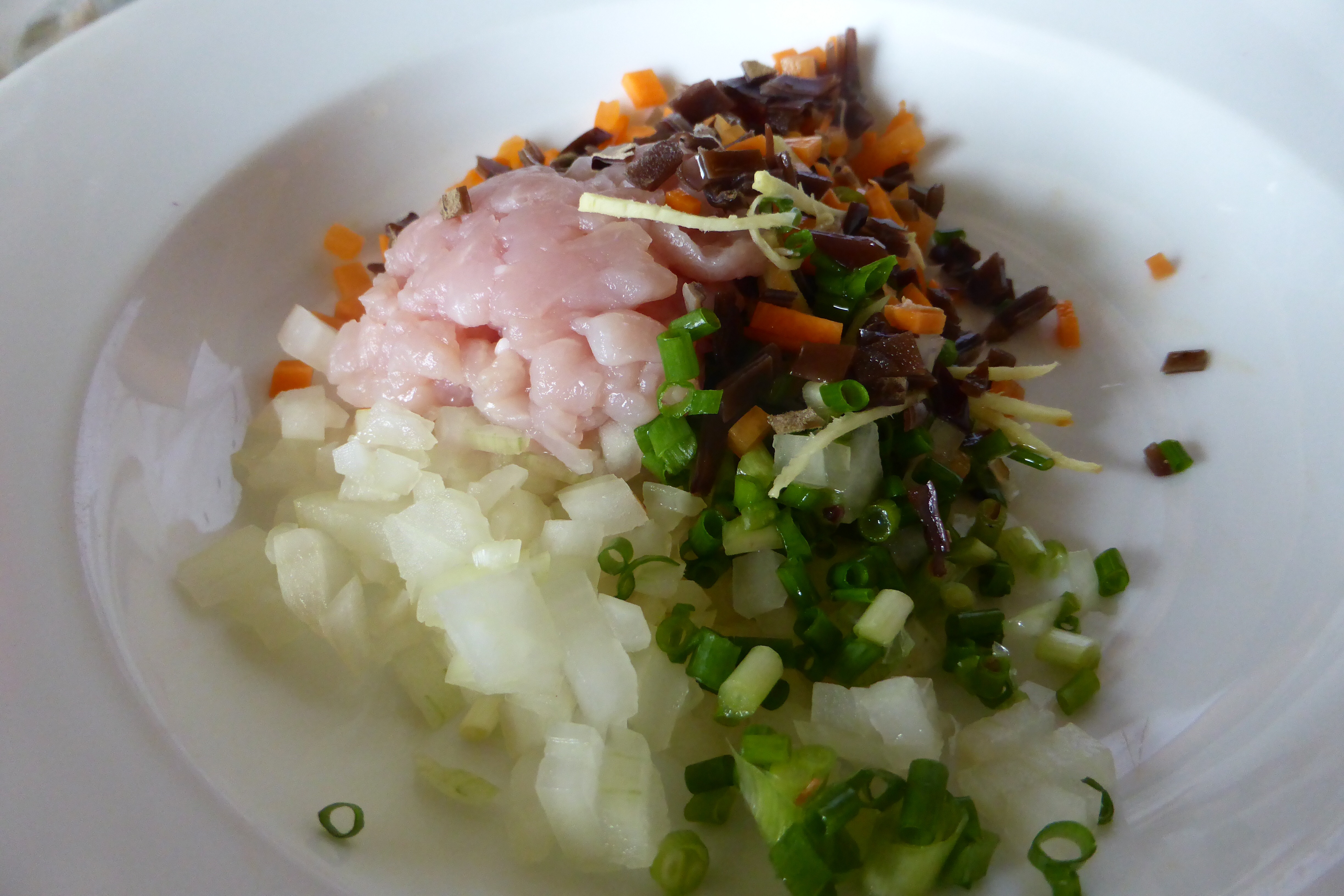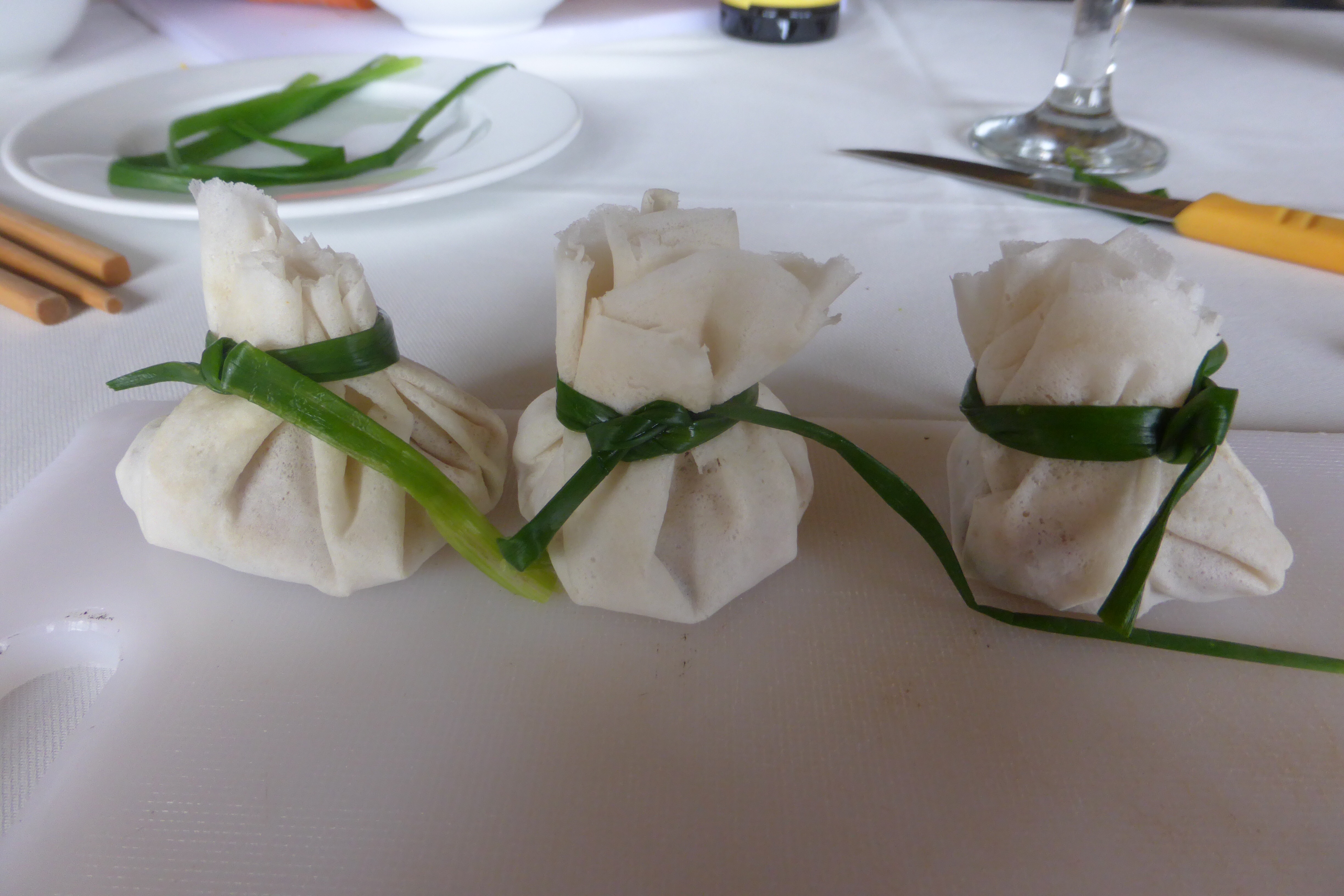 The money bags were quite easy to make – stir frying an assortment of chopped ingredients, wrapping the mixture in wonton skins, and tying them up with a knotted spring onion. They were deep fried in the kitchen and we ate them with plum sauce.