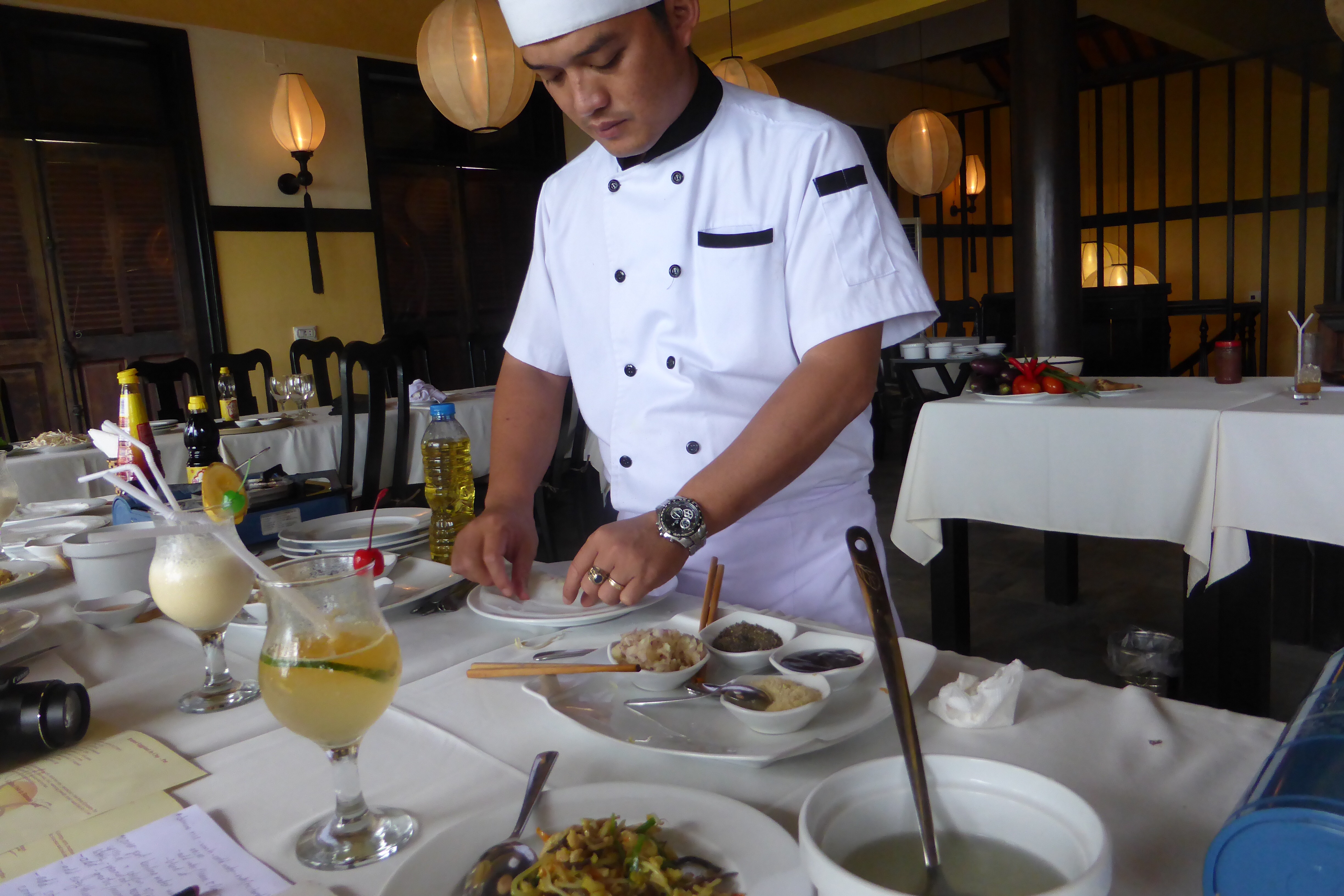 The cooking class with chef Viet at Dao Tien River Restaurant followed our visit with him to the produce market. Viet took us step by step through making fresh spring rolls, money bags, braised eggplant in a clay pot, and grilled fish in banana leaves. The spring rolls were my favourite. I’ve been eating them everywhere and absolutely love them. In fact, I’ve almost convinced myself I will be able to make them at home – only time will tell. The part I am most intrigued by is using a steamer to make the soft rice paper from a slurry of rice powder and water. My roll looked pretty good and tasted even better.
