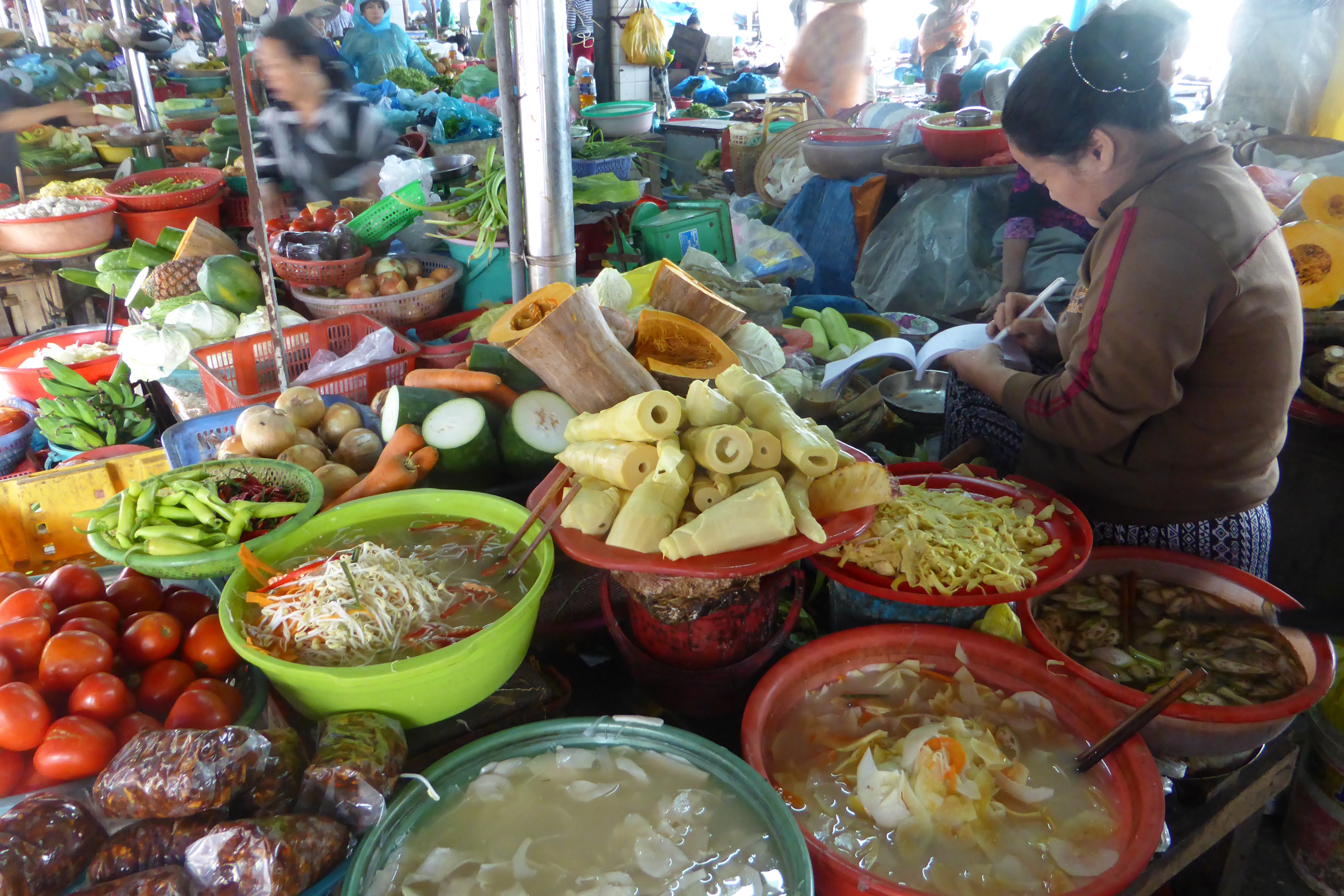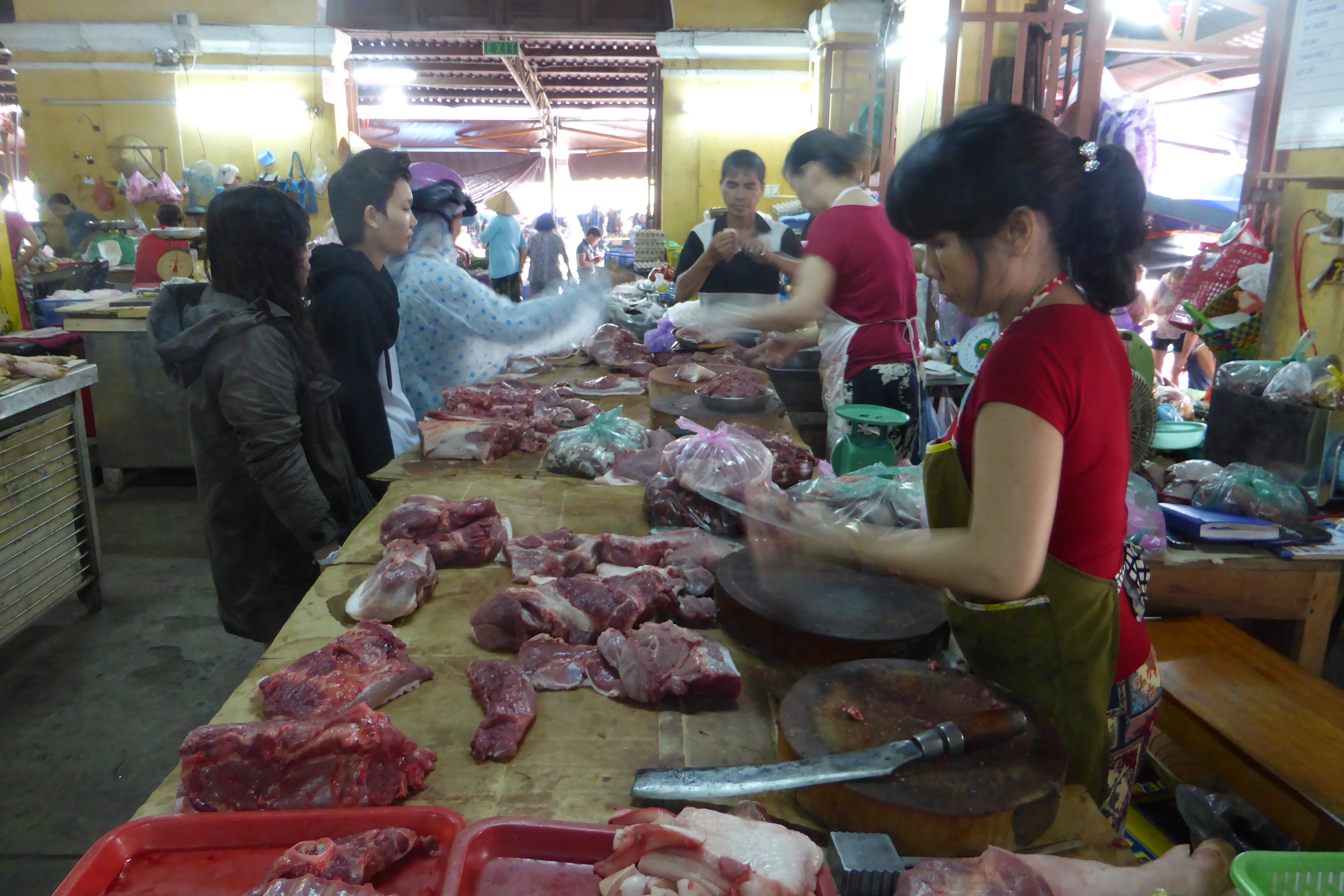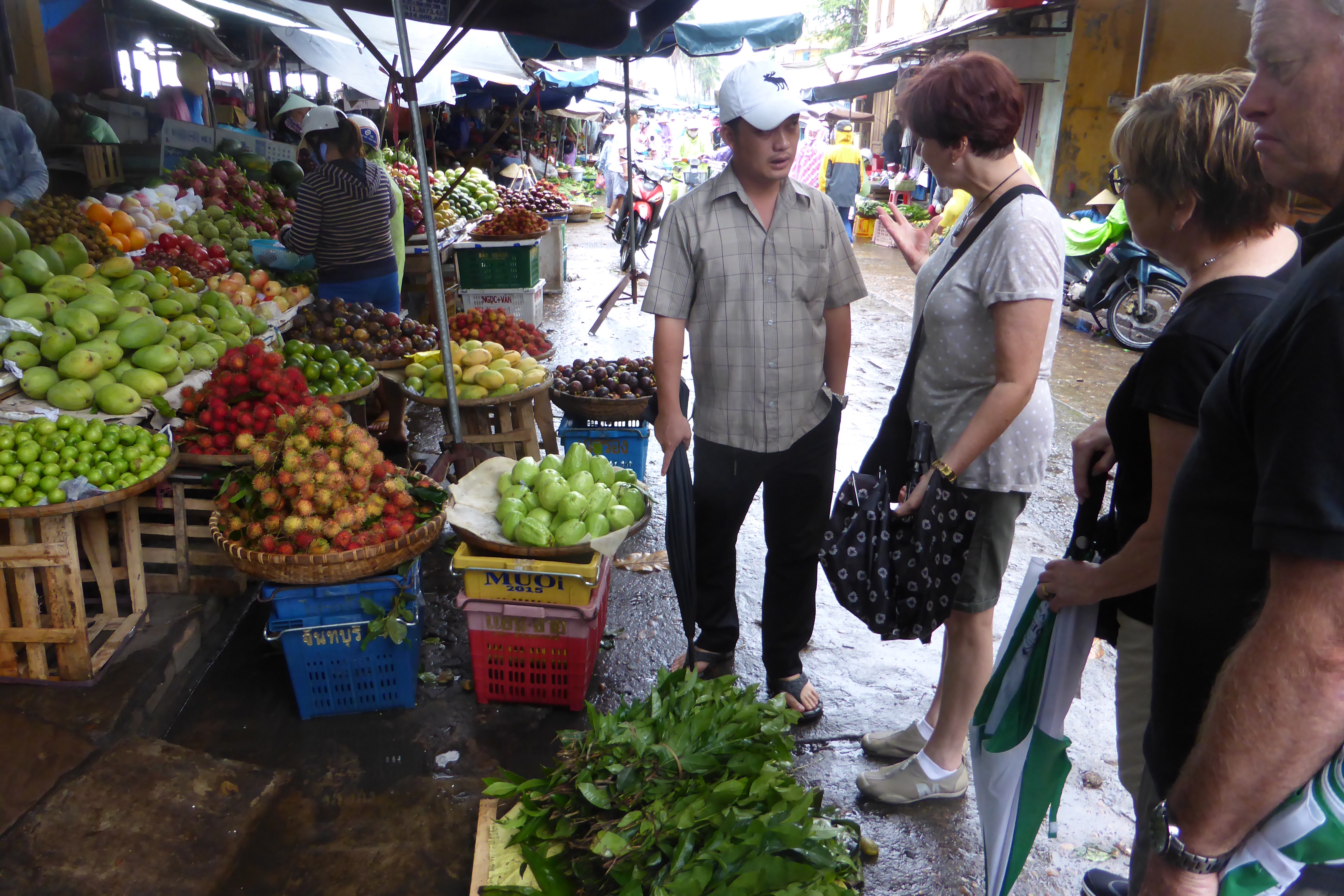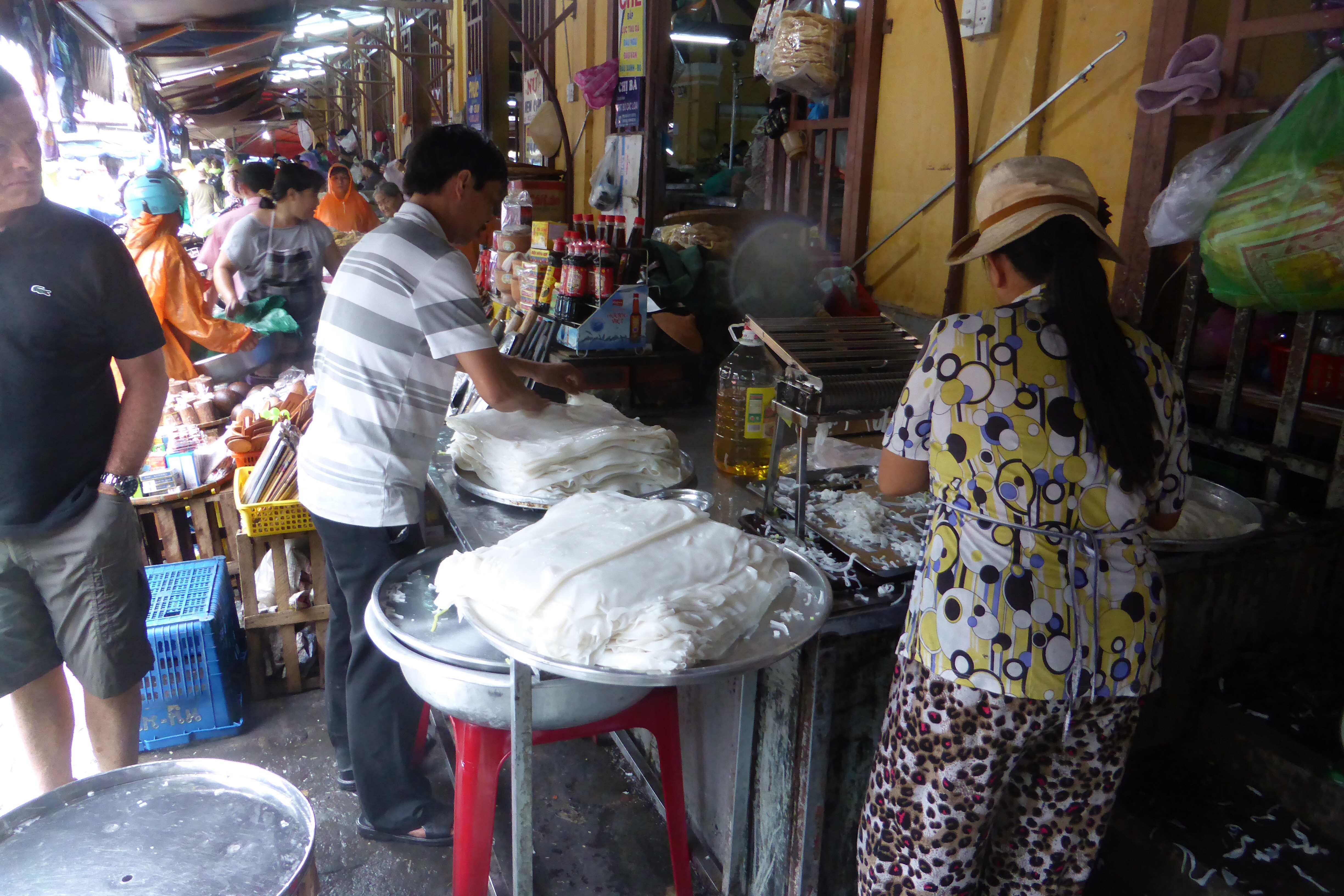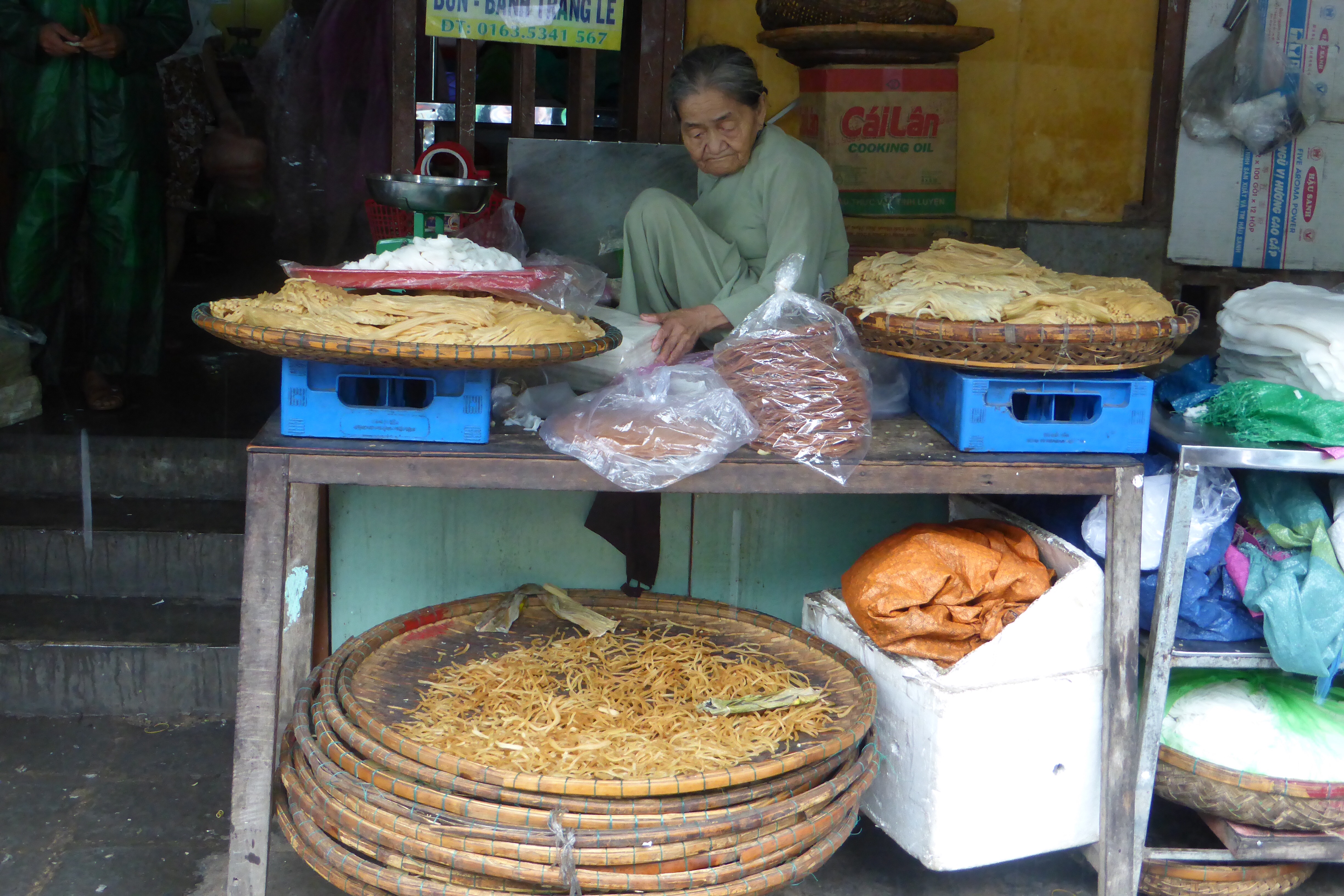 We arrived at a restaurant on the river’s edge for a cooking class. The chef, Viet, had first planned a visit to Hoi An’s produce market so we could learn a little more about all of the ingredients we were going to cook with. We had wandered through parts of this market with Trieu on the previous day, but it was a far more educational experience to visit the market in the company of a Vietnamese chef. As we passed different fruits and vegetables we stopped to feel and smell them, while Viet explained how they were grown and used in cooking. We learned how noodles were made and how different spices and sauces were used in his dishes. It was an enlightening hour and has certainly allowed us to discuss the foods we’ve been eating with a little more authority than we previously could.