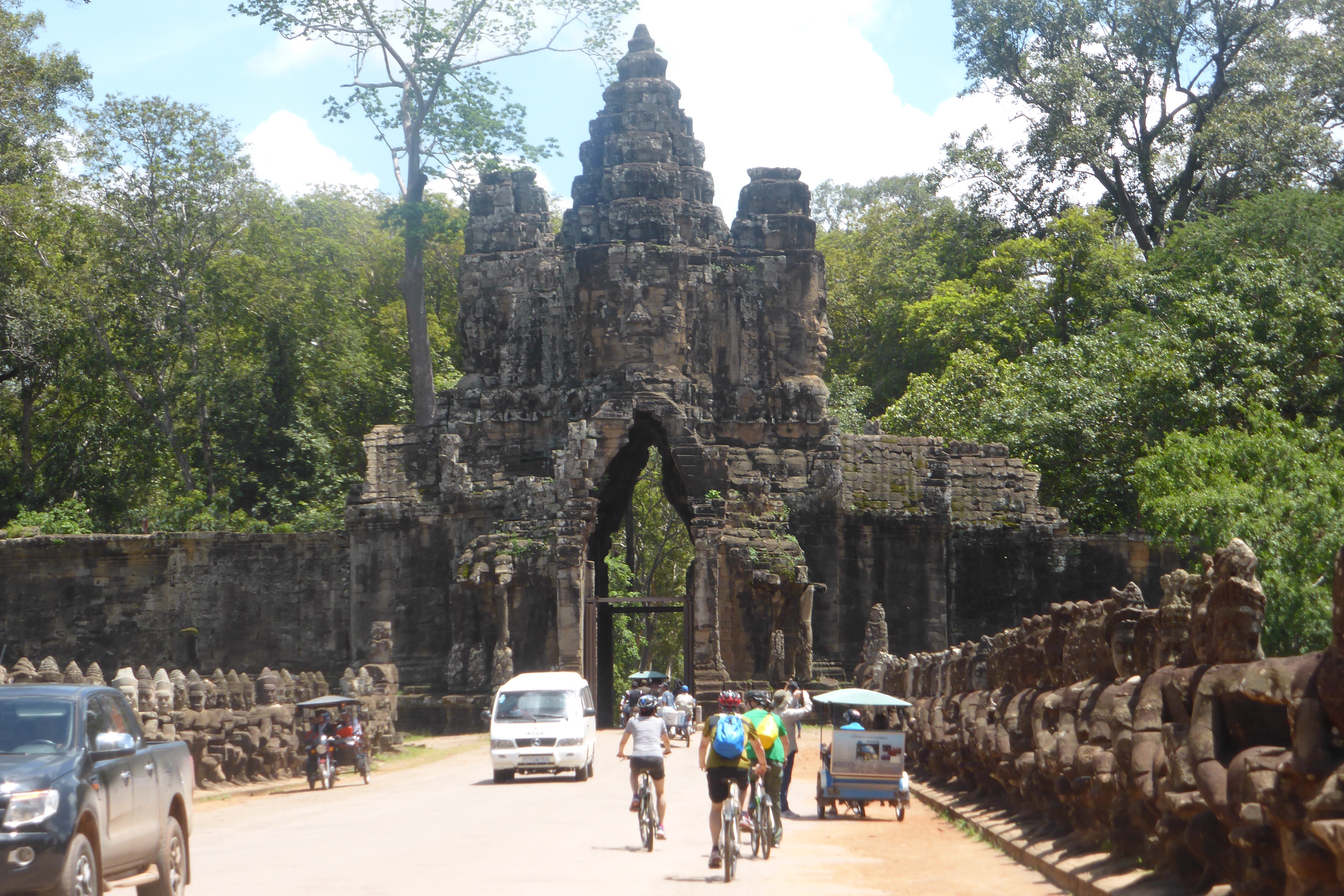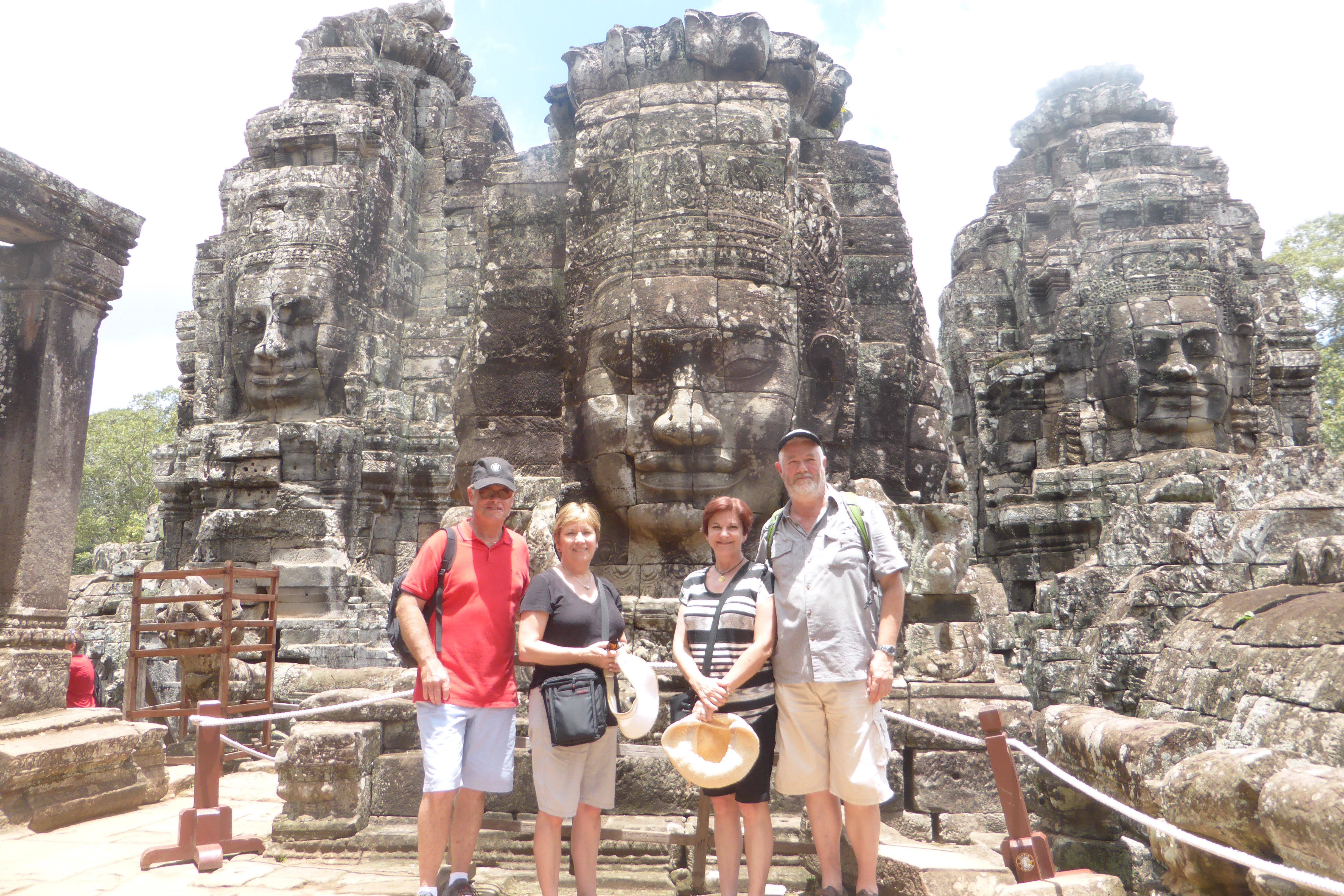 Angkor Thom was once a maginificent walled city, surrounded by a huge moat. There are large gates on each of the four walls. Each gate bears the face of Buddha facing in the four directions of the compass and each gate is large enough for an army to pass through on elephants’ backs. Today, tourists ride elephants across the bridge over the moat, through the entrance gate and on to the Bayon temple. Between the gate and the temple, a troop of playful macaque monkeys distracted us for a few minutes.