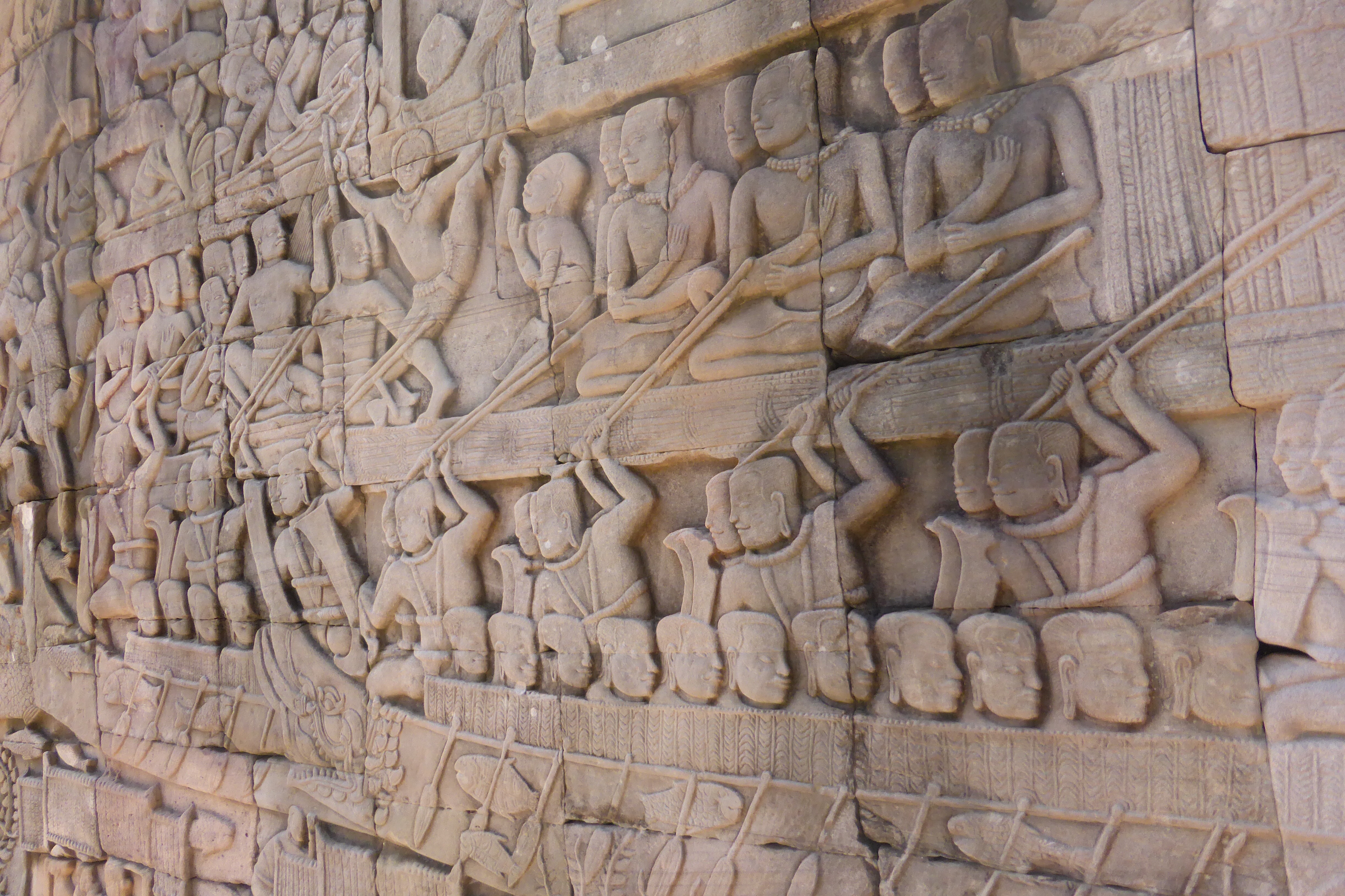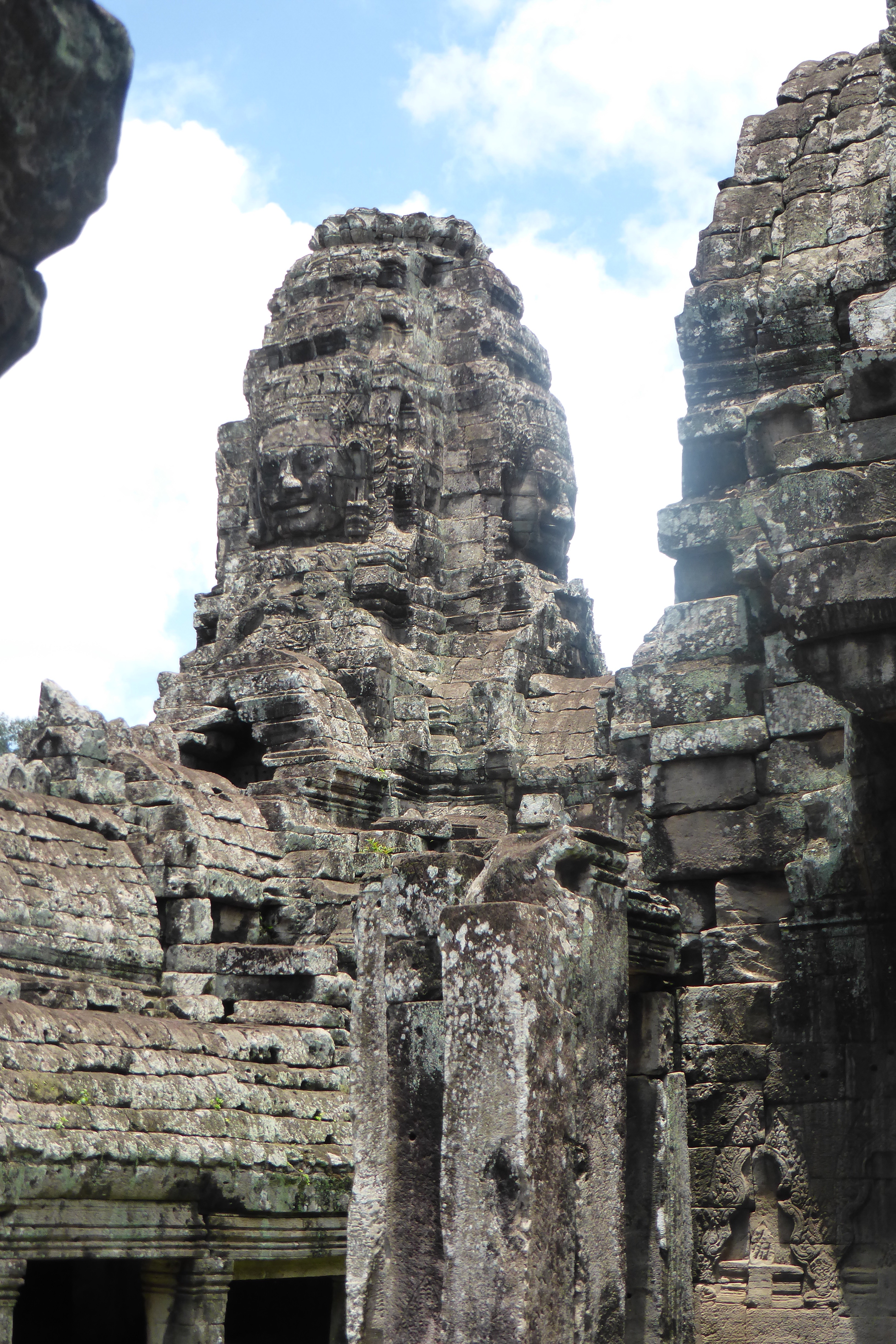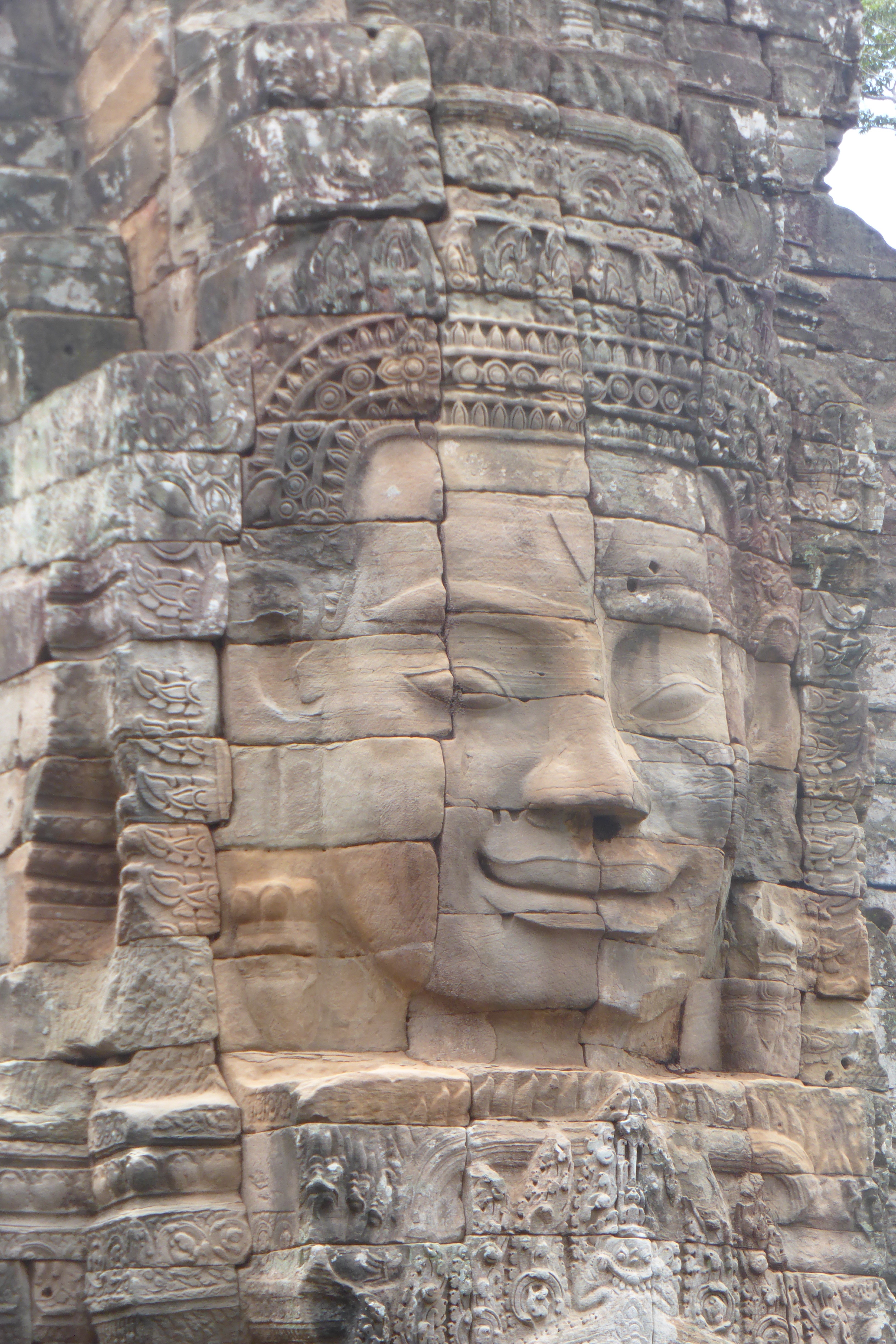 The Bayon is quite exceptional. It has three levels, featuring 54 towers. On these towers, the smiling face of Buddha looks out over the forest in all four directions – a total of 216 throughout the temple complex. Around the walls are beautiful bas-relief carvings telling the story of epic battles, as well as depicting scenes of the everyday life of the Khmer people. At some point in history, Hindus used the temple. They chiselled the third eye on each Buddha face, so that it now became the face of the Hindu god Shiva and it was to this god that they dedicated the temple.