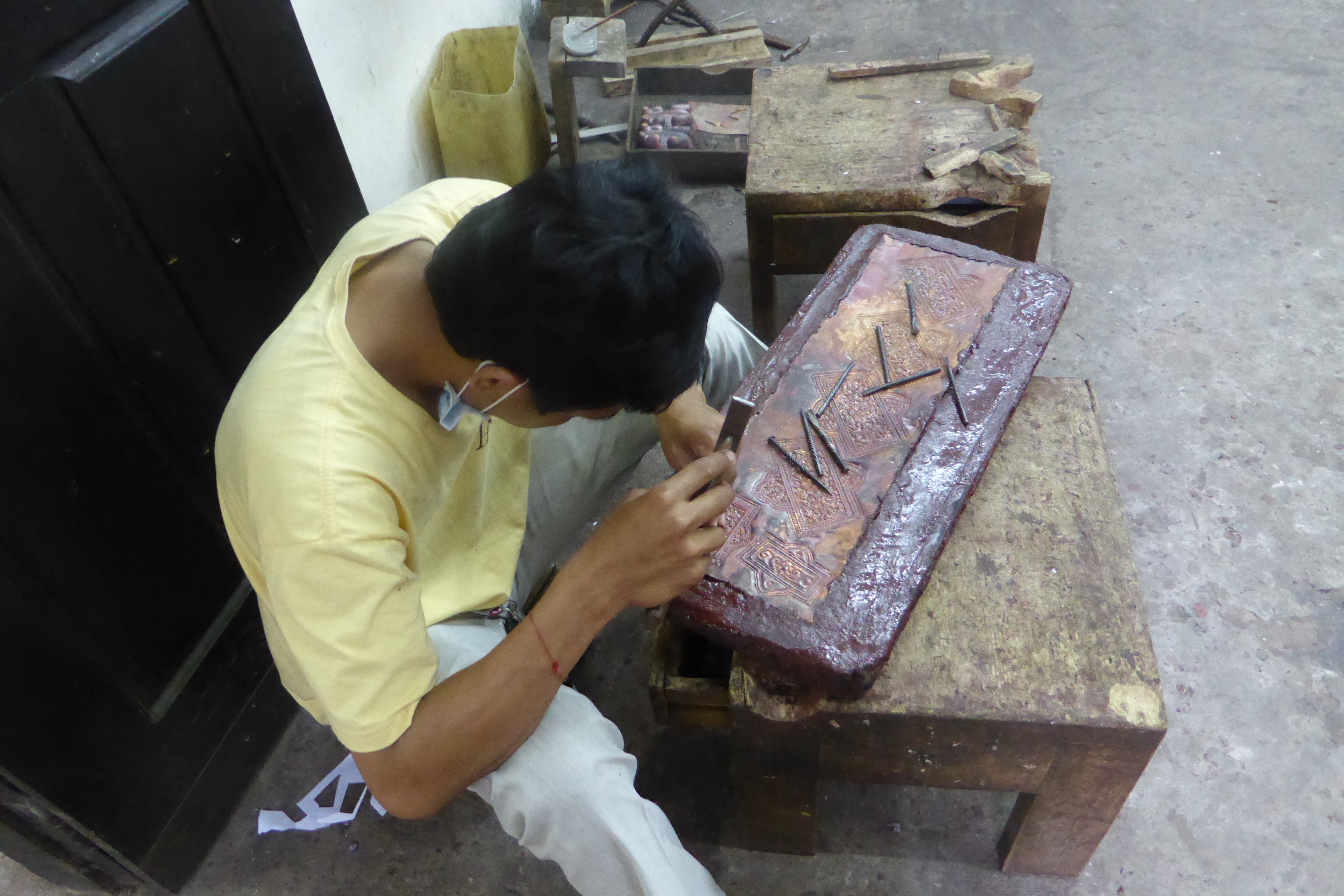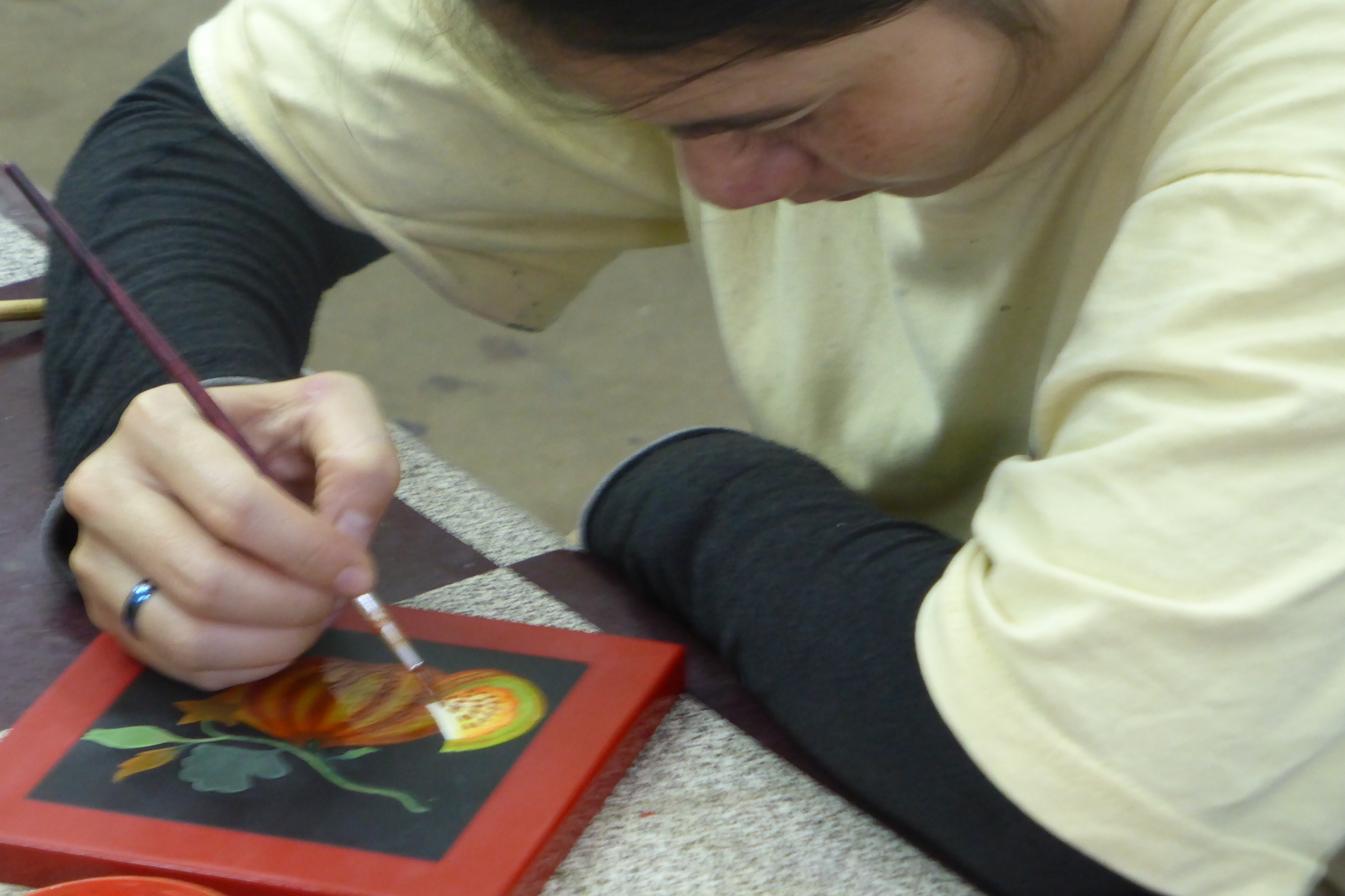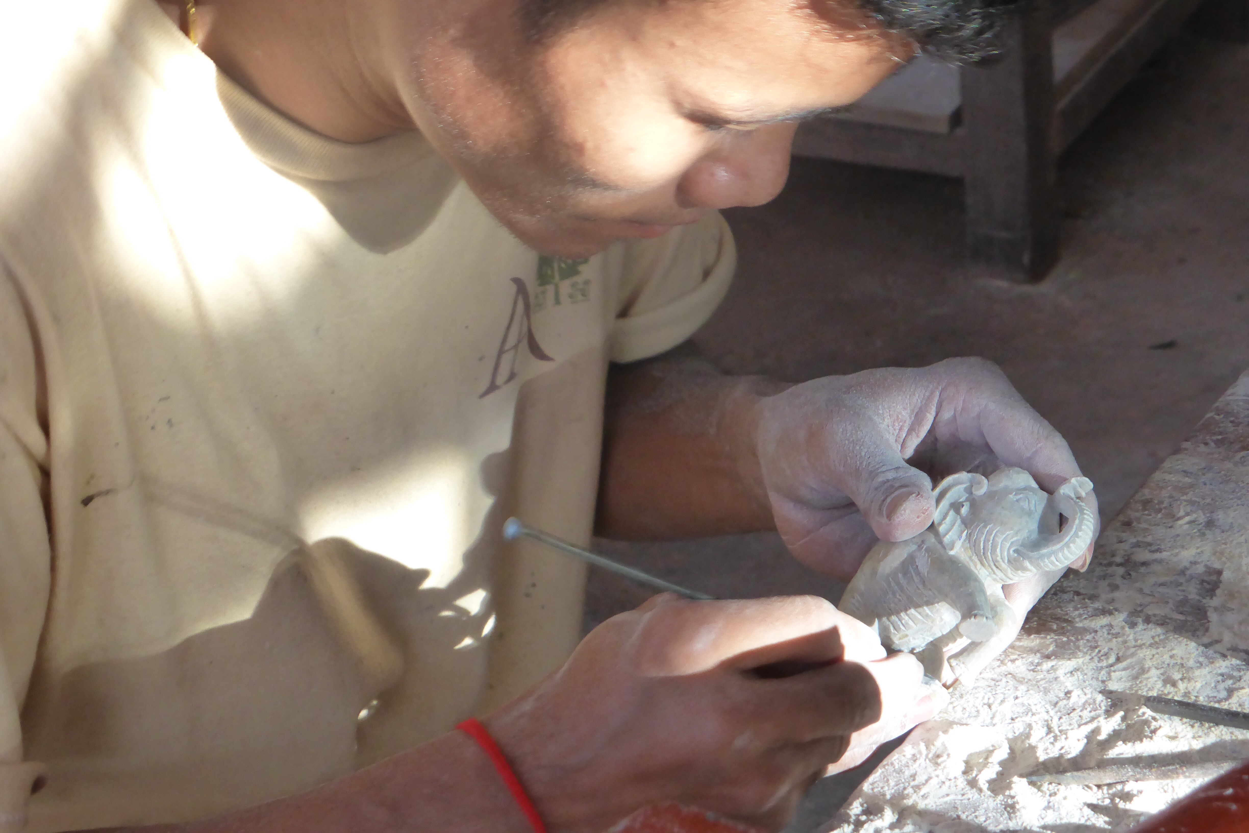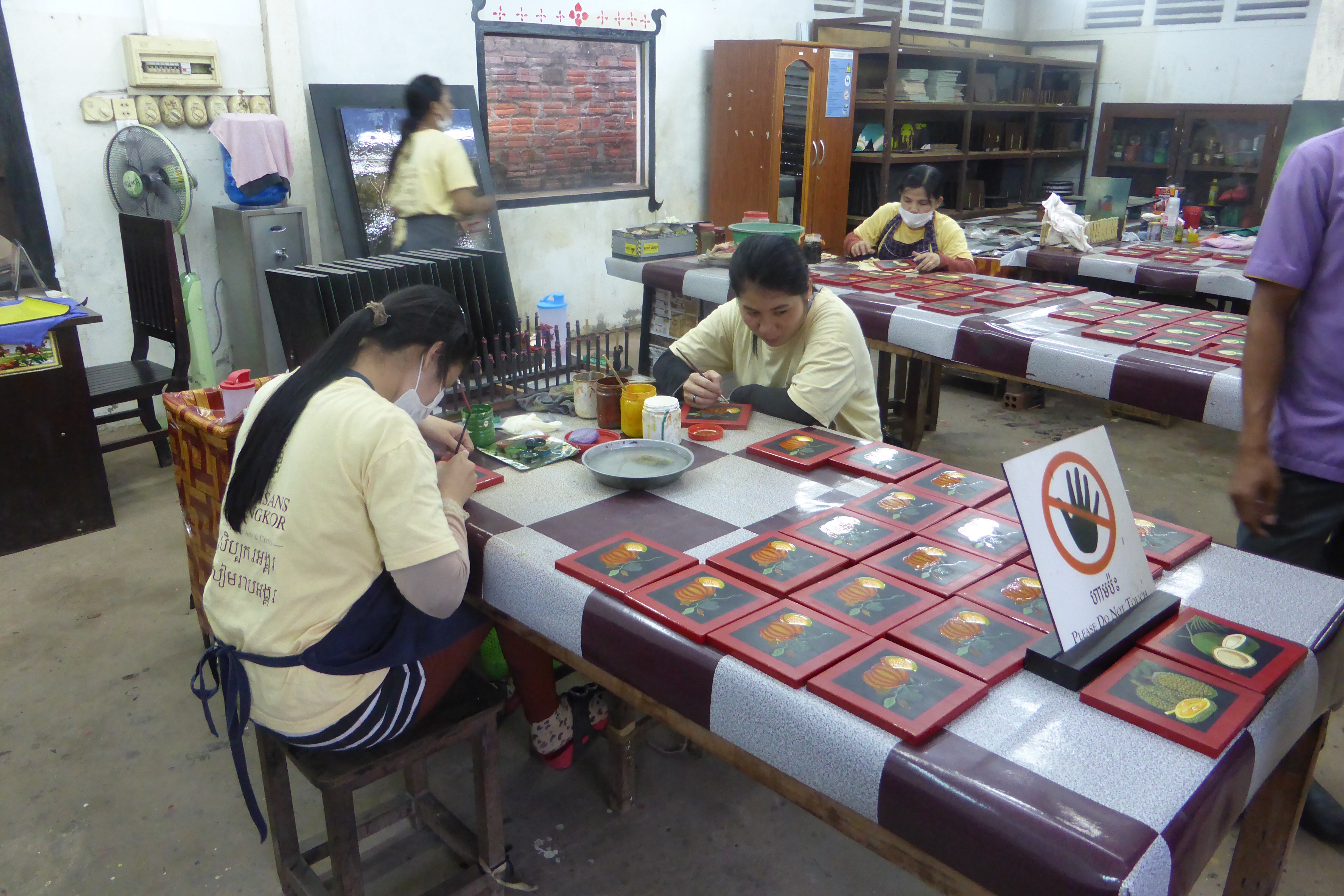 We arrived late at Artisans of Angkor at the end of a long, hot day exploring the Angkor temples. Many of the artisans had packed up and left for the day, but we were able to get a quick tour through the workshops and see a few of them still working. This business has trained people from nearby villages in traditional Khmer crafts which include painting, lacquer work, wood and stone carving and metalwork. The products they create are quite beautiful and all of the work is of a high quality. Workers in the painting workshops are hearing and speech disabled. Large posters on the workshop walls contain images of the sign language they communicate with.