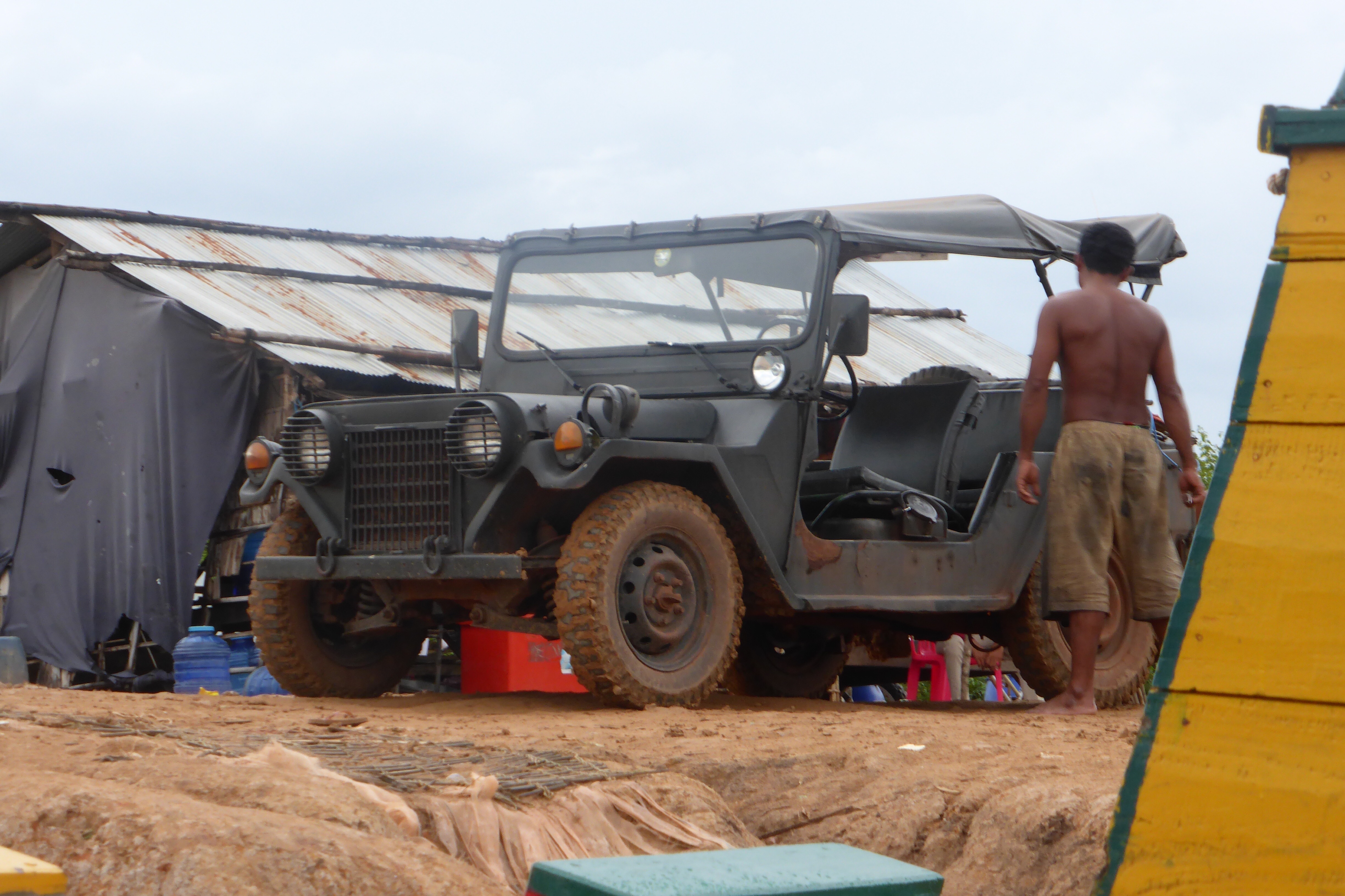 Vanny left the main road and headed down a track past some villages. As he drove, the road got rougher and rougher. The rain began and soon it was very heavy. Ian was perched in the back seat, getting drenched to the skin. The road became a series of waterlogged potholes and slush, and it soon became obvious why Vanny and Sam had brought the Jeep. It bumped and churned its way from one boggy mudhole to the next as we left the villages behind and headed down the long road. To our left was a channel, which soon became a stream.