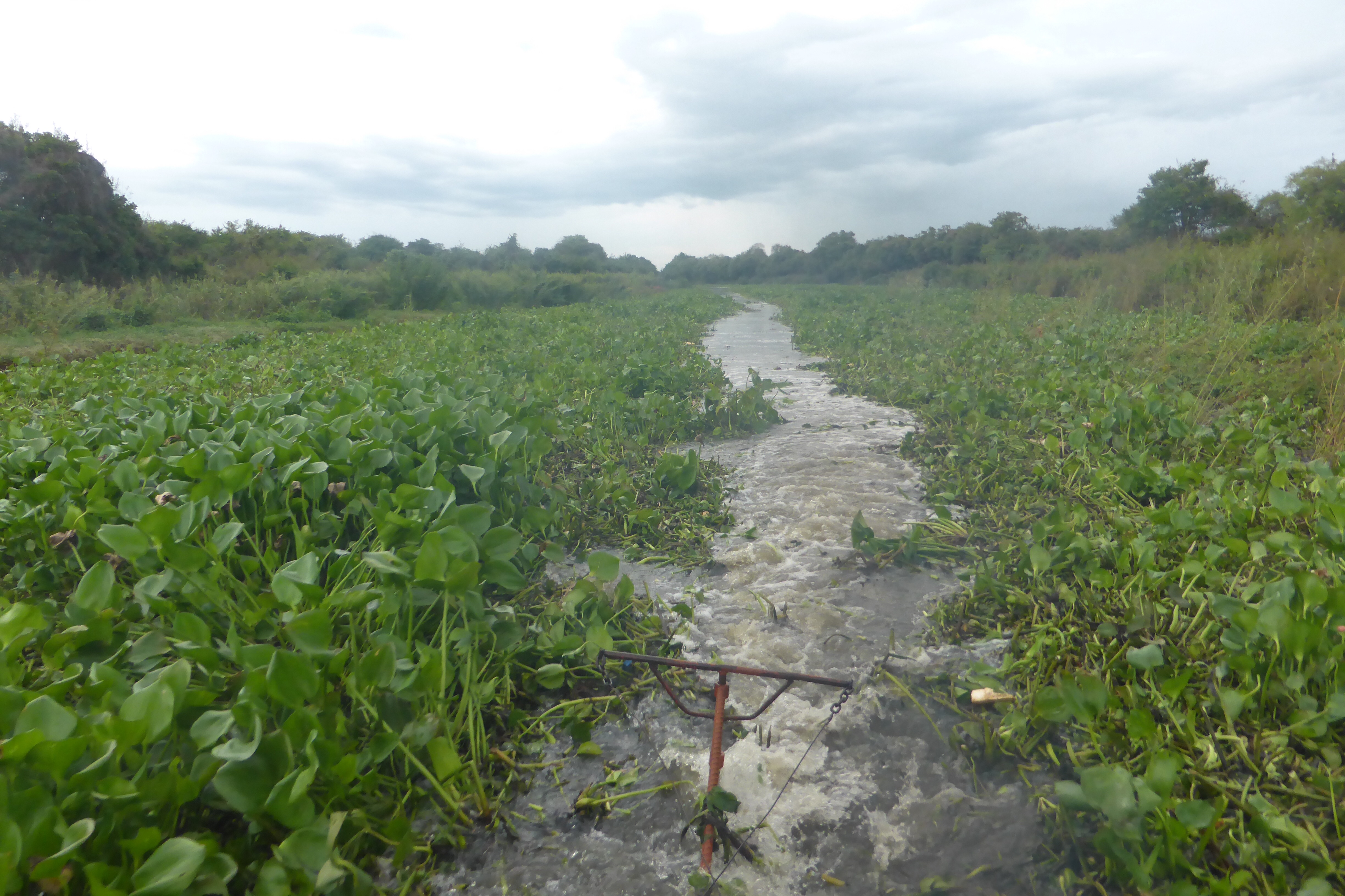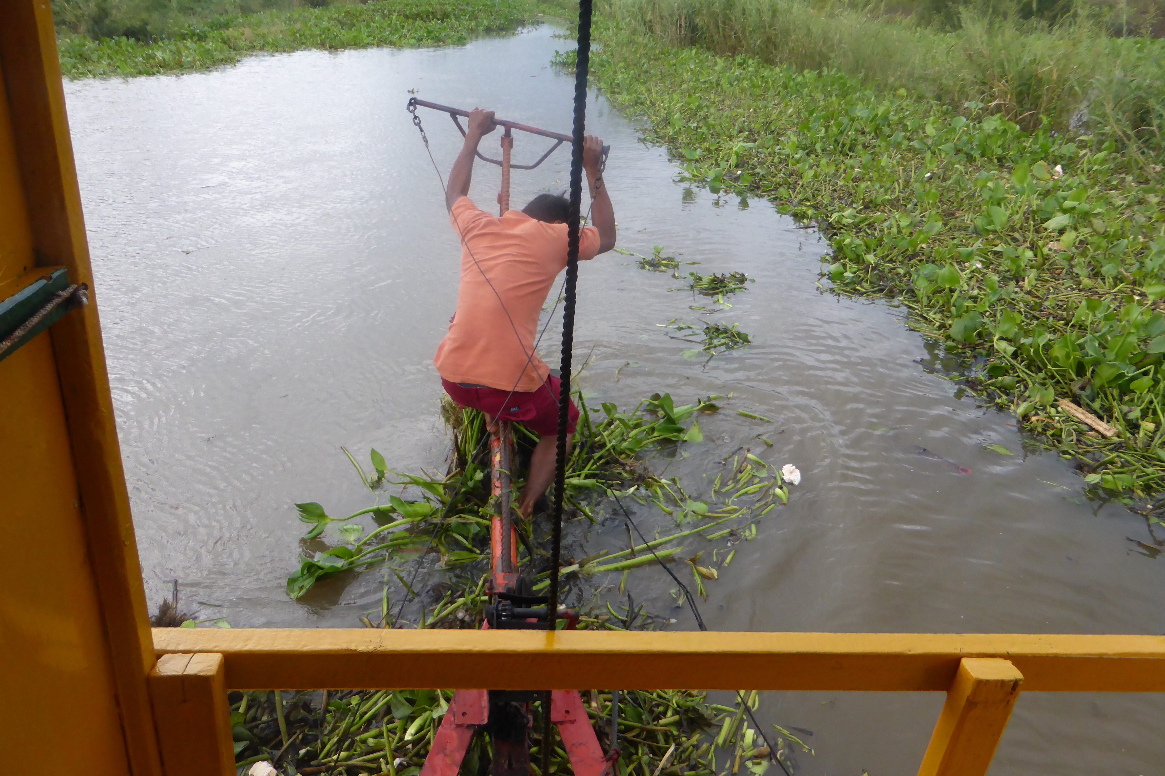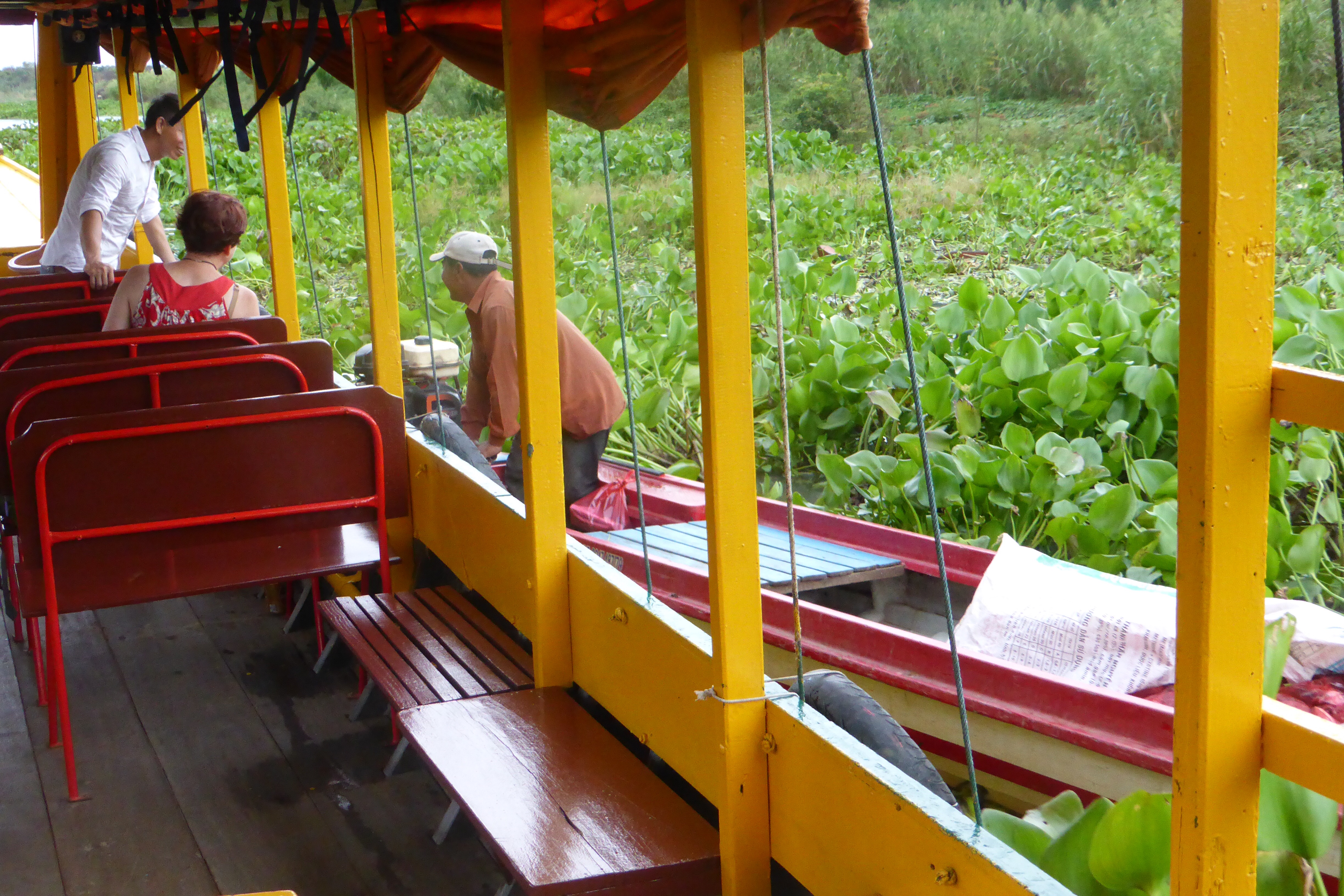 We boarded a boat and headed down the narrow channel. Before long, it was choked with water hyacinth. The boat ploughed through the floating plants, but the motor was labouring and black smoke was coming from the struggling engine. The boatman stopped the boat and went to the stern, where the propeller was hopelessly entangled with water hyacinth. He spent the next ten minutes removing the mess from the prop, even using a hacksaw and a tomahawk at one stage.