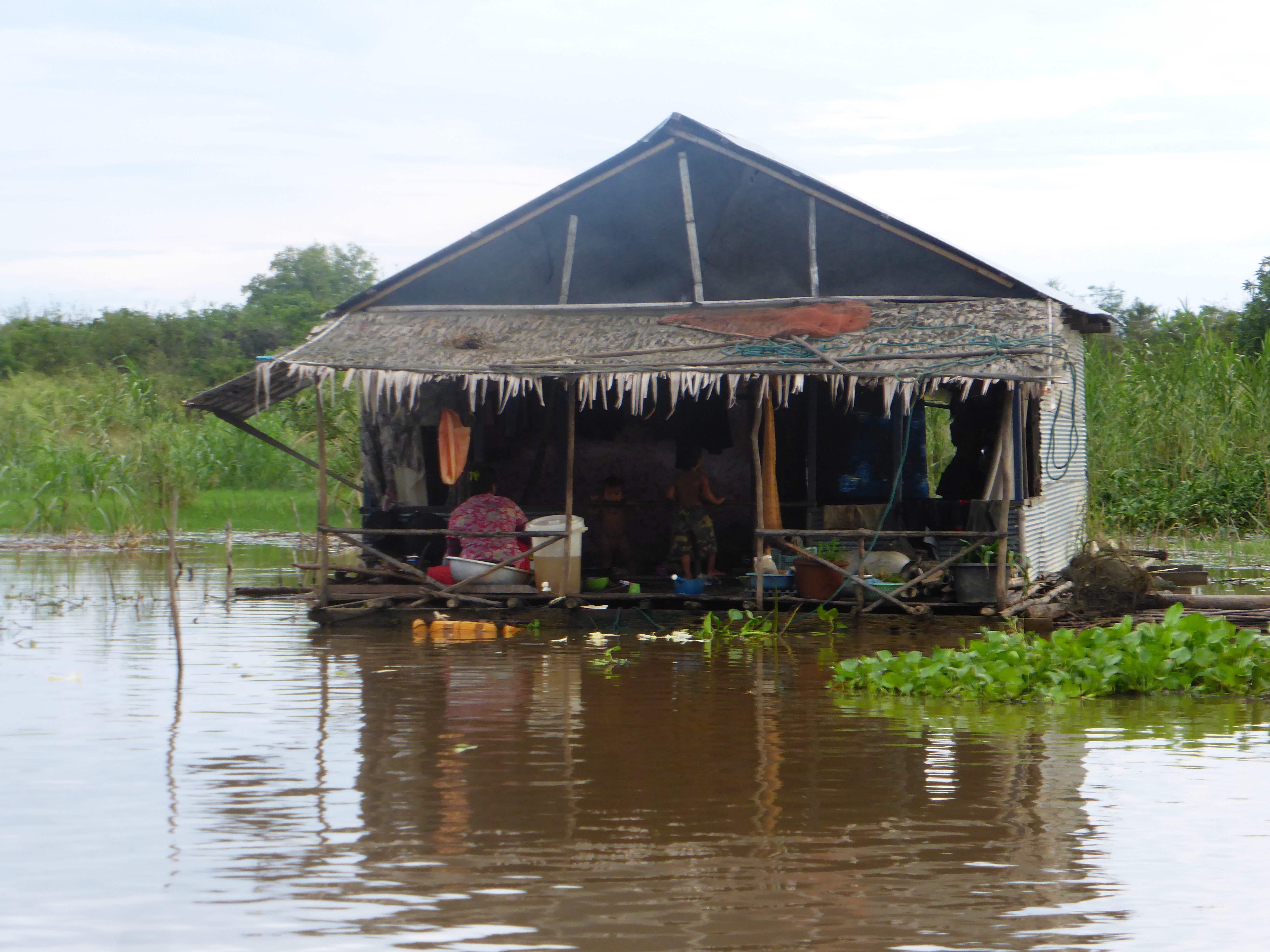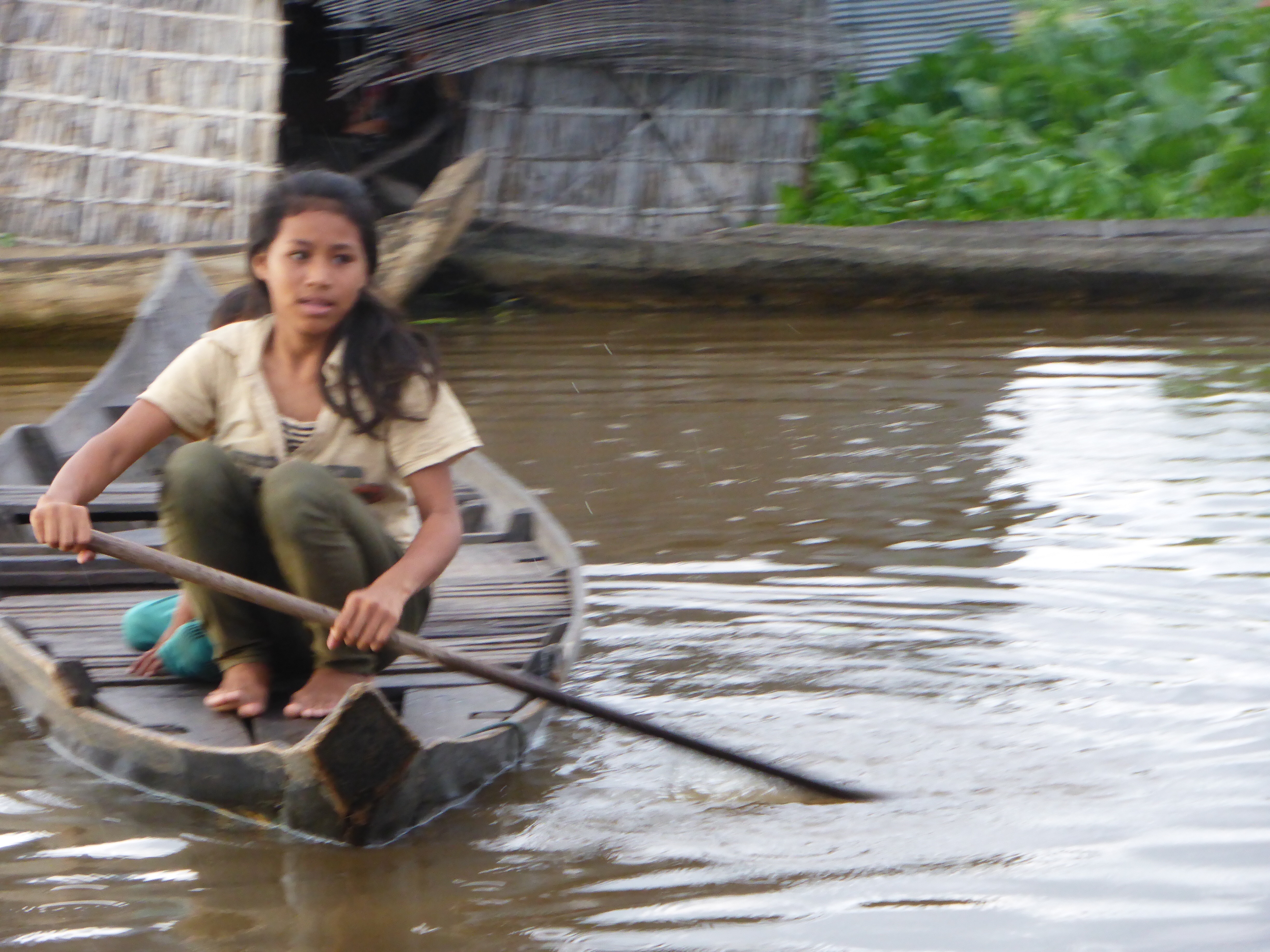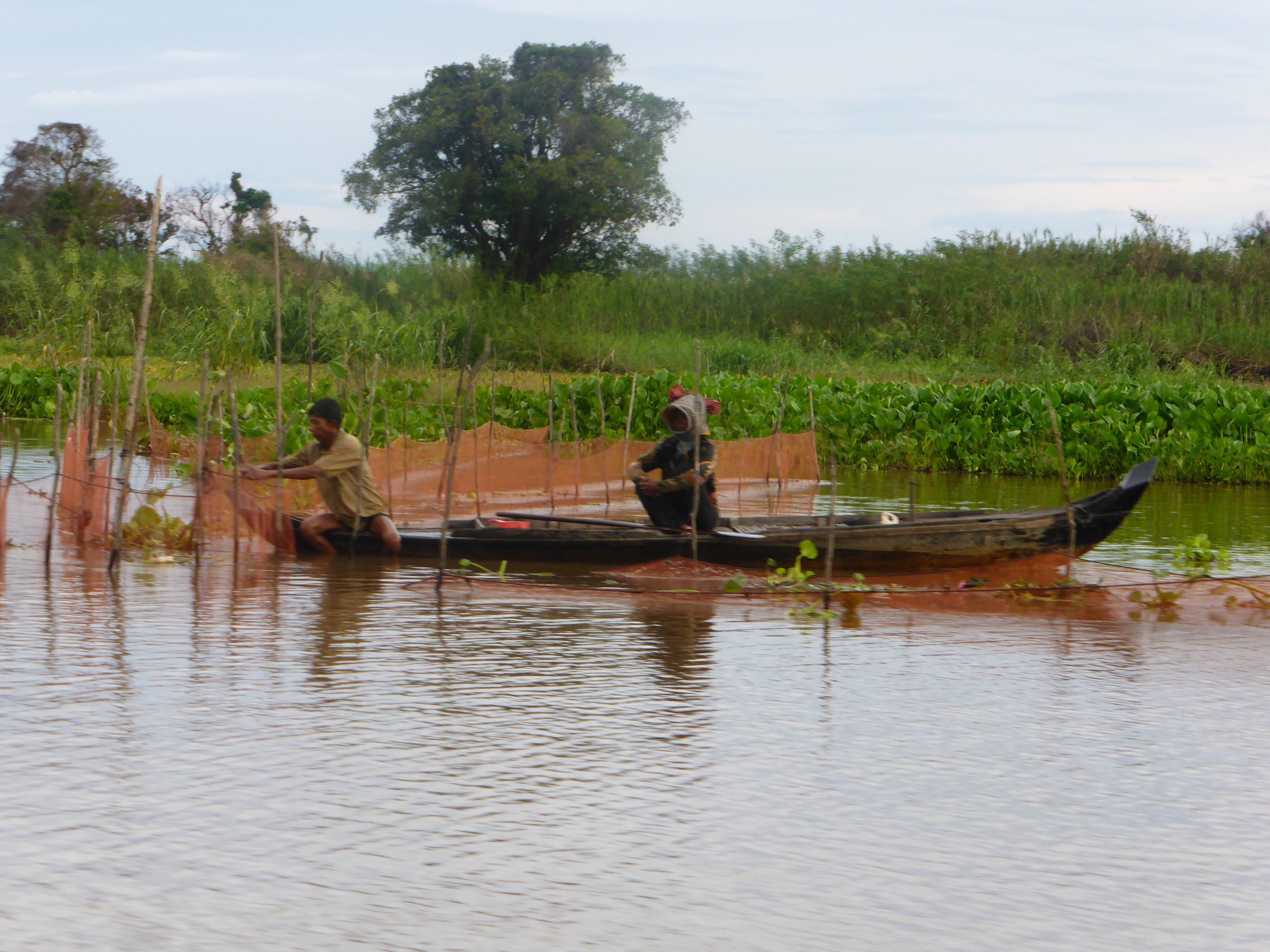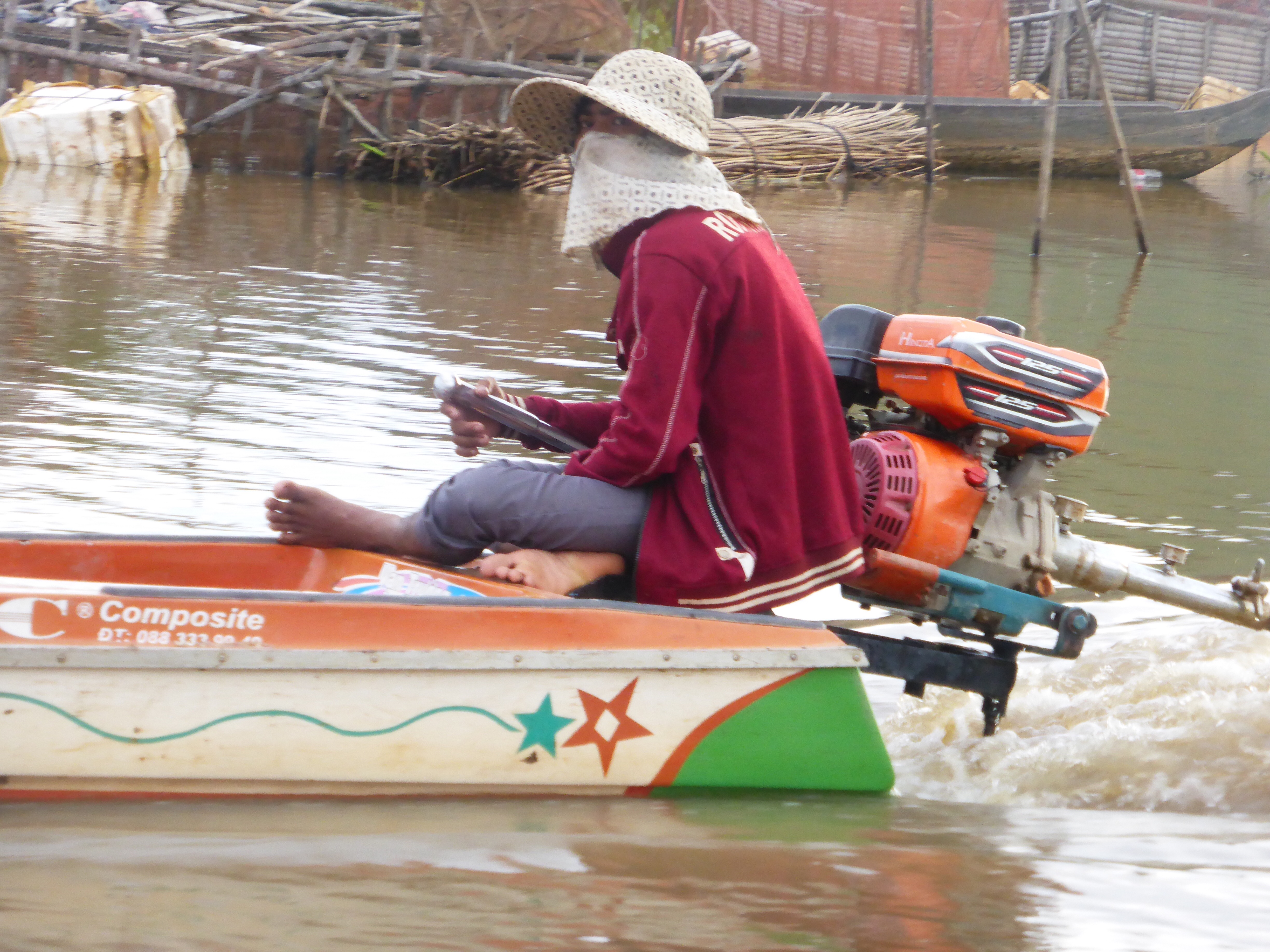 Eventually we were freed from the plants and as we motored down the stream it widened and we were in open waterway once again. Floating houses began to appear. There were people in them going about their business. Few paid us any attention. Some were tending their fishing nets, others minding small children. Boats passed us in both directions. This was the floating village of Mechrey. All residents of this village live on the water, moving their dwellings with the rise and fall of the water (Tonle Sap is an inland tidal system). We passed a floating school, a floating mechanic and several floating stores.