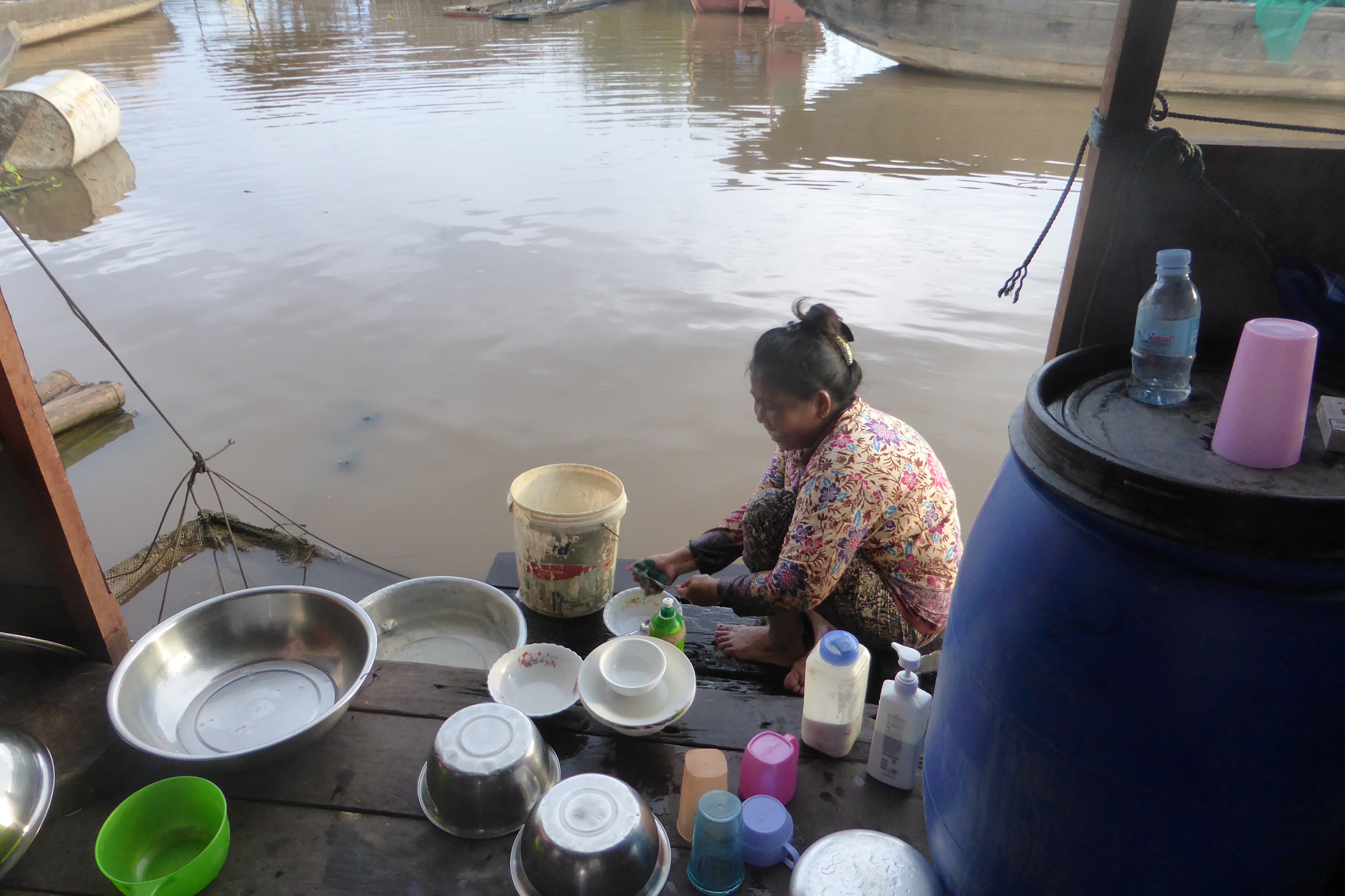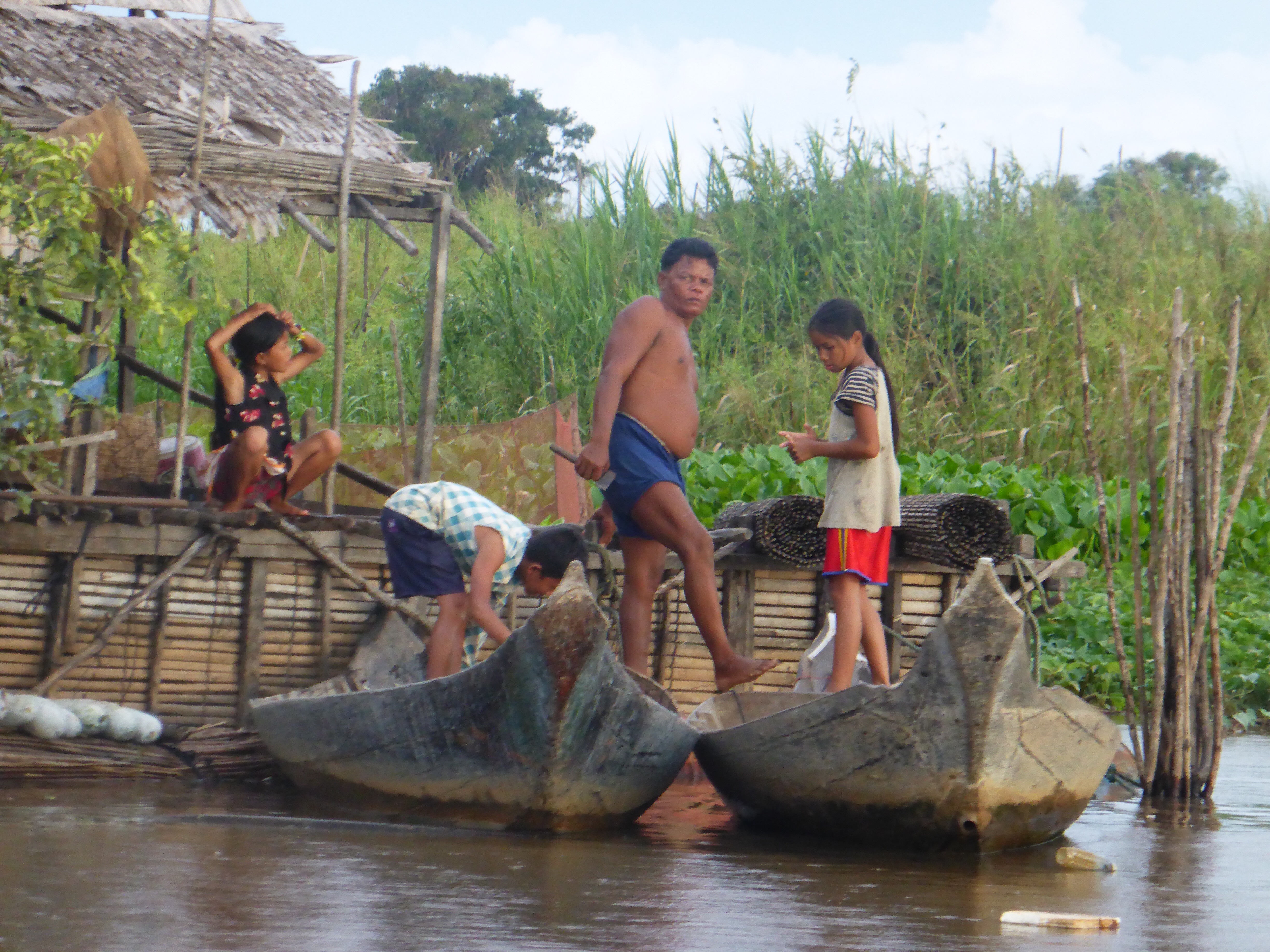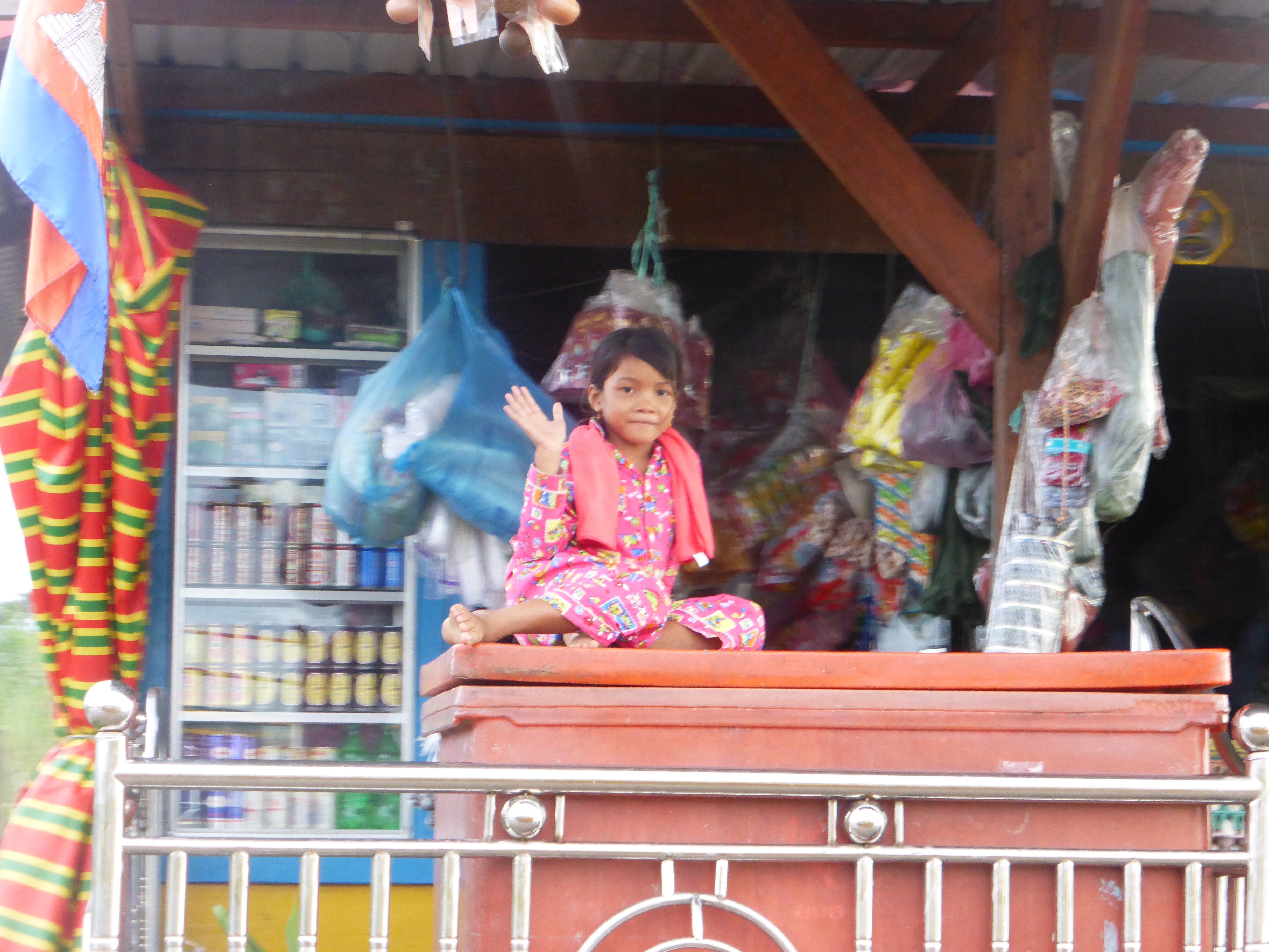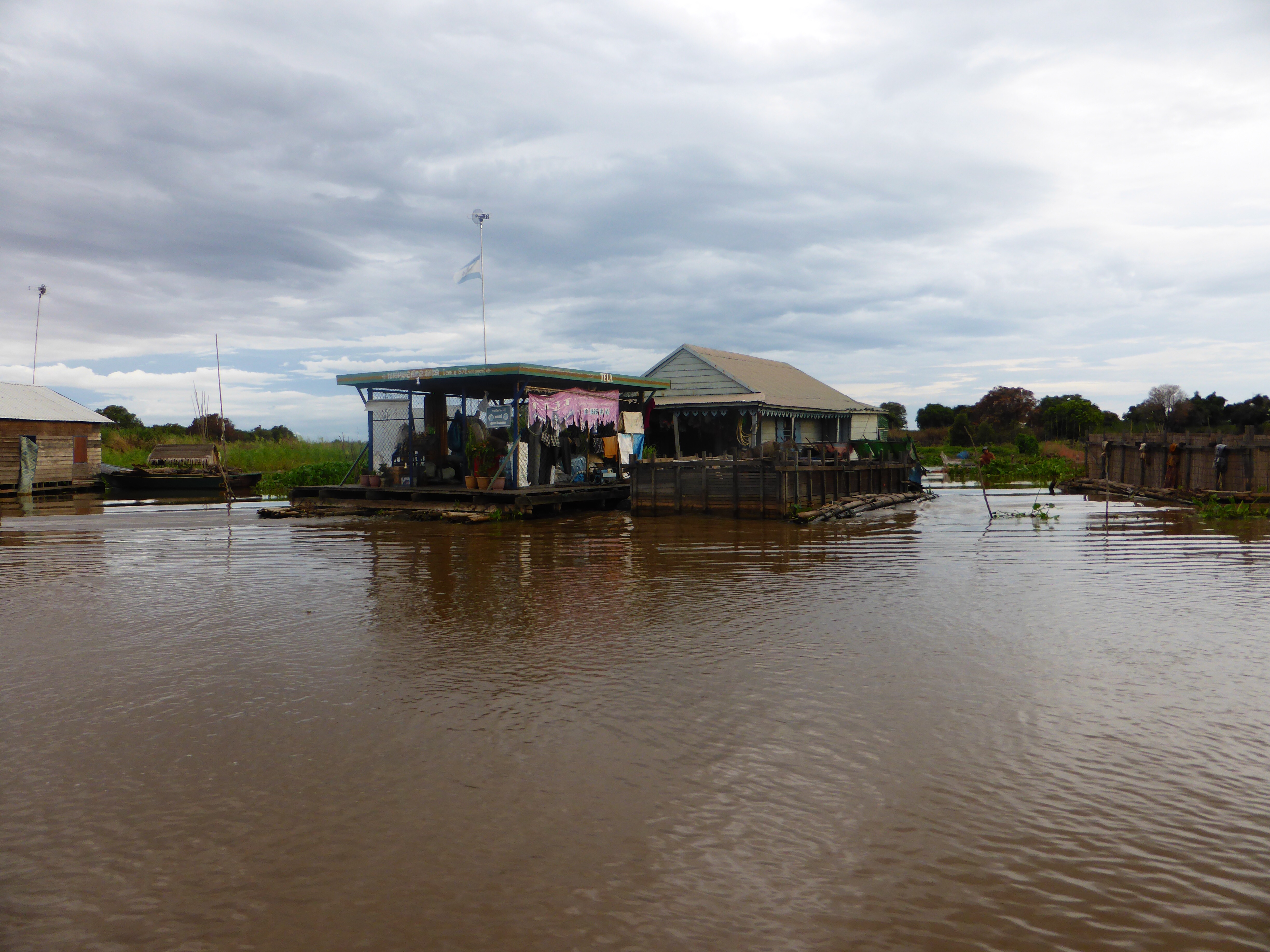 Eventually we were freed from the plants and as we motored down the stream it widened and we were in open waterway once again. Floating houses began to appear. There were people in them going about their business. Few paid us any attention. Some were tending their fishing nets, others minding small children. Boats passed us in both directions. This was the floating village of Mechrey. All residents of this village live on the water, moving their dwellings with the rise and fall of the water (Tonle Sap is an inland tidal system). We passed a floating school, a floating mechanic and several floating stores.