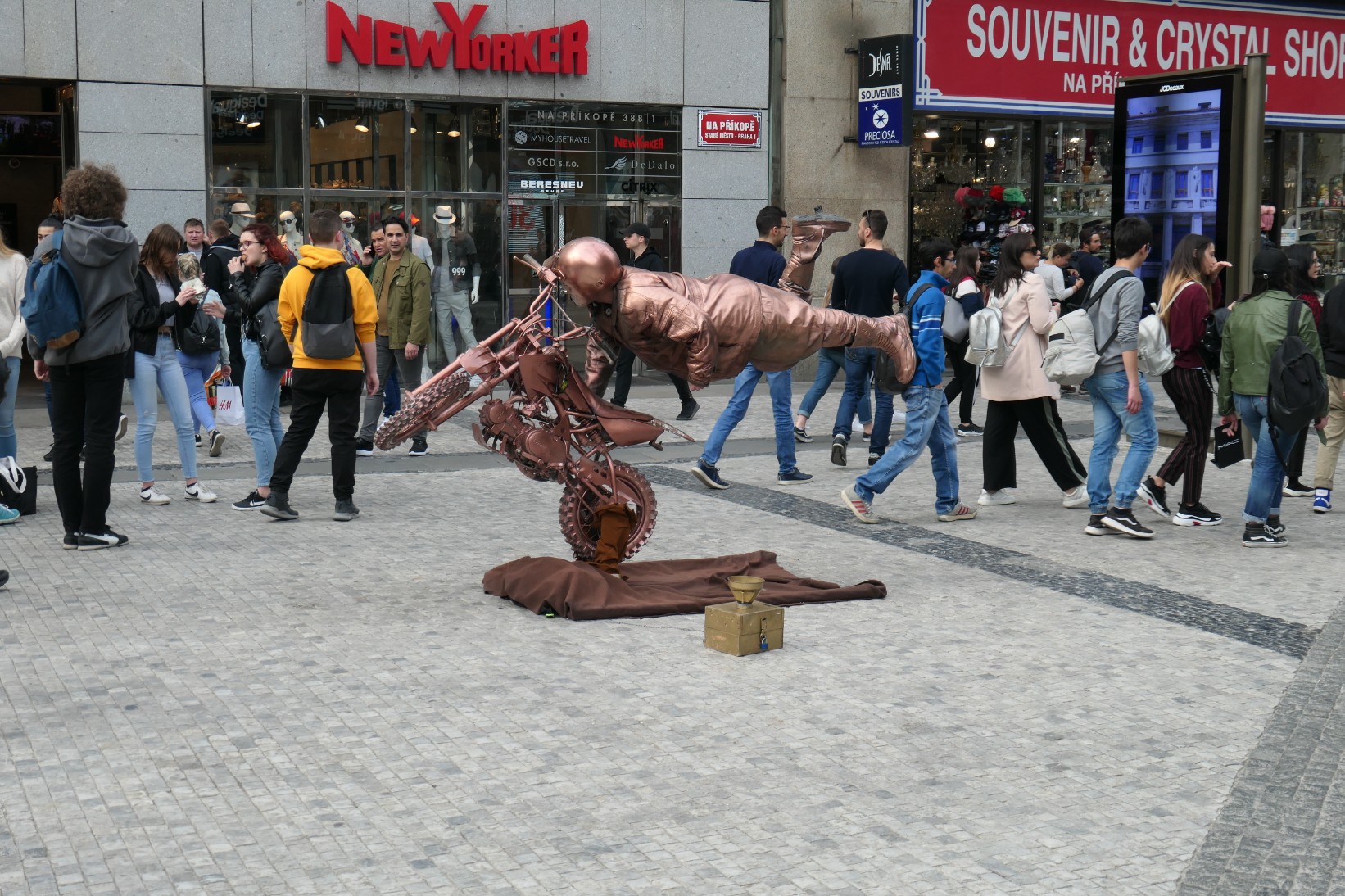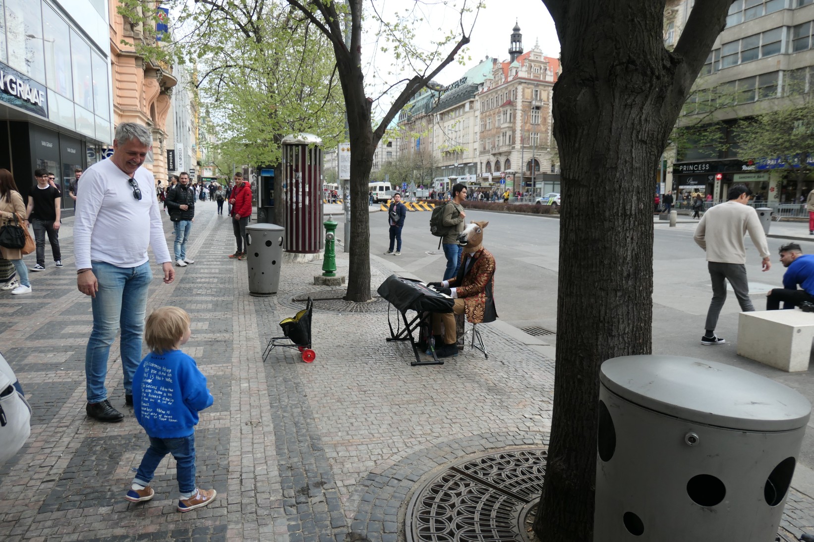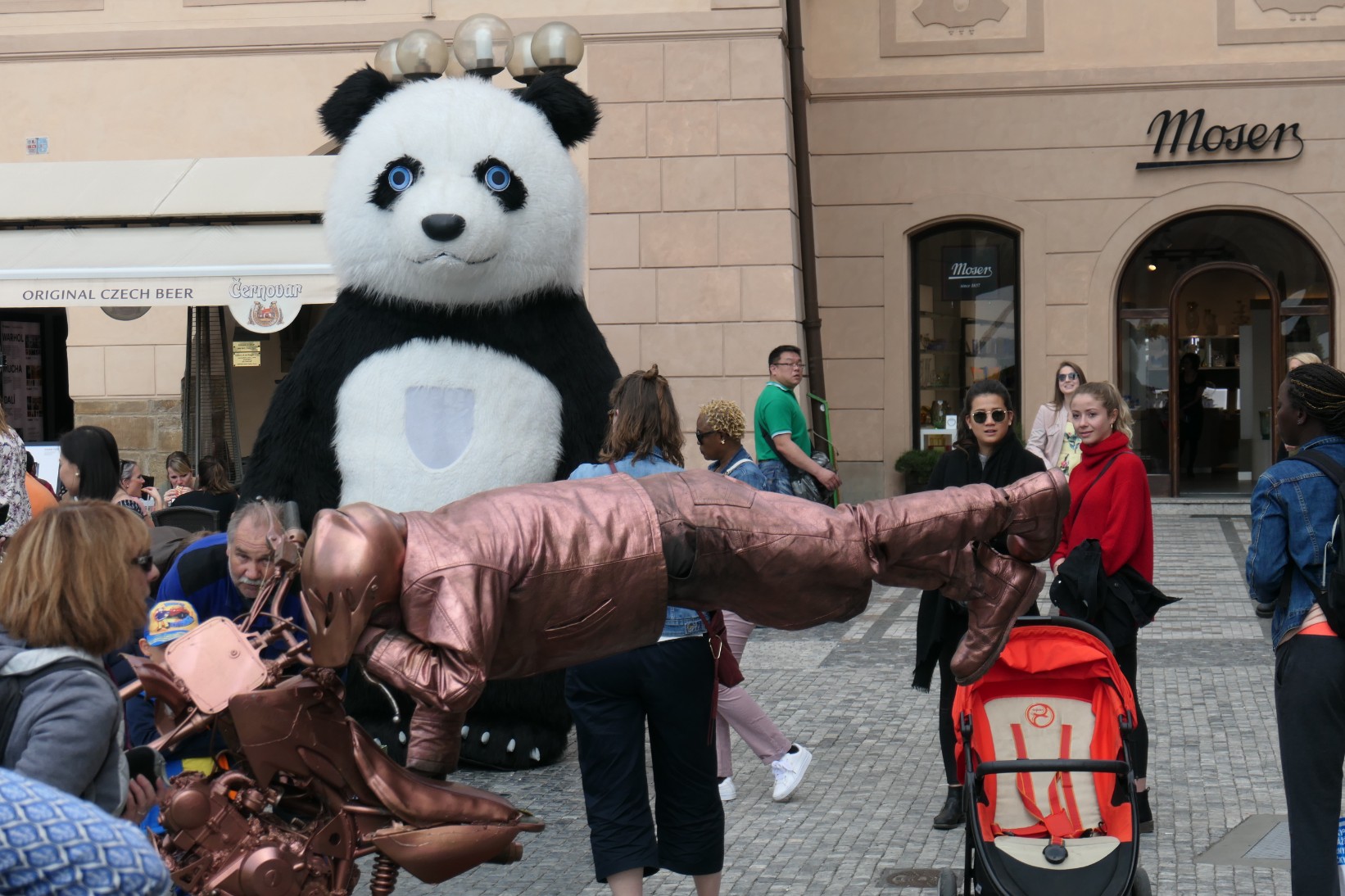Yesterday in the square we came across a large gorilla posing for photos with tourists. Today he’d been replaced by a giant panda … and a guy, appearing to be made out of copper, who seemed to be framed in time crashing his motorbike. The buskers in Prague are generally good fun, including the musician with the horse head, who throws his head back and neighs whenever a coin or two lands in his hat.