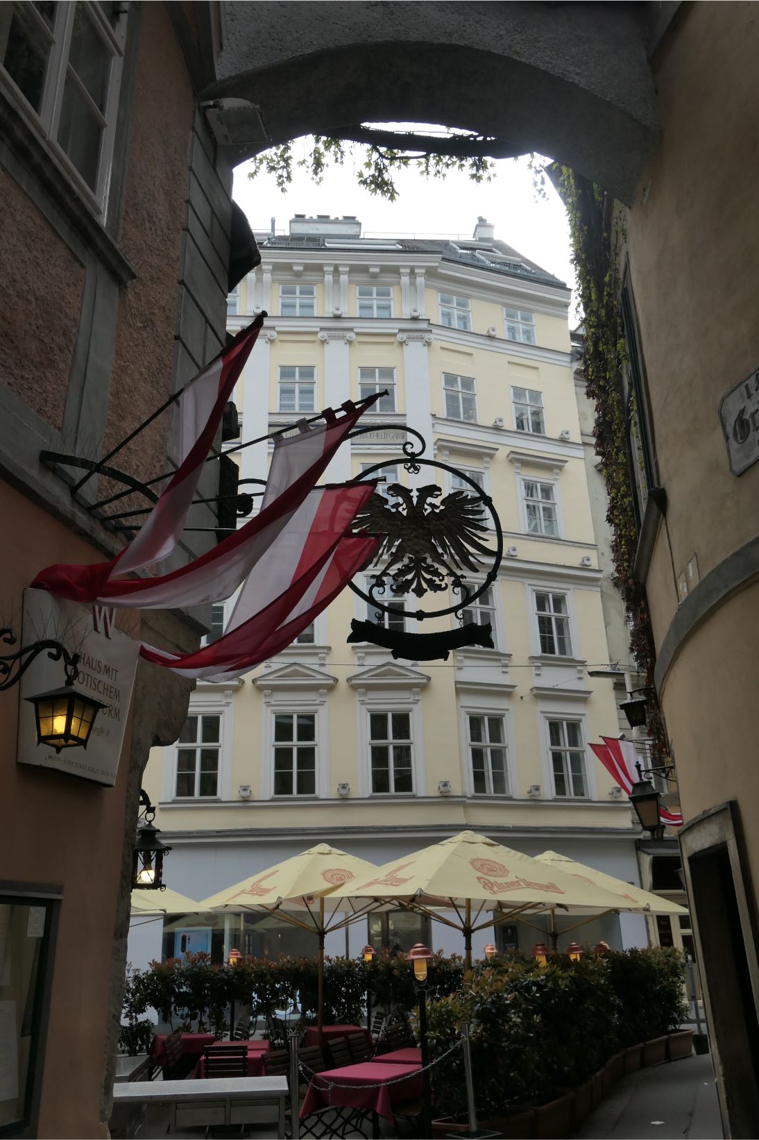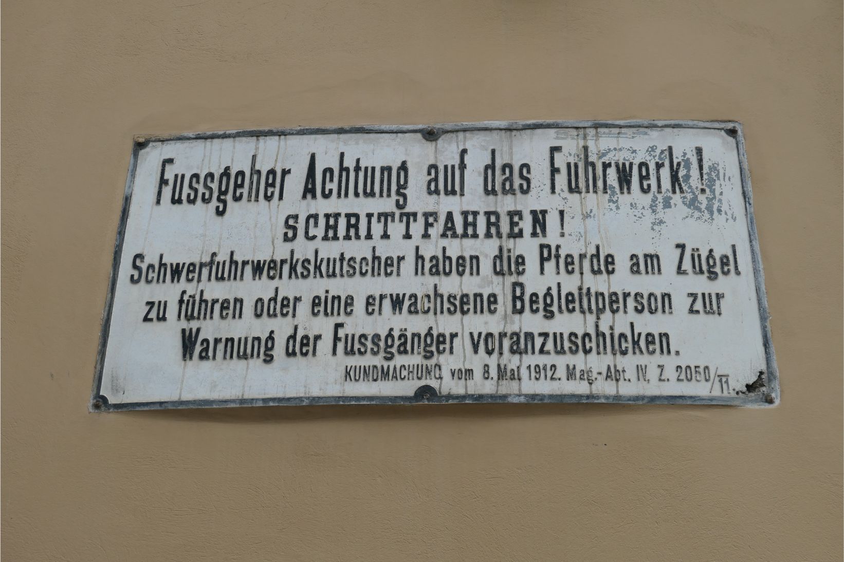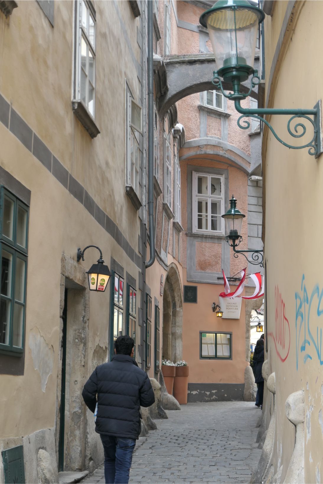 The shop was called WolleWien, which I guess means Wool Vienna. Marg and the lady in the shop had a great time talking about knitting and crochet, trying out new needles, comparing yarn etc, while I went wandering around the streets nearby. I found a neat little lane, which had a great sign dating back to 1912. I don’t know what it said, but the last line seemed to be issuing a warning about a chicken!