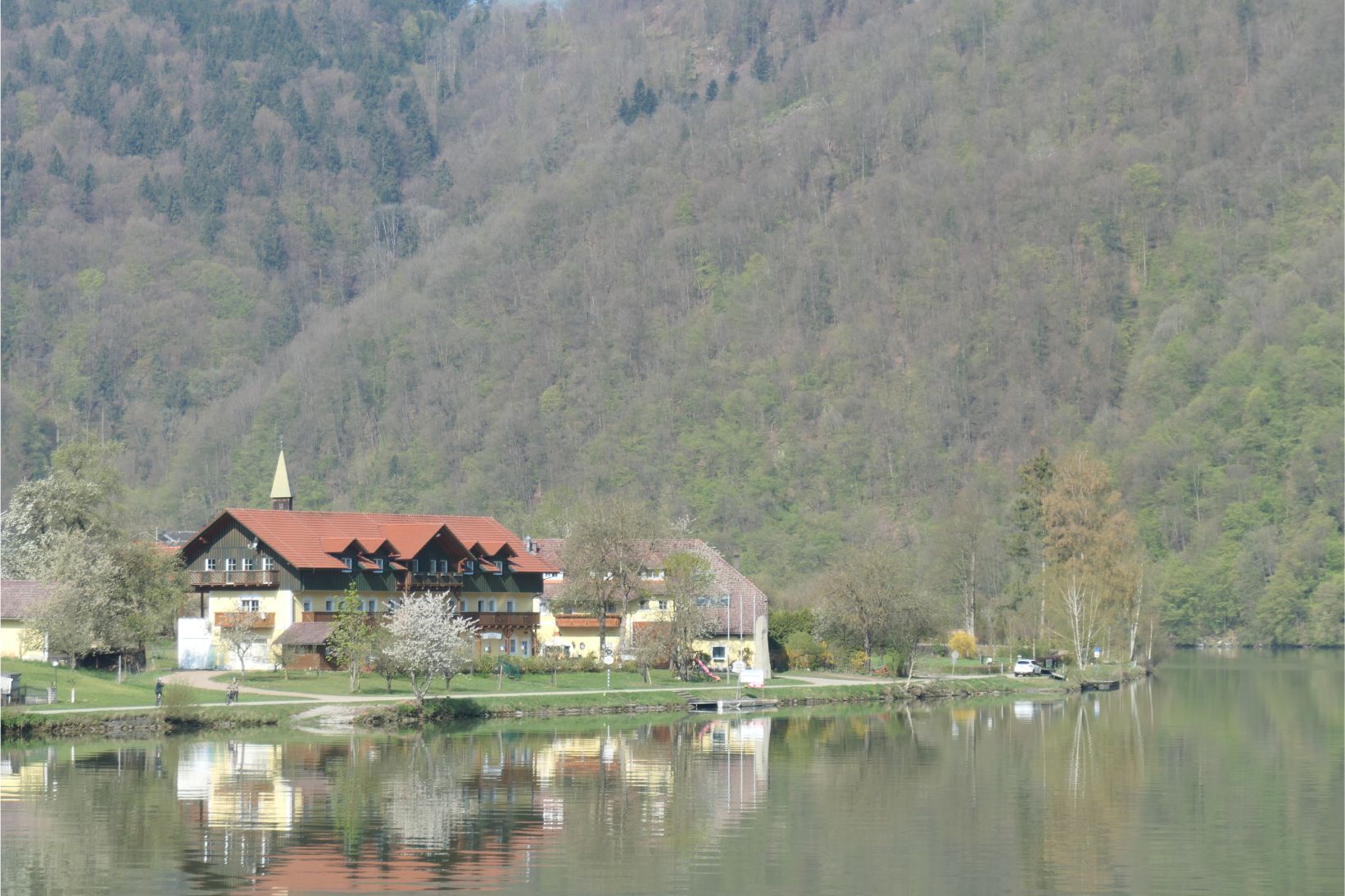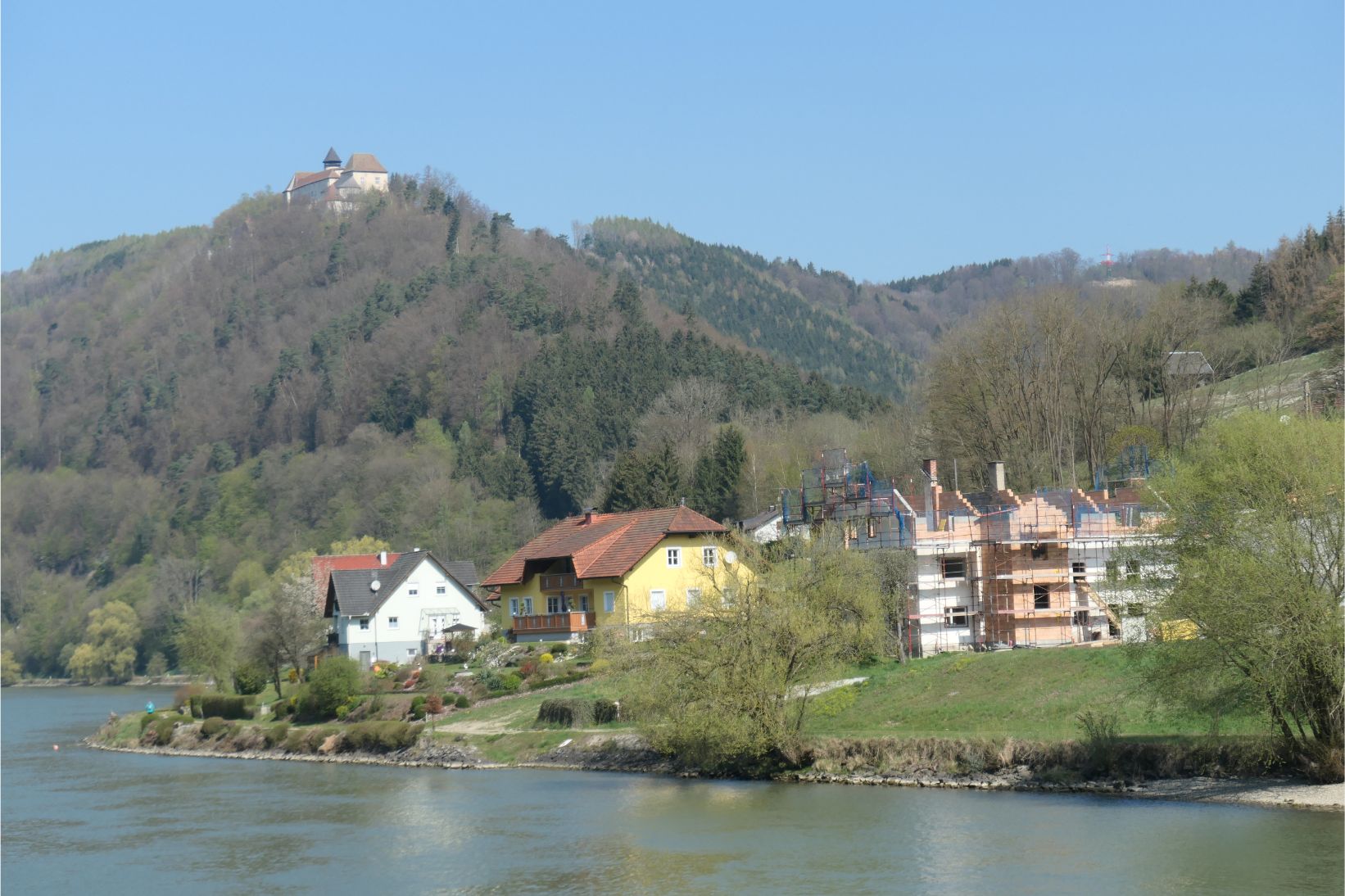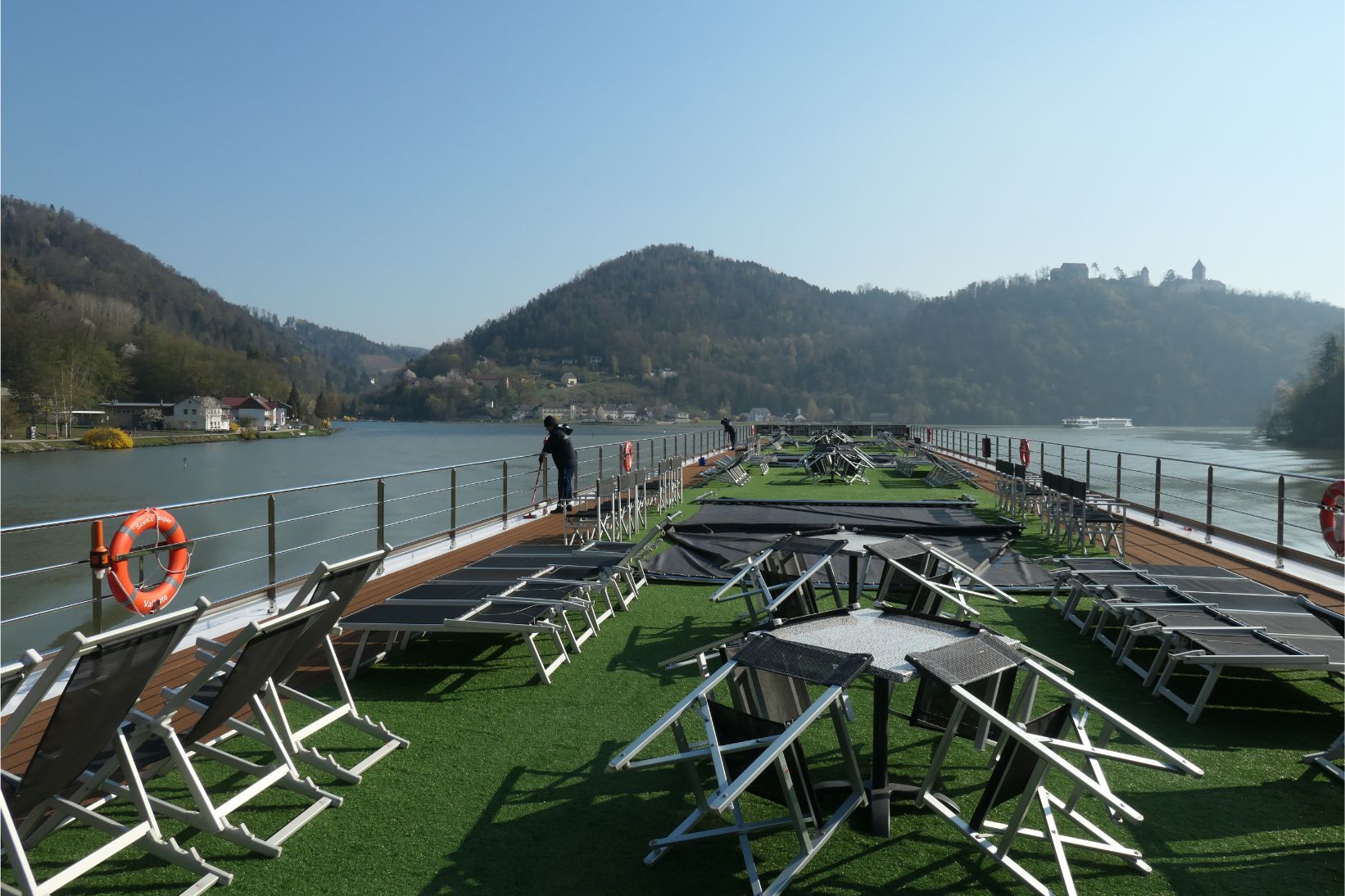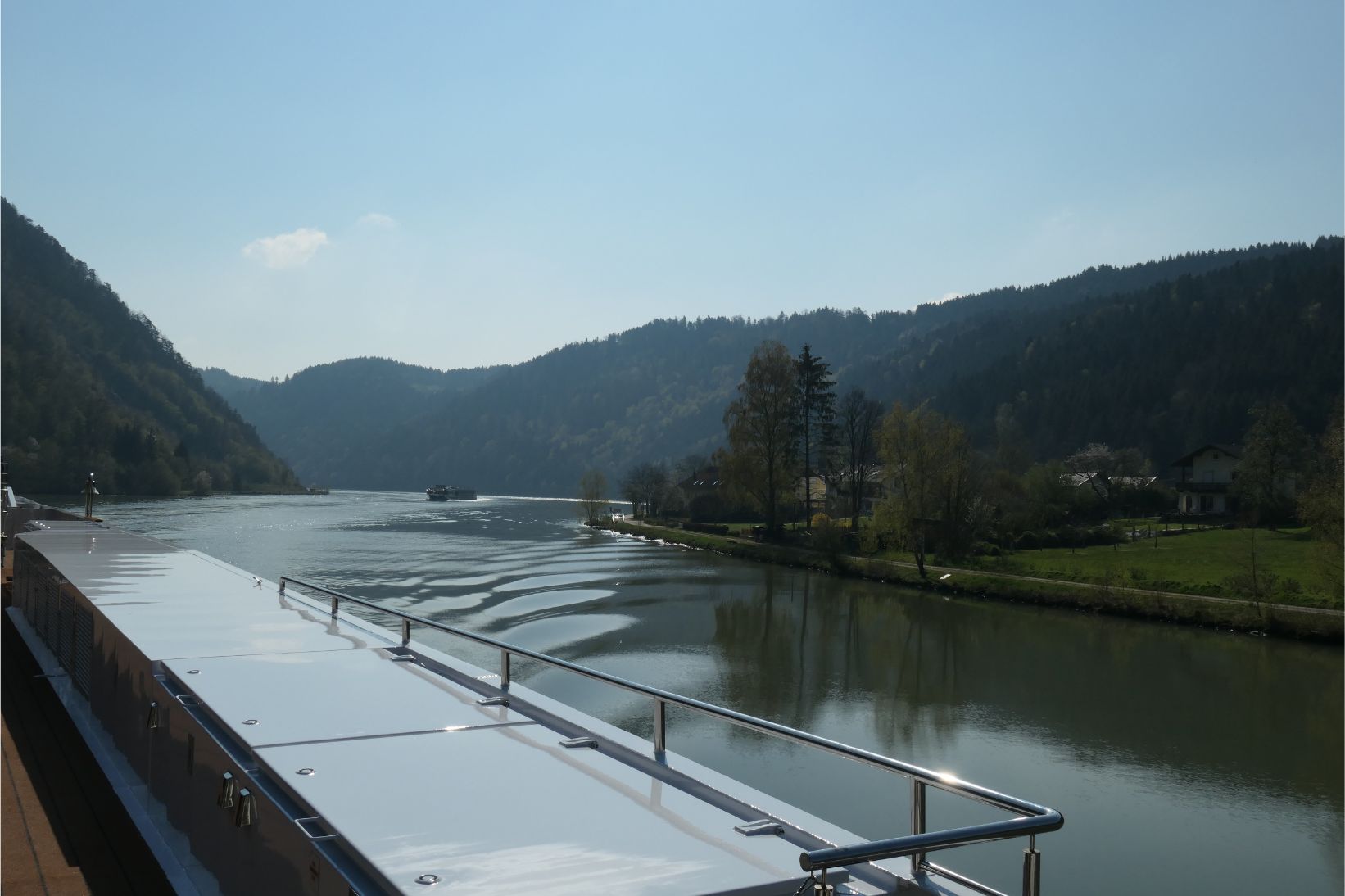 Just a short time ago we passed through Engelhartszell. From that point on we have had Germany on our starboard side and Austria on our port side, but the ship’s crew has now swapped the Austrian flag at the bow to a German one, so I assume we are now in German waters.