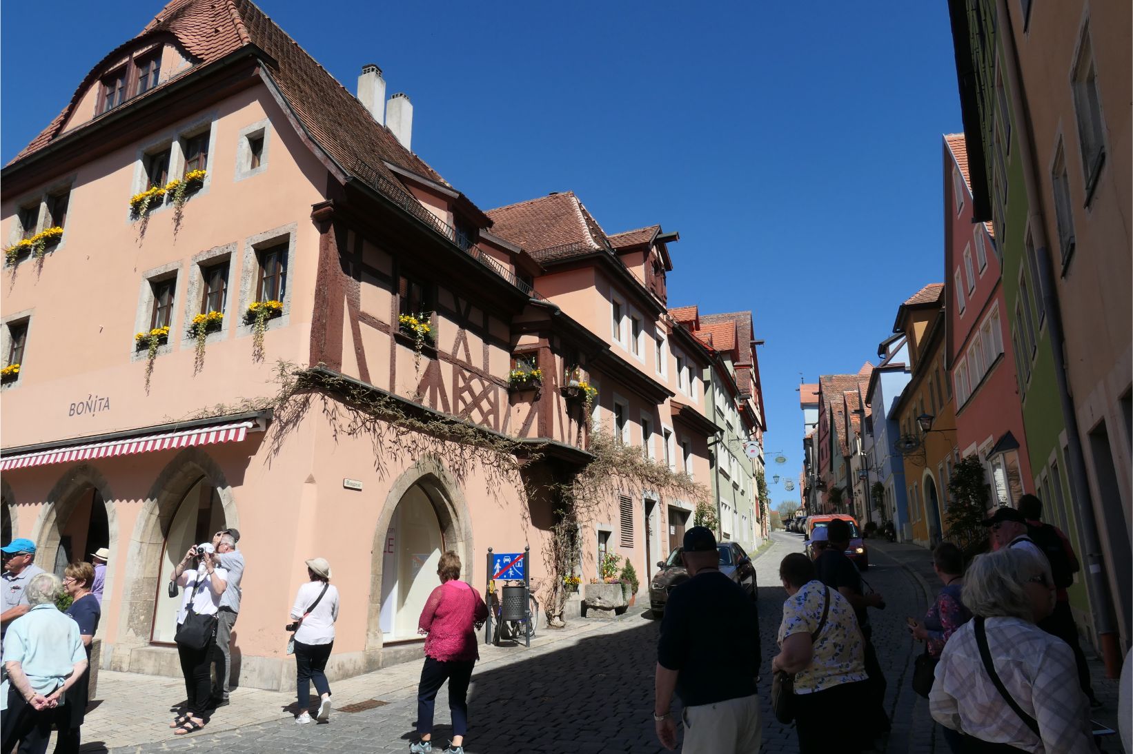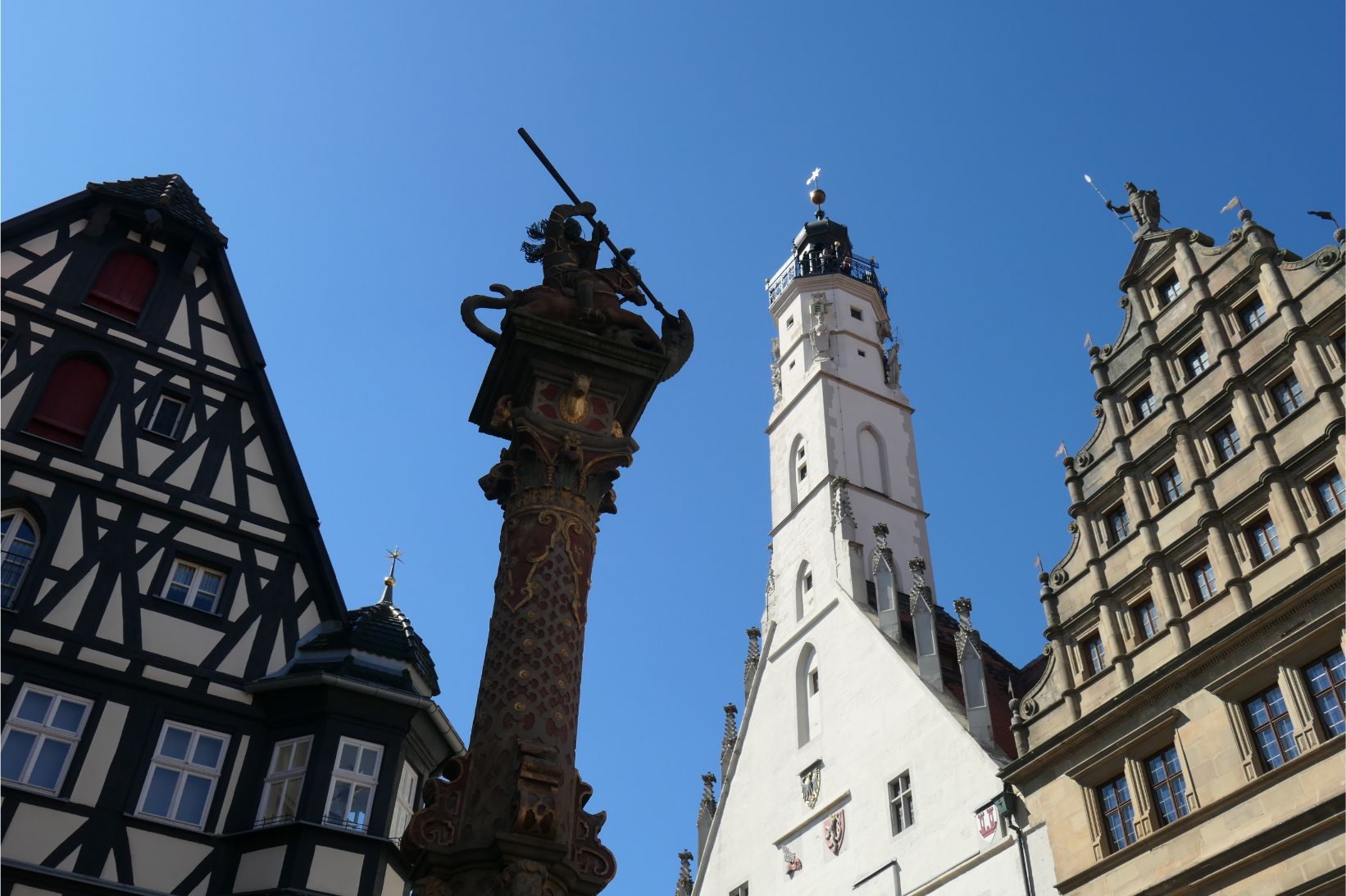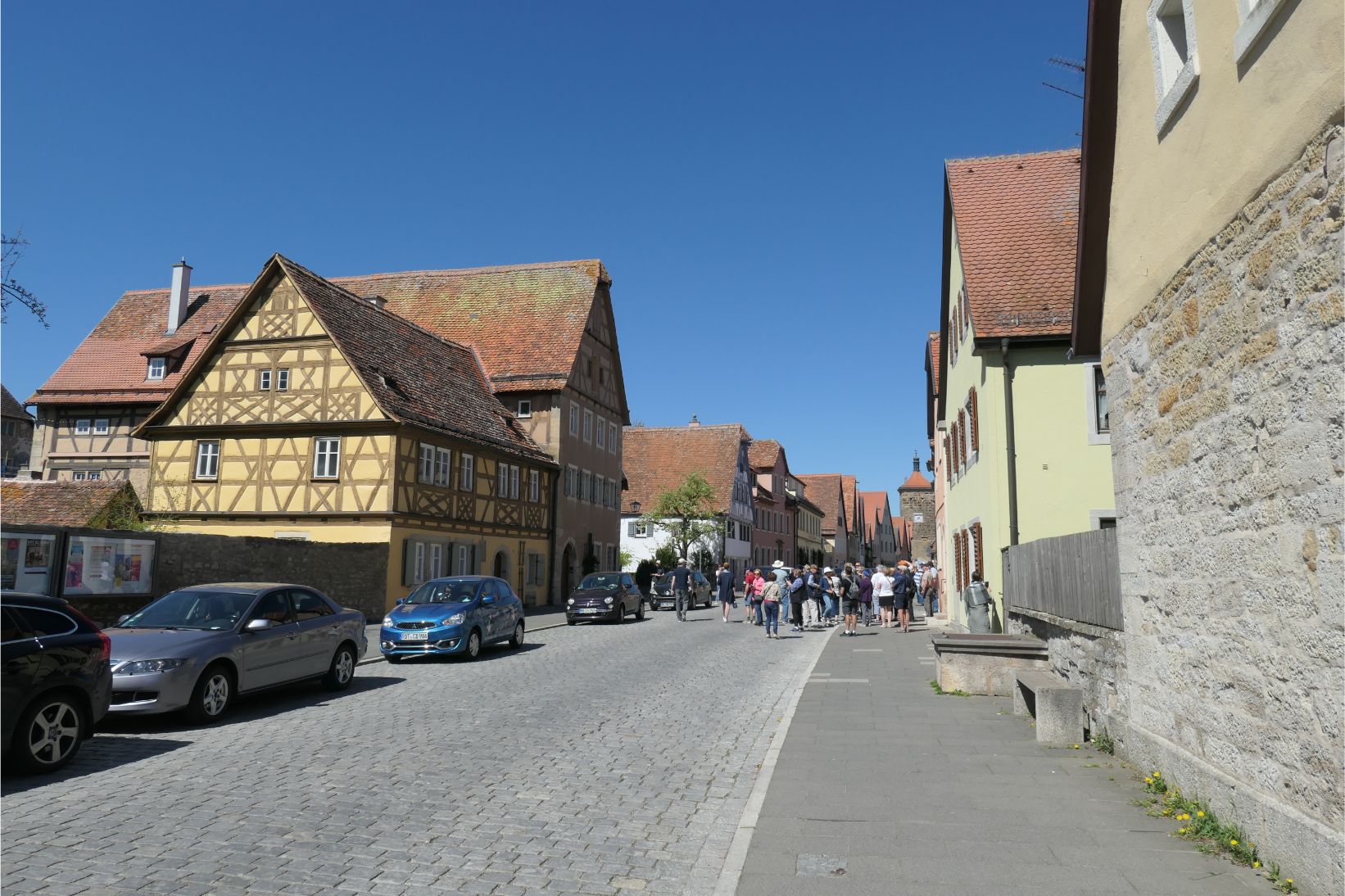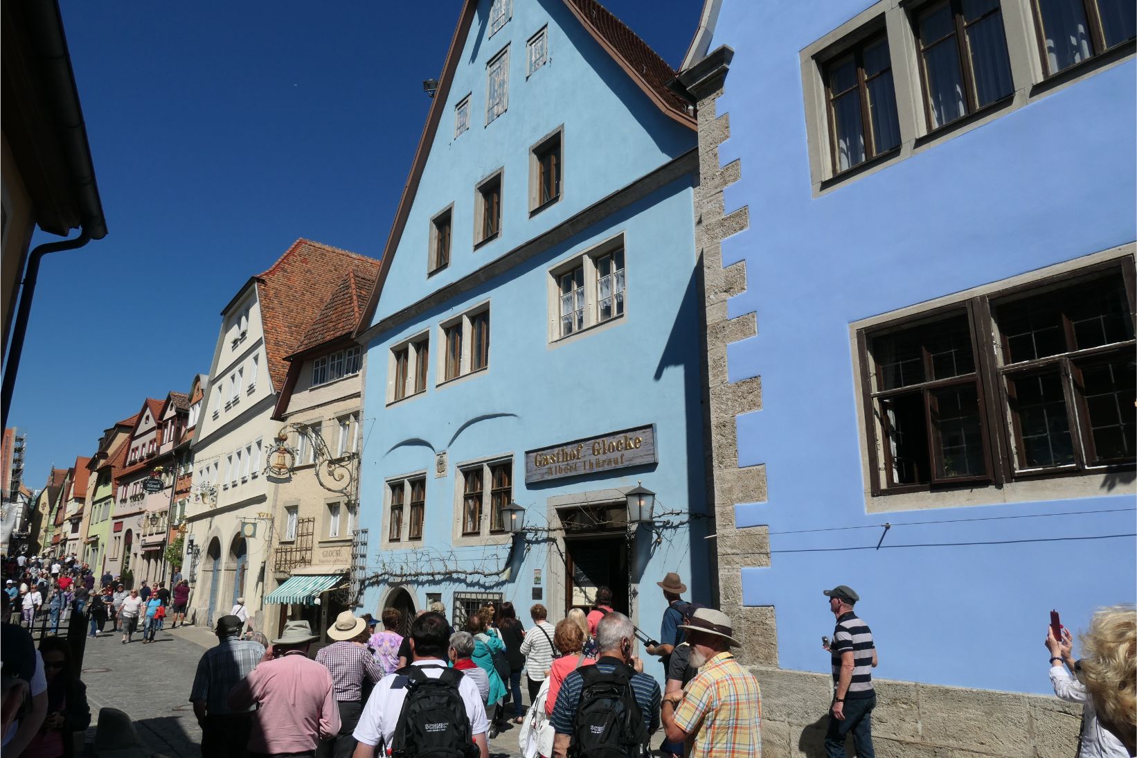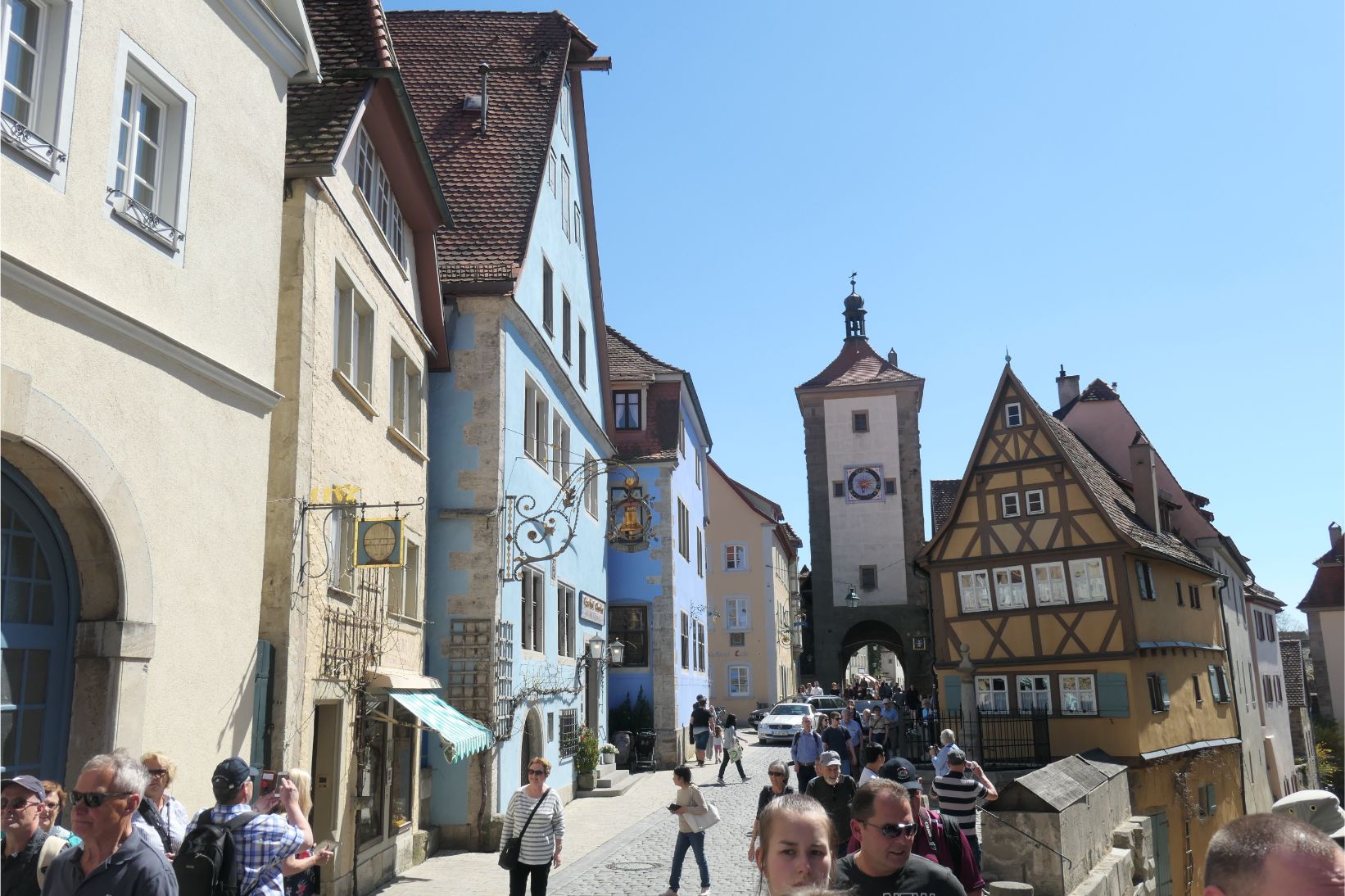 Approaching Rothenburg, the road began to climb steeply. Rothenburg is a medieval walled city, dating back over one thousand years of human history. We passed through a gate in the wall and entered the old town. Like other historic German towns we’ve visited over the past week, Rothenburg is a spider’s web of meandering cobbled streets and lanes. There are many cafes and pubs where you can enjoy a local snowball treat or a traditional Bavarian sausage or strudel, or, of course, a refreshing Bavarian beer.