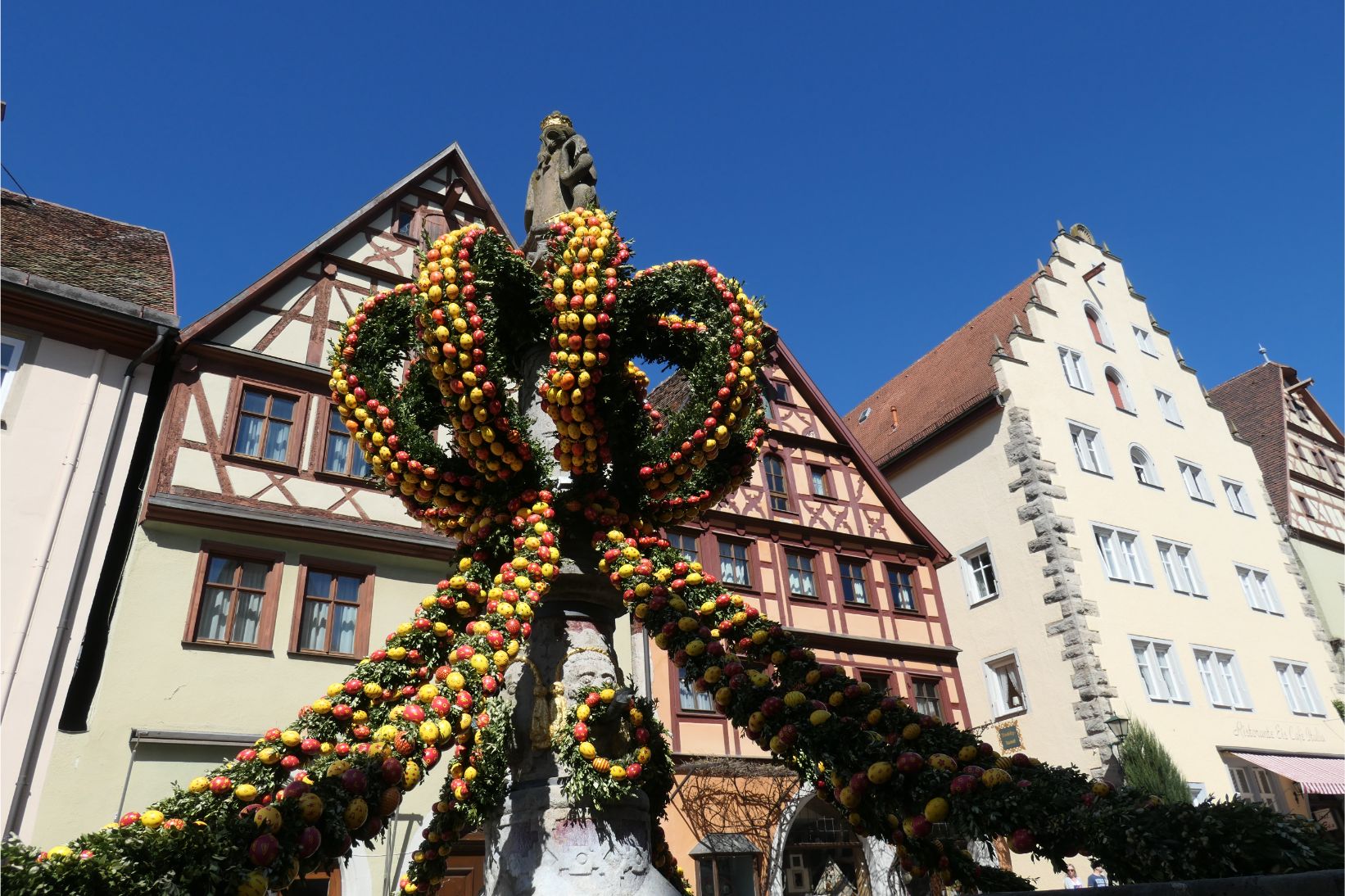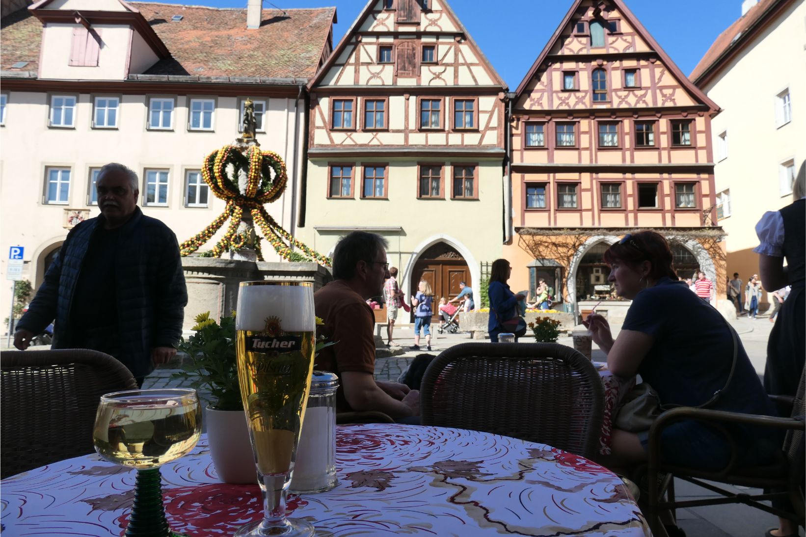 Marg and I stopped to enjoy a strudel with a glass of the local beverage in front of a statue decorated with Easter eggs. The temperature was 24 degrees and there was not a cloud in the blue sky. Germany just continues to delight us with its friendly people, its beautiful natural scenery, its historic towns and its amazing spring weather.