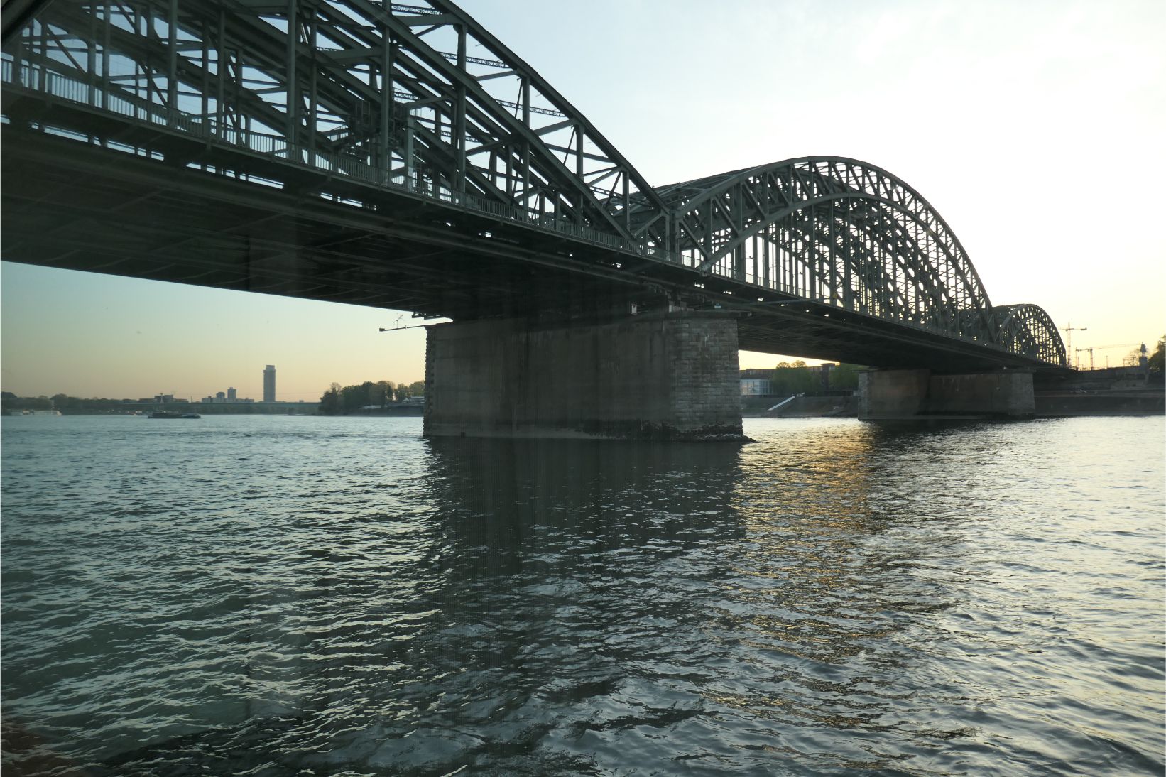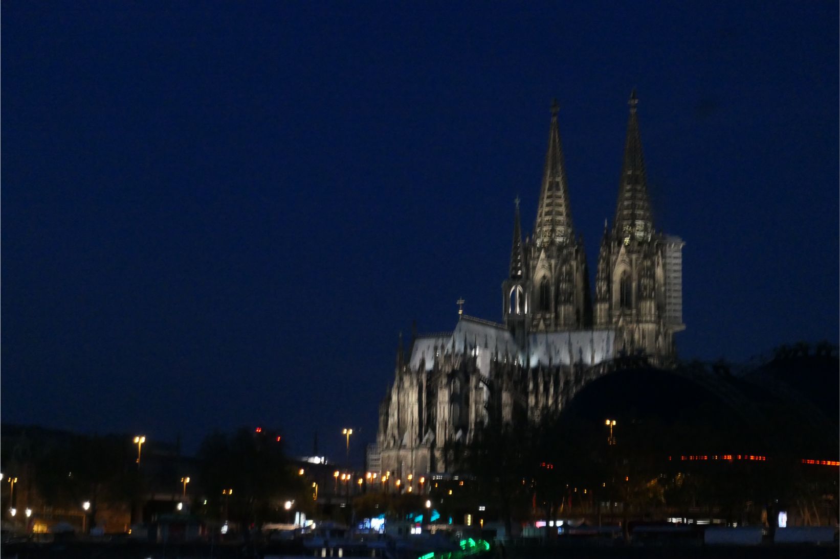 Early this morning, before dawn, I was up working on this blog and I sensed the ship turning around. I drew open the curtain of my cabin to discover that the ship had reached Cologne, our final stop in Germany. I managed to grab a couple of blurry shots of one of the cathedrals and the bridge in the gloomy light.