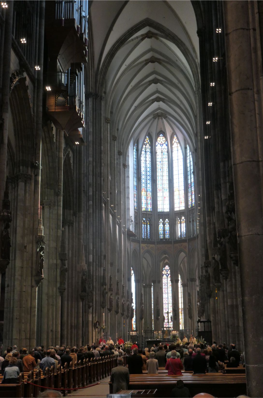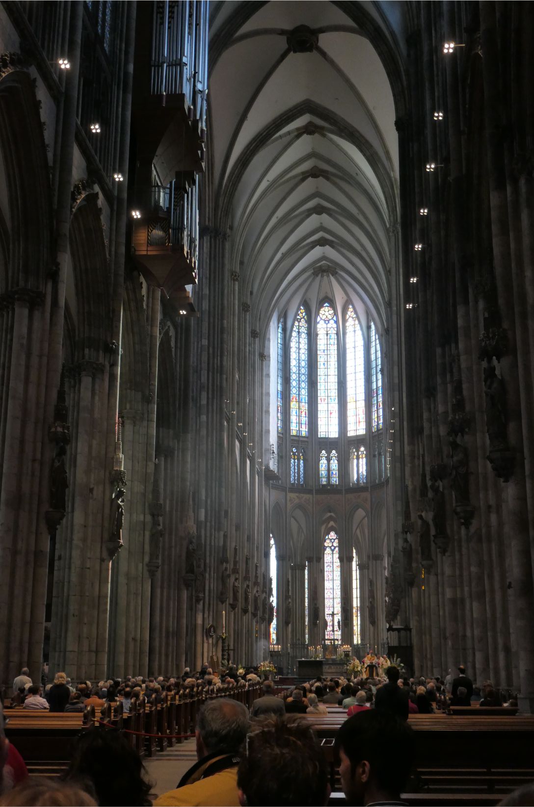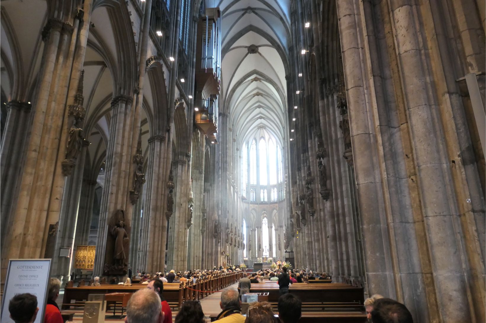 The interior of the cathedral was superb. Huge towering vaulted ceilings and massive stone columns were features. Stained glass windows, which had been safely removed and stored during the war, lit up with bright colours as the sunlight streamed through them. The congregation sat on wooden pews in silence as the priest delivered his message. One can only imagine how magnificent the cathedral must have been in medieval times when it would have dominated the city from every possible viewpoint. Even in today’s modern world, when humans have the knowledge, materials and technology to create remarkable buildings, the Cologne cathedral remains an awe inspiring structure.