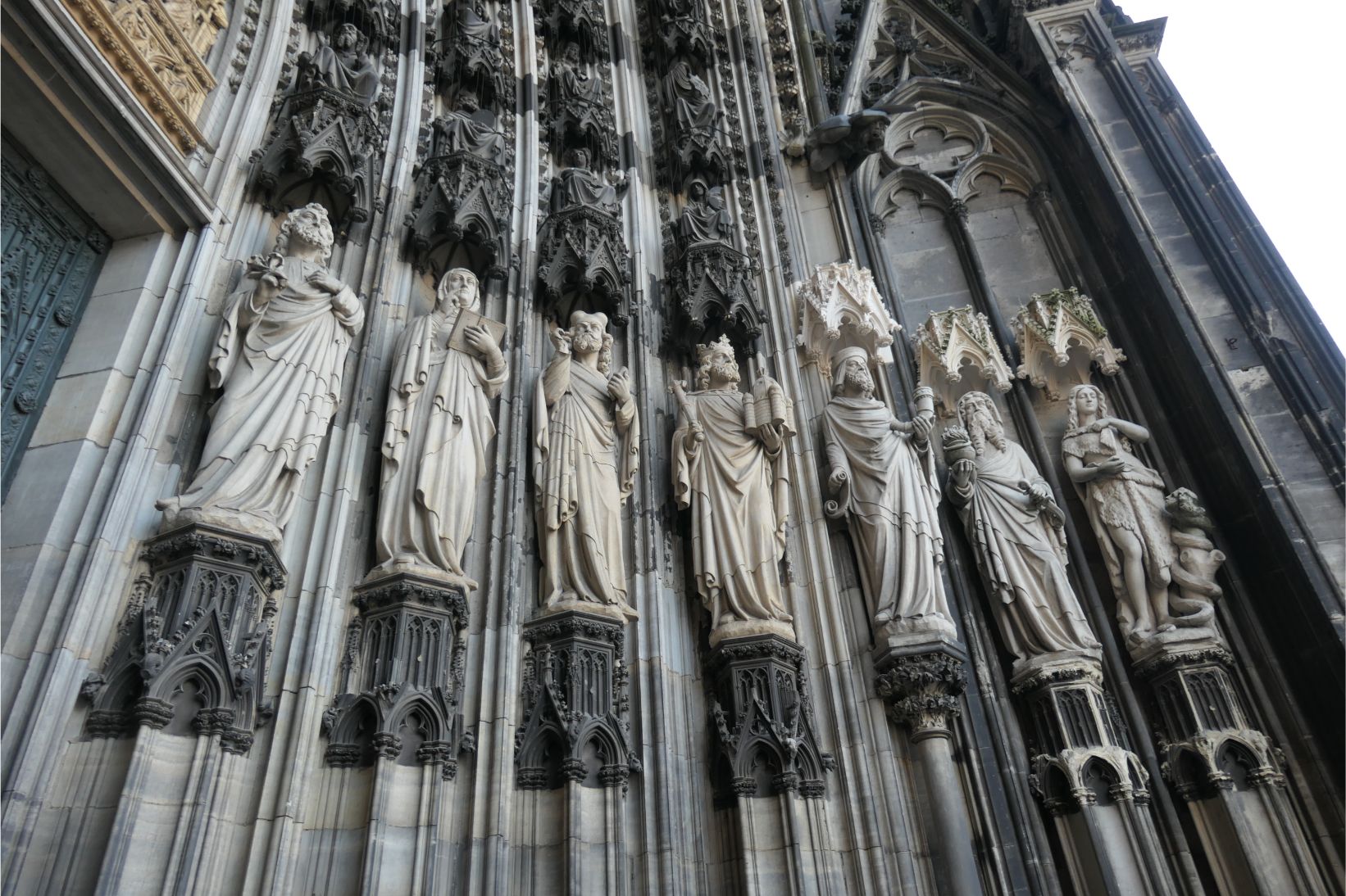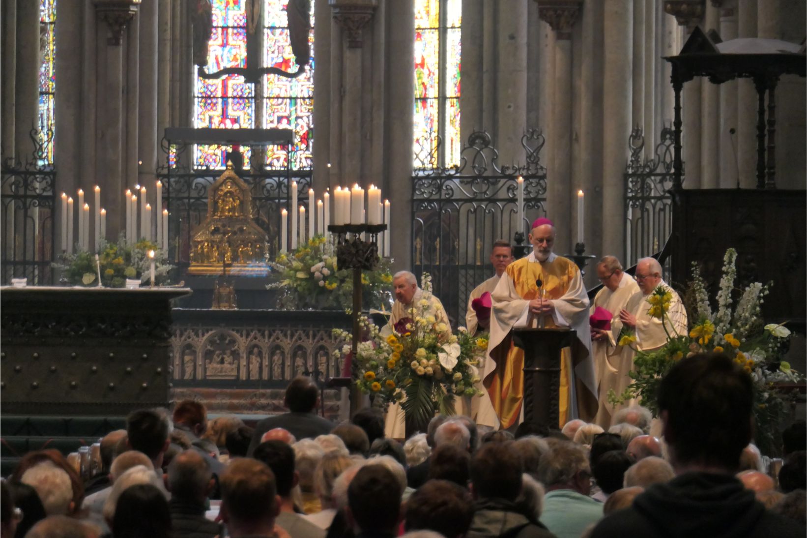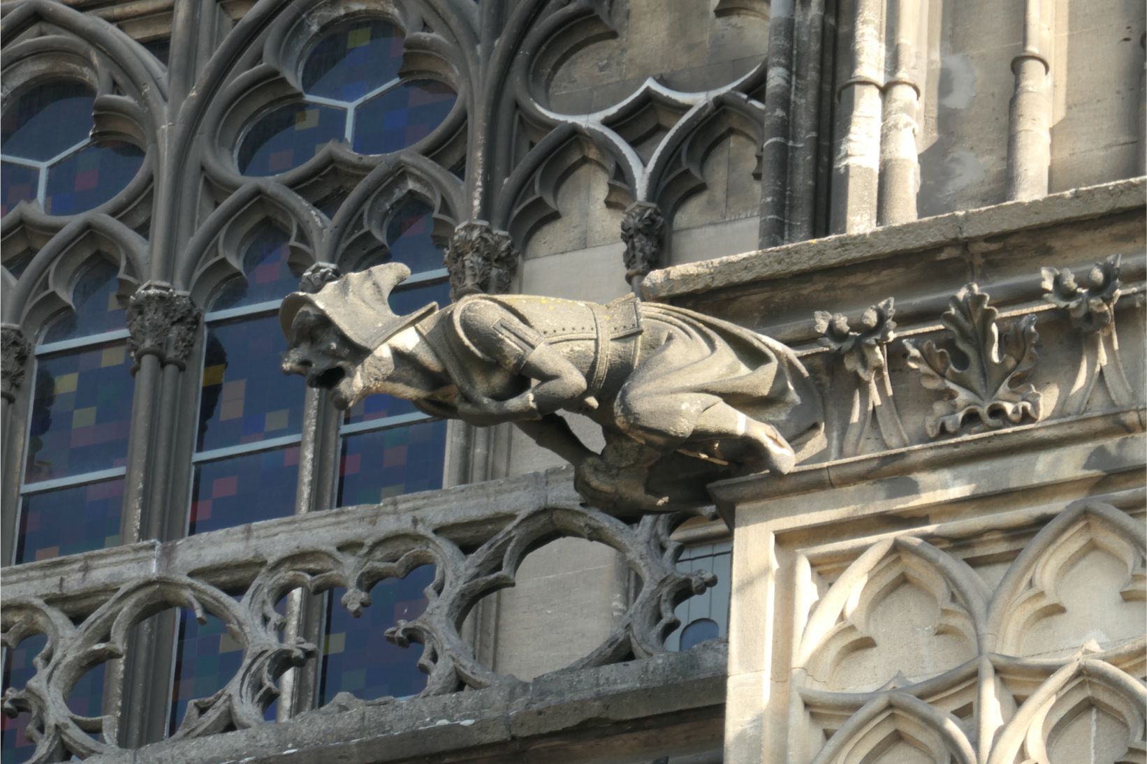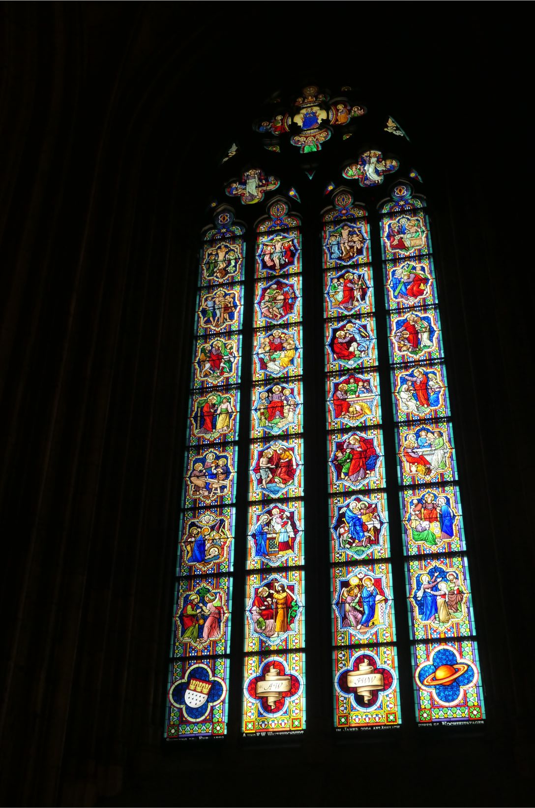 The interior of the cathedral was superb. Huge towering vaulted ceilings and massive stone columns were features. Stained glass windows, which had been safely removed and stored during the war, lit up with bright colours as the sunlight streamed through them. The congregation sat on wooden pews in silence as the priest delivered his message. One can only imagine how magnificent the cathedral must have been in medieval times when it would have dominated the city from every possible viewpoint. Even in today’s modern world, when humans have the knowledge, materials and technology to create remarkable buildings, the Cologne cathedral remains an awe inspiring structure.
