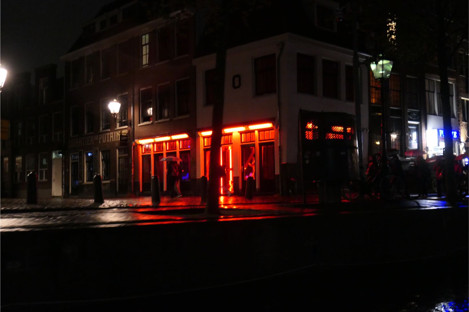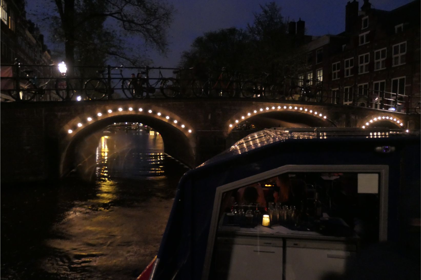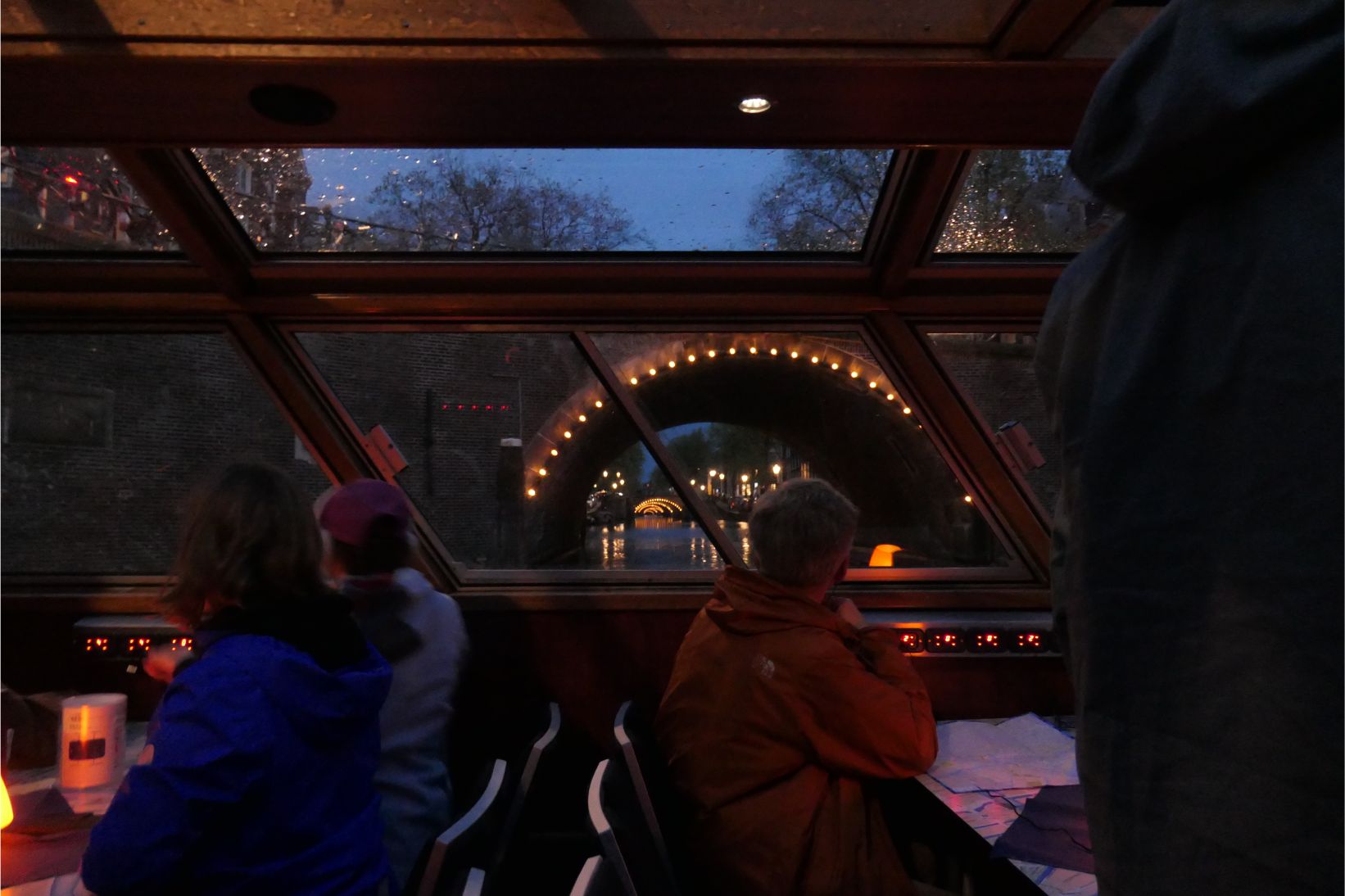 Rod, Cornelia, Marg and I decided to take a 90-minute canal cruise on our first night together in Amsterdam. It was raining lightly when we began. By midway through the journey, it was coming down quite heavily. Marg and Cornie sat at tables and listened to the recorded commentary. Rod and I went to the stern of the boat with our cameras, hoping to grab a few photos of Amsterdam at night. It was cold out there on the open deck, and quite wet.
