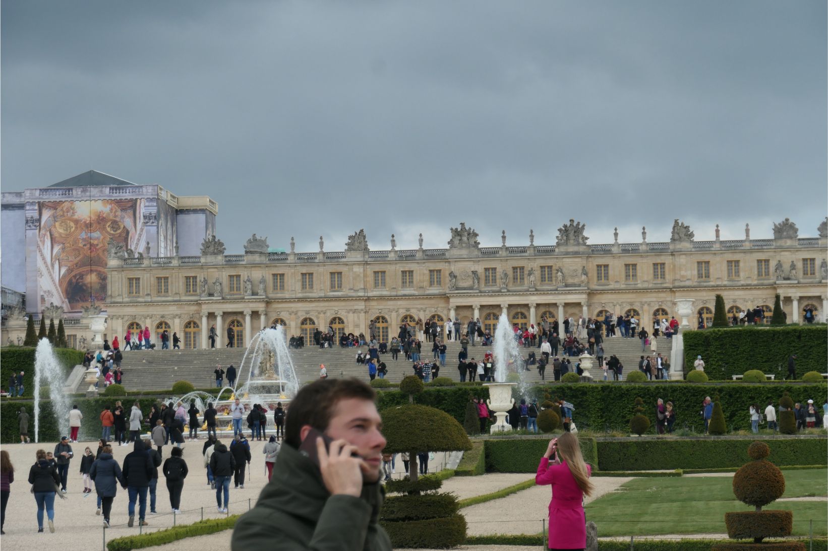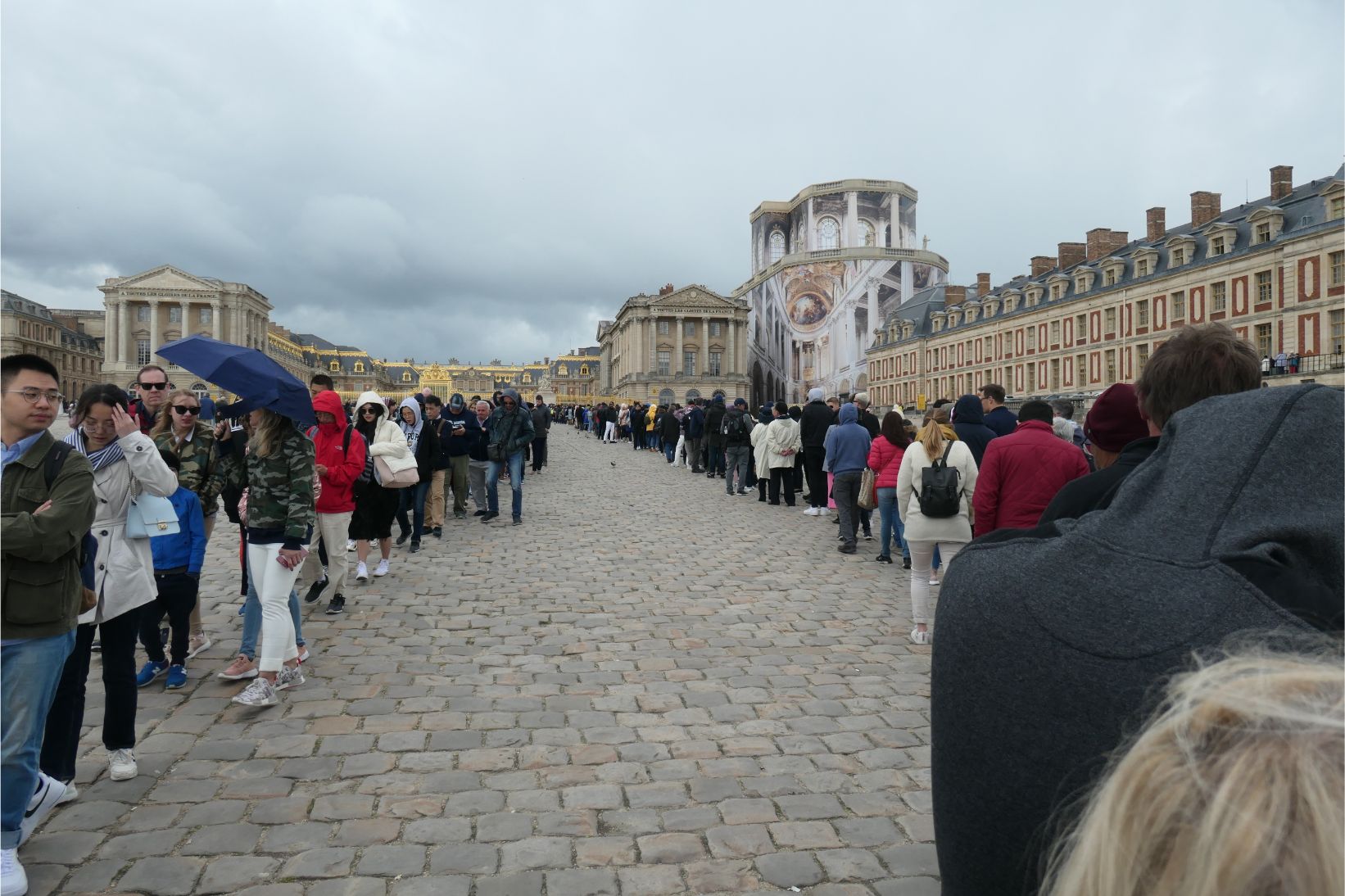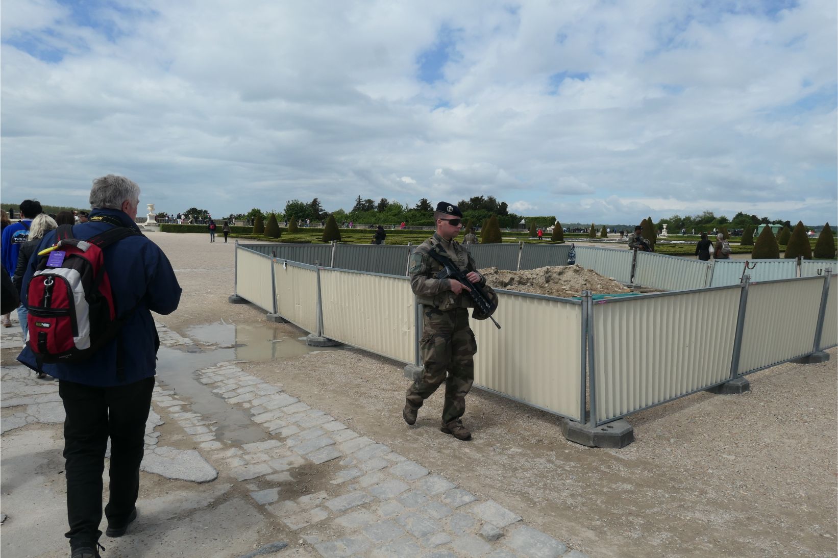 Marg and I have been fans of the TV series ‘Versailles’ for quite some time, so we’ve had a visit to Chateau de Versailles on our respective bucket lists for several years. We took the Metro from Gare D’Austerlitz to Javel, then crossed over the road to the RER train and rode that to Versailles Rive Gauche station. We had a rather interesting site while waiting on the platform at Javel (top photo). Although we’d pre-purchased tickets, we still had to get into the extraordinarily long queue and wait to enter. We joined the queue at 10am and finally gained entry at midday. Soldiers with automatic weapons kept watch over us, because tourist landmarks in Paris continue to be on alert for terrorist activity.