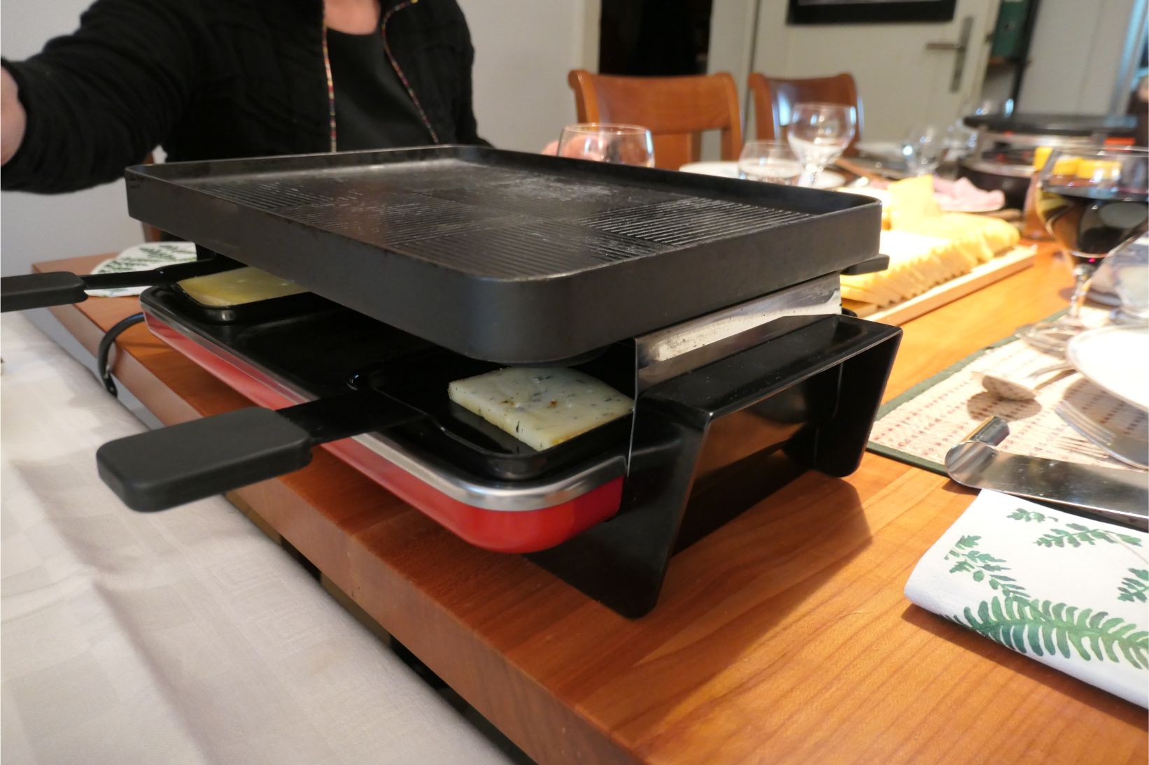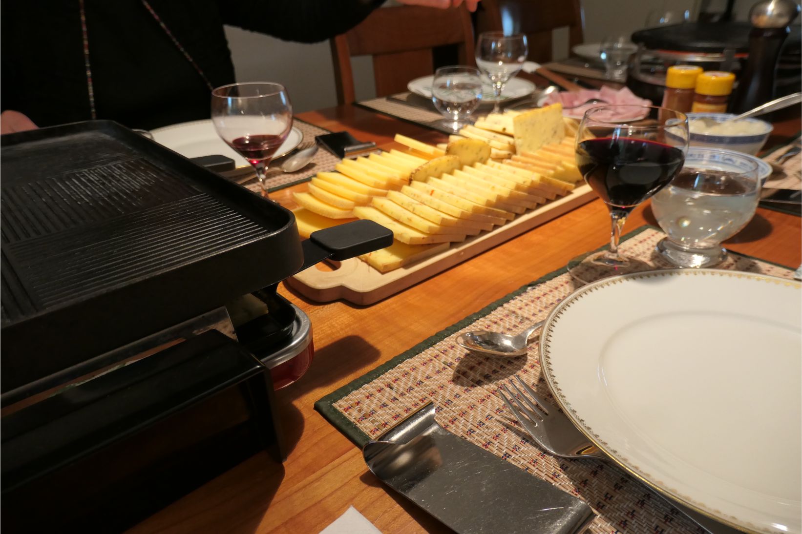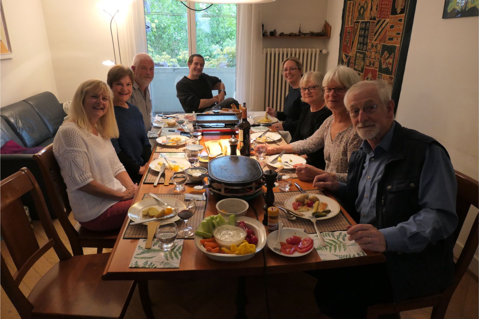Last night we were invited to have dinner with Cornelia’s family at her sister Barbara’s house. Also there were Barbara’s husband Claudio, their son Caspar and his partner Fabienne, and Cornie’s sister Ursula. We had a delicious traditional Swiss meal of melted slices of raclette cheese, served on a plate with potatoes, pickles, tomatoes and sliced meat. There were various types of raclette cheese to choose from – raclette with chili, with port wine, with peppercorns, with curry etc – and it was good fun melting it at the table. I loved it.