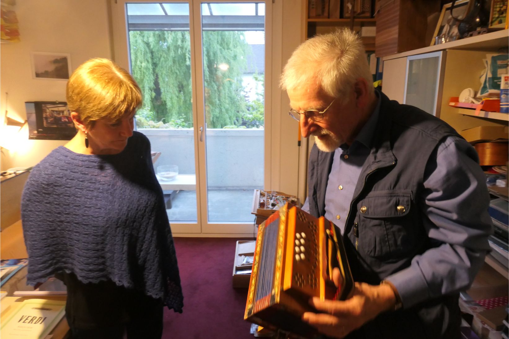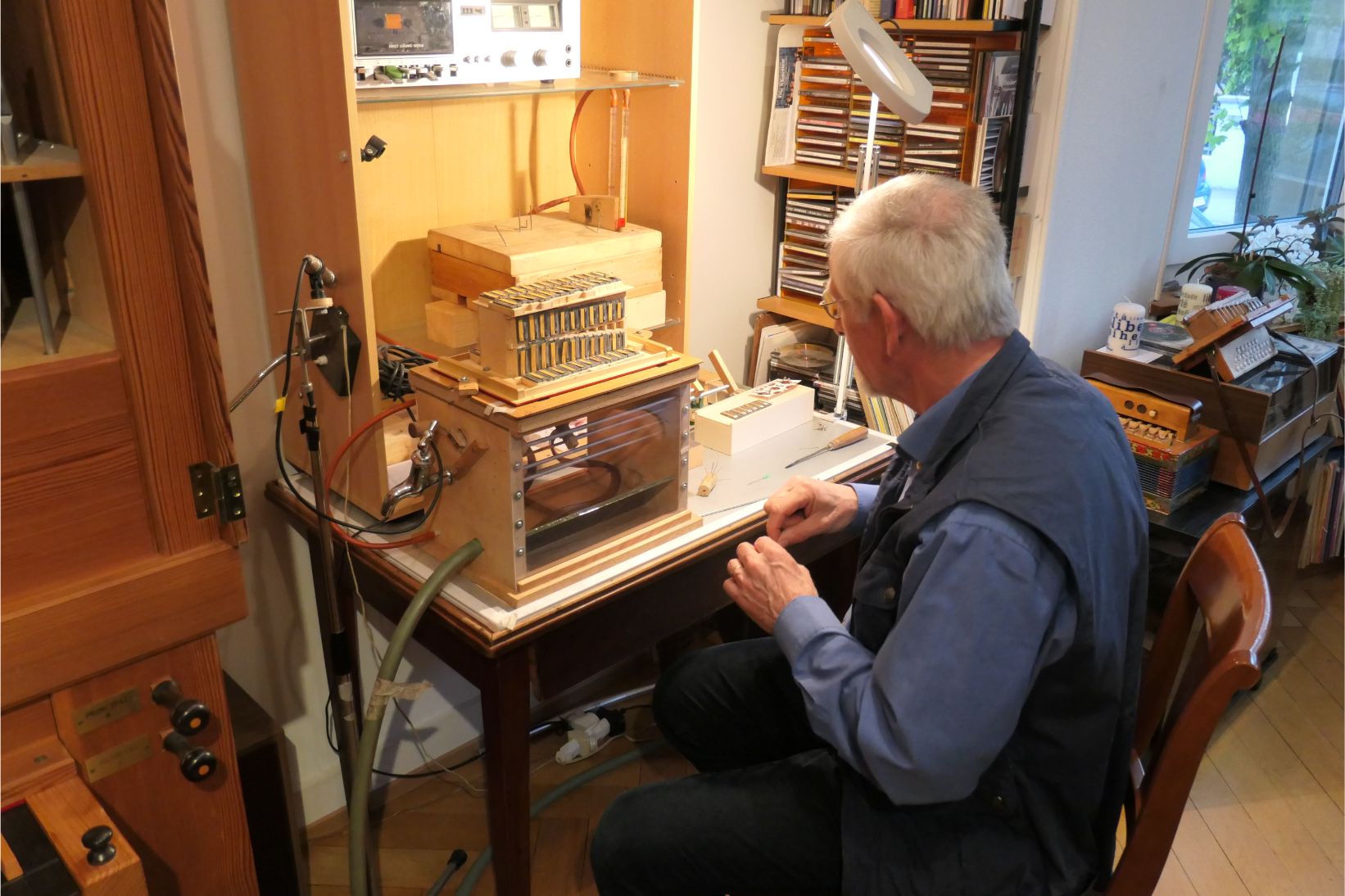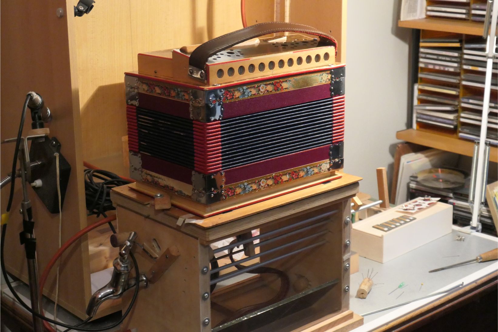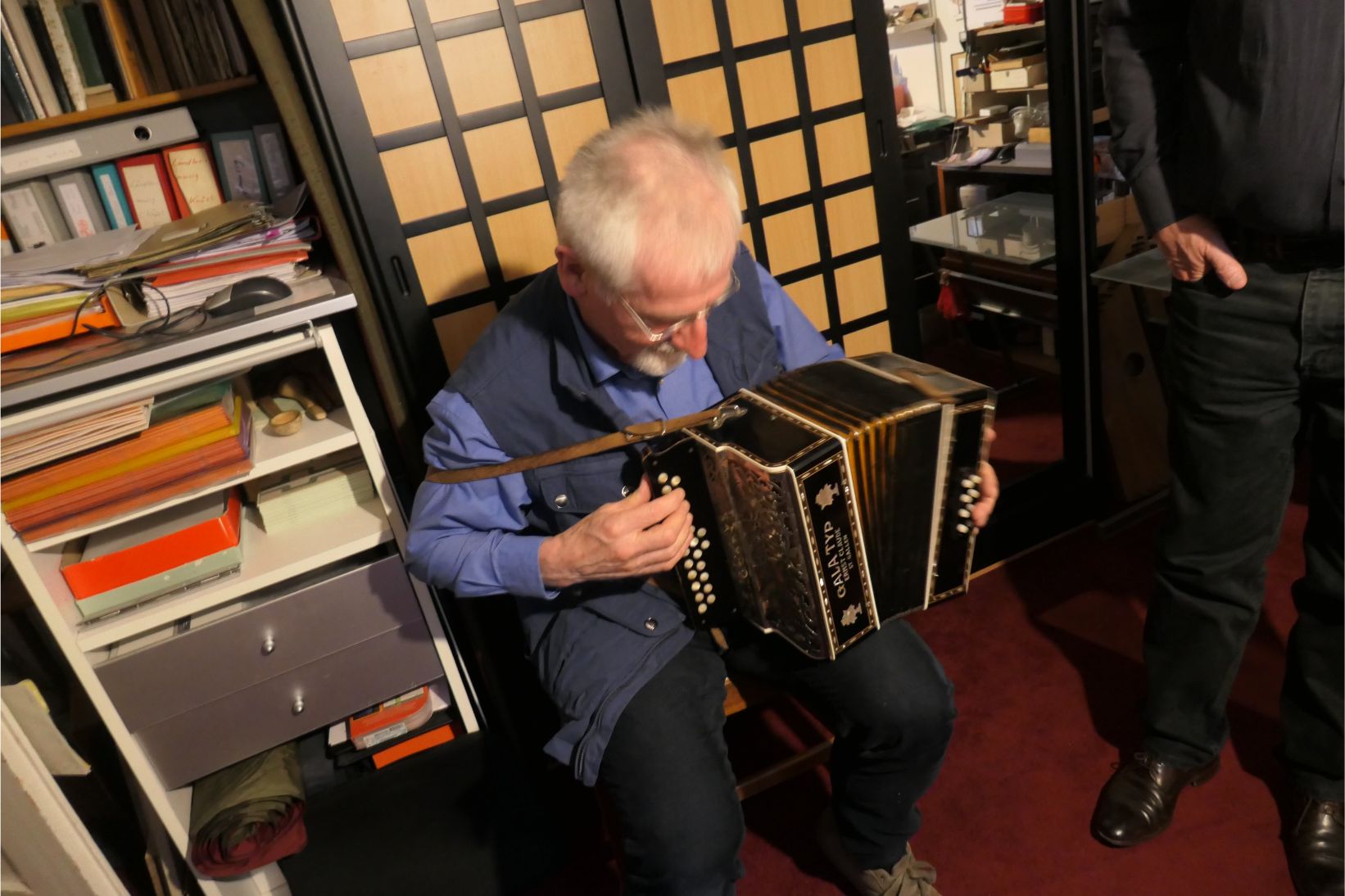 Claudio has designed and built a machine for the purpose of retuning the old squeezeboxes. The delight on his face as he demonstrated how it worked was plain to see, and we were treated to some of his playing on a range of instruments so we could hear the different notes that could be made on different types of accordion. Upstairs, we saw the rest of his collection – it was like being in a squeezebox museum. Fantastic!