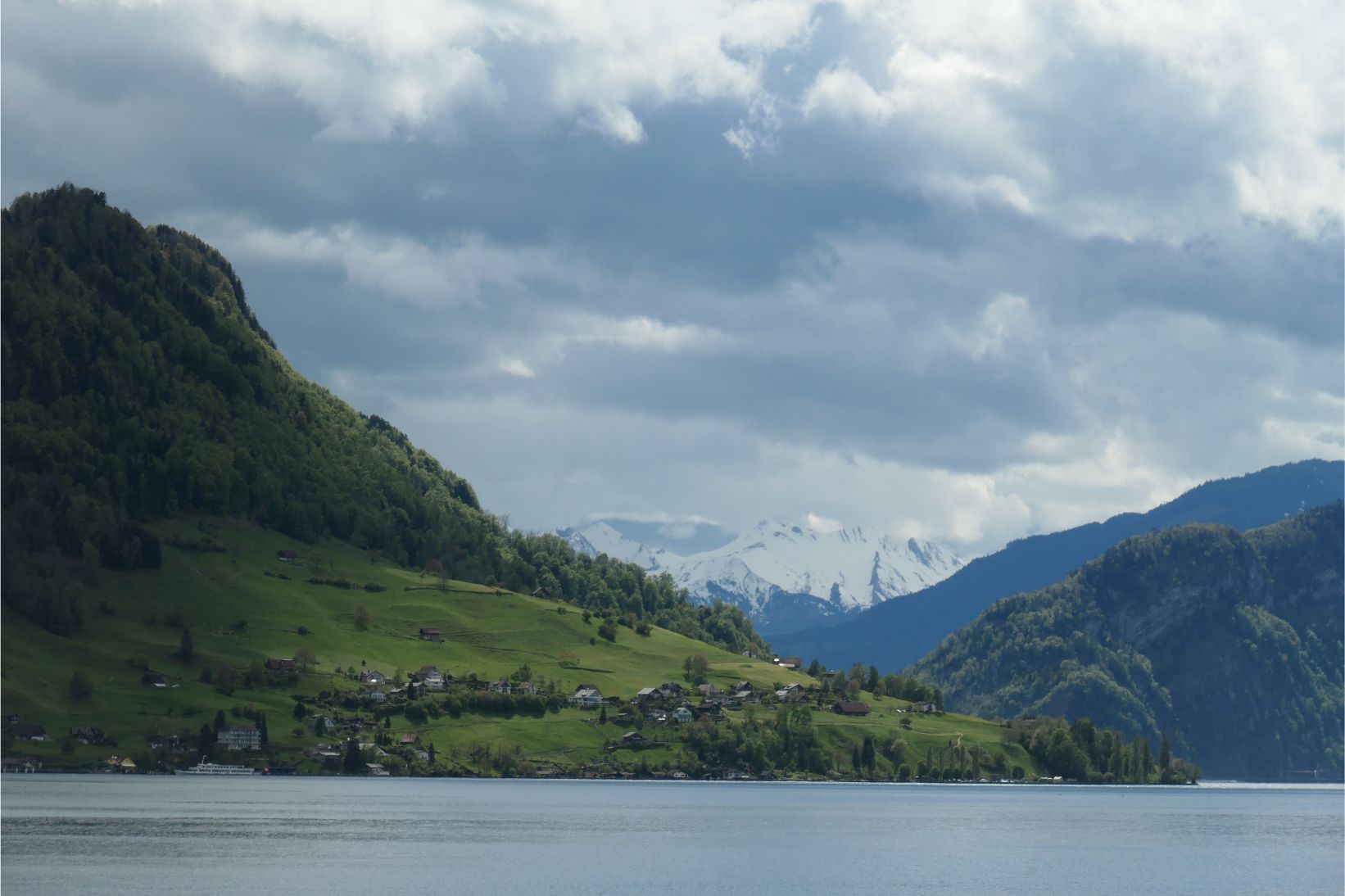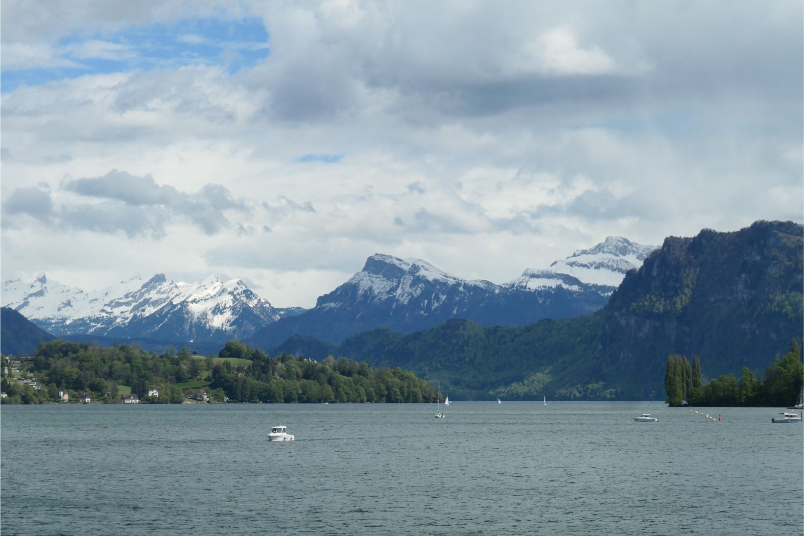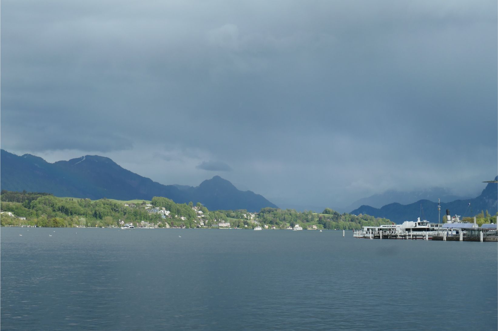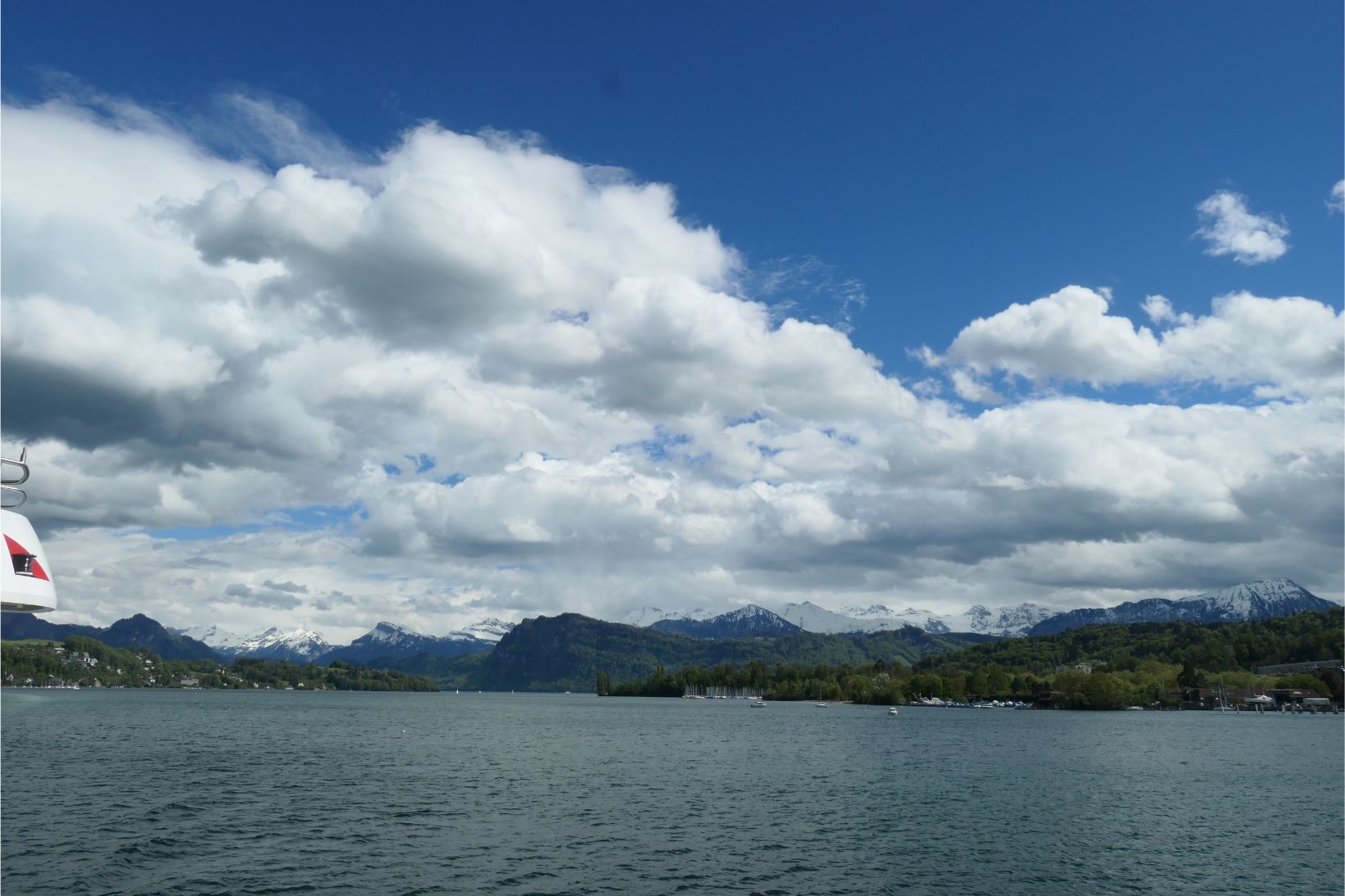 The cable car had brought us down from high on Rigi to the shores of Lake Lucerne. Although grey clouds obscured some of the peaks, the lake was surrounded by beautiful white snow capped mountains. A boat picked us up at the dock in Weggis and took us to Lucerne. We went out to the bow of the boat to take photos, but it was quite windy and chilly up there. To our starboard side, the massive form of Pilatus dominated the landscape. It’s a majestic mountain.
