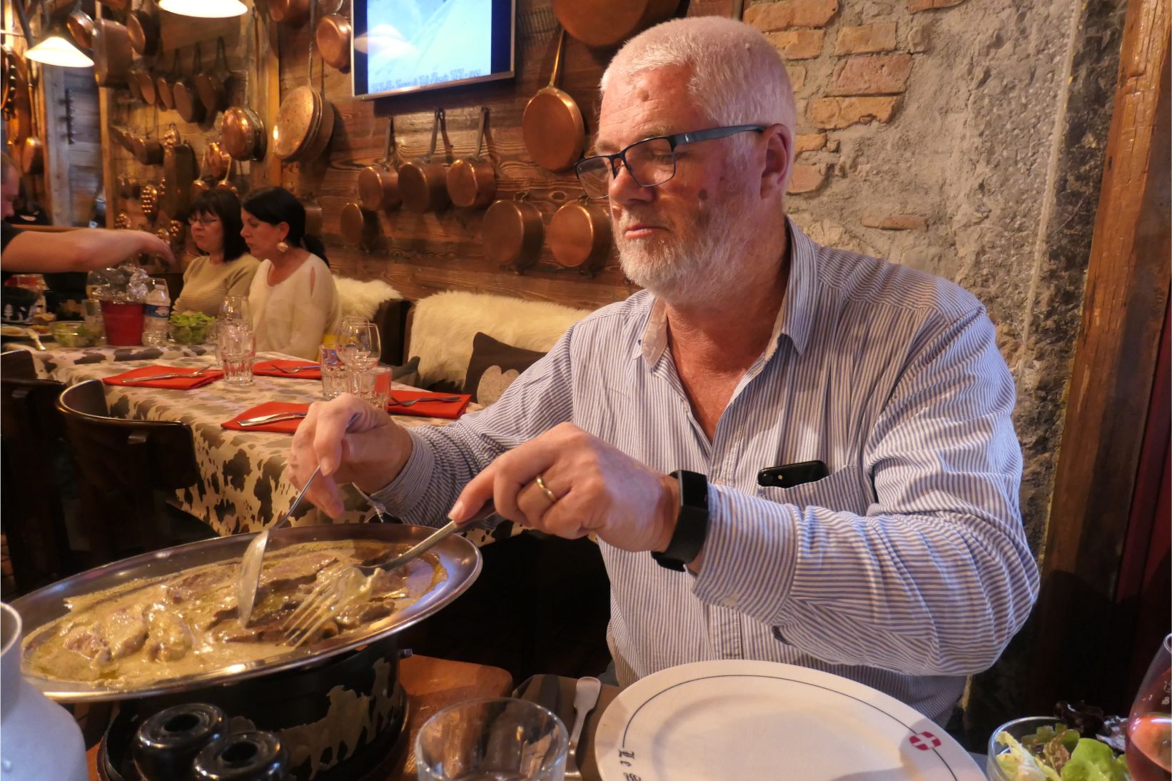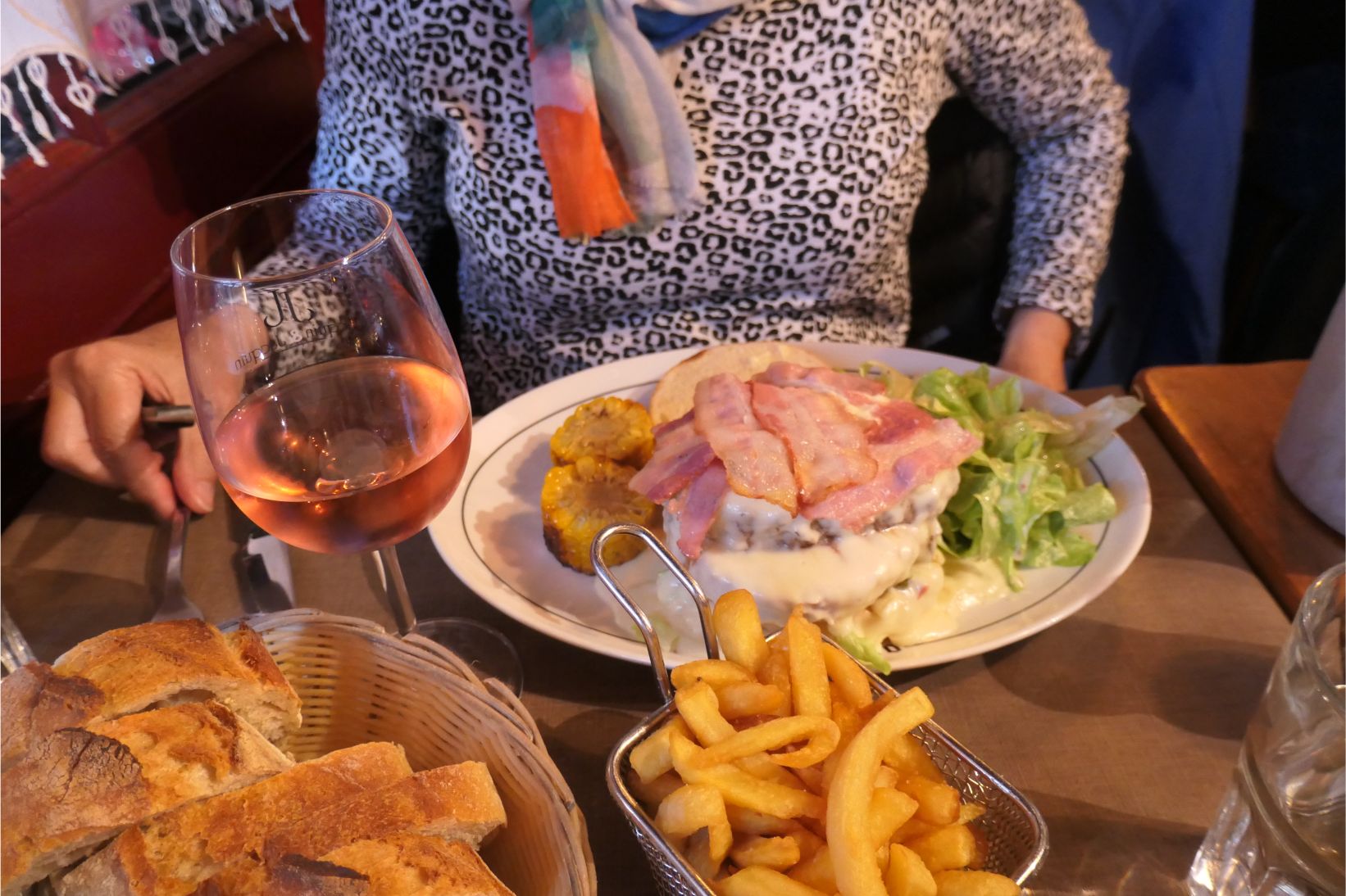 So we headed back into the old town and stopped for dinner at a restaurant alongside the river flowing by the old prison. Marg had a massive burger and I had a dish, reputedly originating from a fine Parisian restaurant, where I had to cook my own sirloin steak at the table in a butter-based sauce. The food was fantastic, but, typical of France, we couldn’t squeeze it all in. The bowl of delicious crusty bread that comes with every meal was largely untouched, though it pained me to leave it that way.