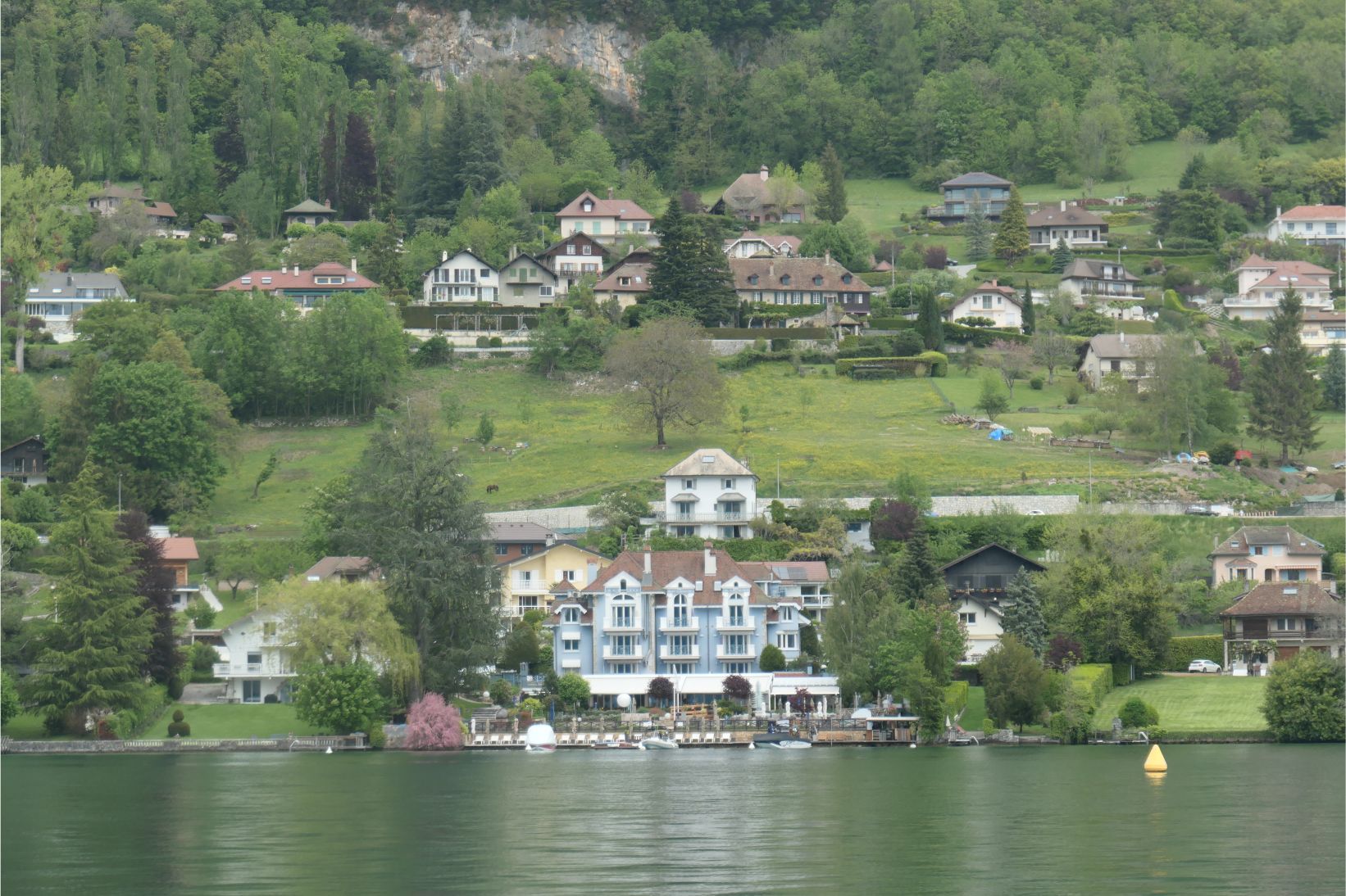 As the boat cruised past villages, hotels, chateaux, and other points of interest, the captain used his best English to explain the stories behind them. I must admit that I didn’t catch everything he was saying, but the cruise itself was relaxing and the scenery was beautiful. We passed a group of hang gliders circling high in the air at one point, though we couldn’t see where they were landing. We passed St Jorioz, where Remi grew up, and where his parents still live. At the centre of the lake, where it is around 45 metres deep, the water in the lake is still crystal clear and deep blue. It comes straight down from the mountains and provides Annecy with a great supply of fresh water.