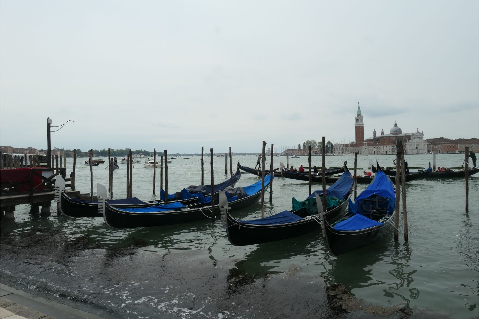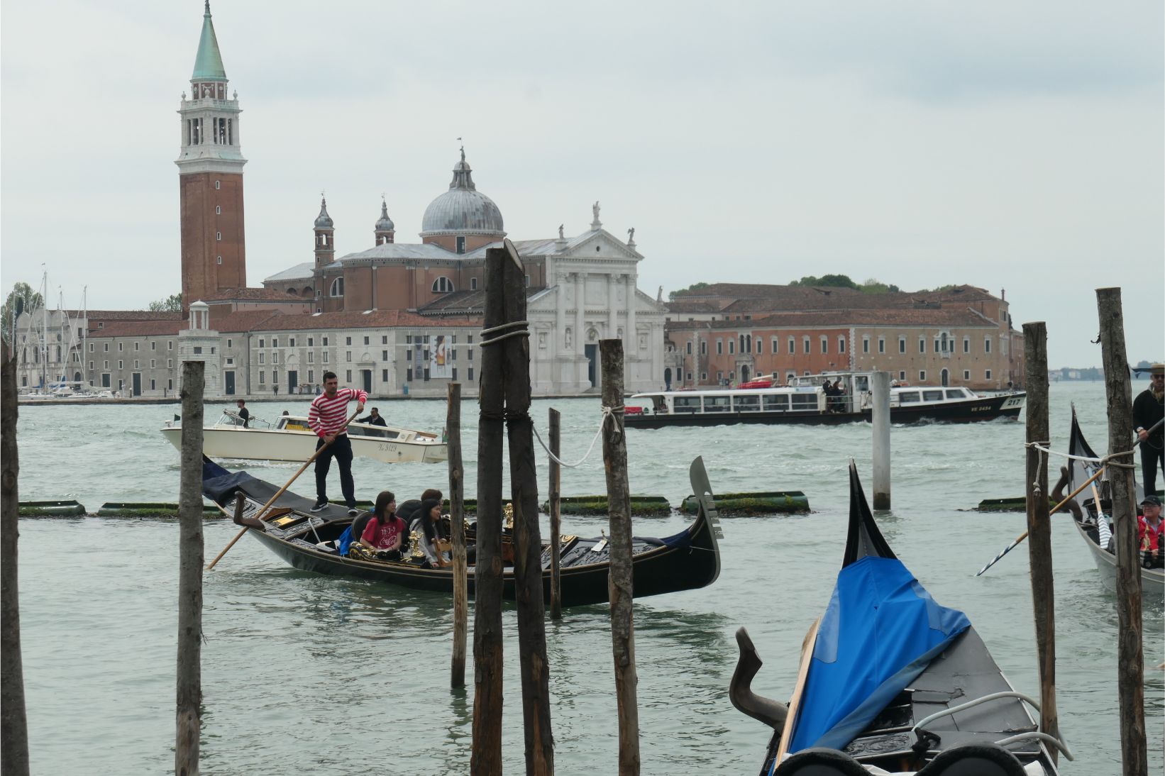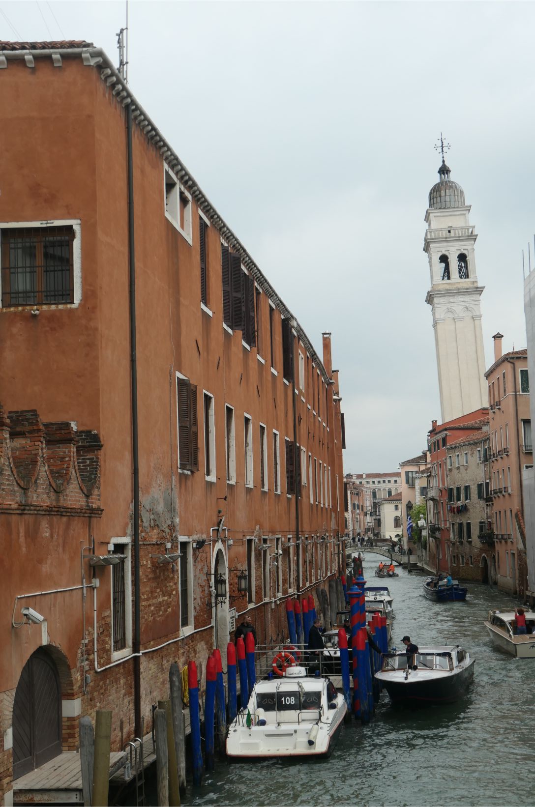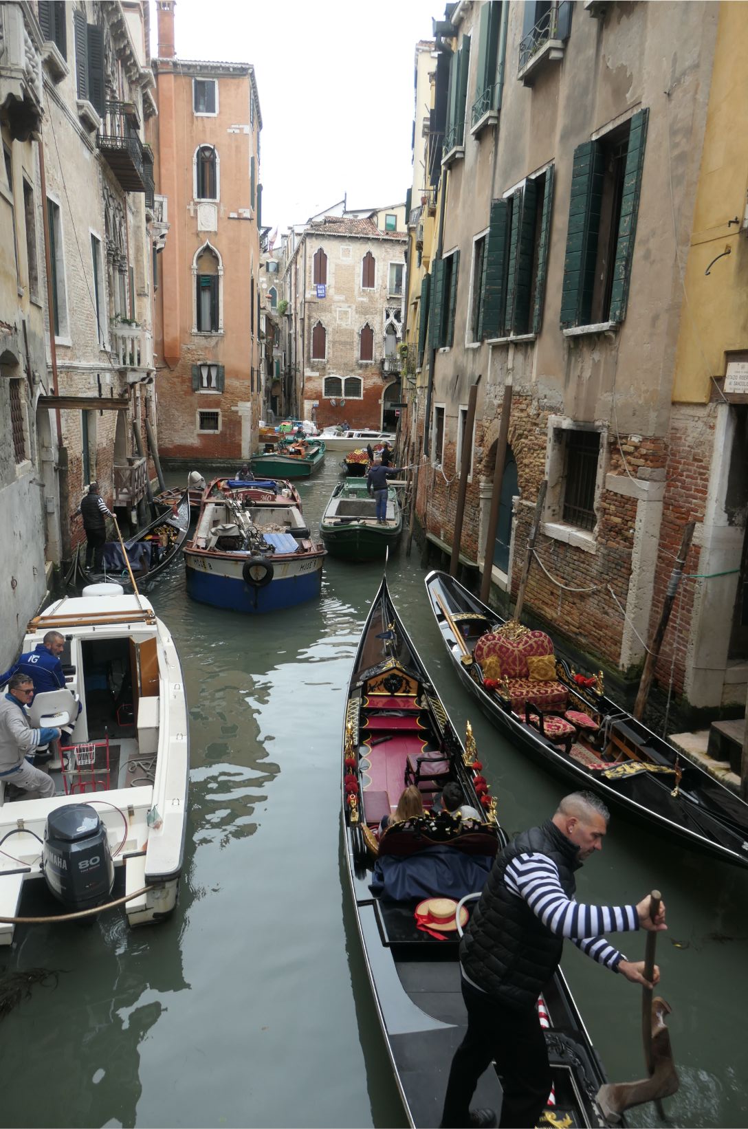 We walked along the waterfront from Piazza San Marco, where the bridges were crowded with selfie-taking tourists. We did a bit of window shopping. We bought ice creams and took them to waterways where we could watch the gondolas passing by. There are gondolas everywhere, as you can see in the photos above. They’re quite expensive at 80 euros per person for half an hour, so we’ll save our money and walk instead. A couple of times we saw them caught up in traffic jams, not moving, as a bigger boat coming the other way forced them to wait patiently for clearance to move. Of course, with so much water here, and only foot traffic on the streets, there are no cars or even bikes here in Venice, so much of the transport of heavy goods is restricted to guys pushing trolleys around, including carefully pushing them up the steps of the bridges and down the other sides. I wouldn’t want to be a truckie in Venice.