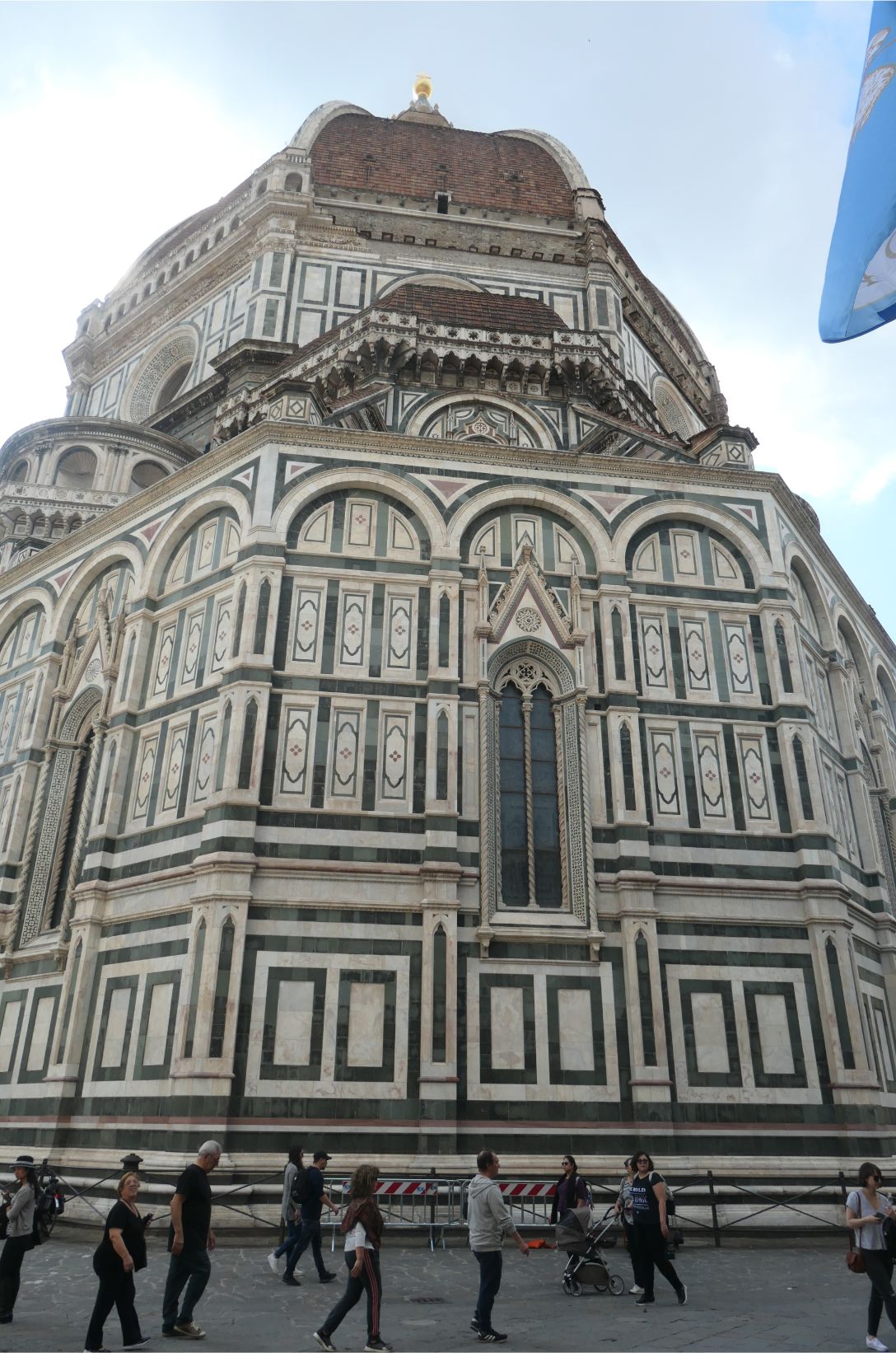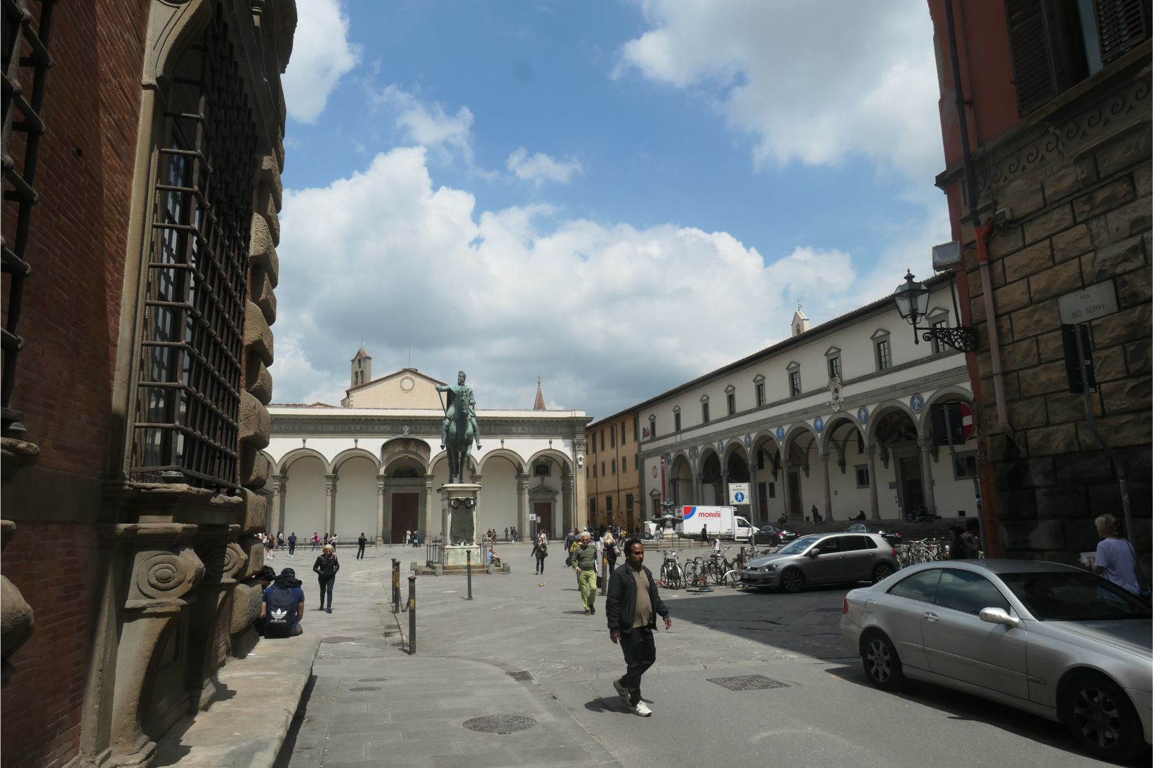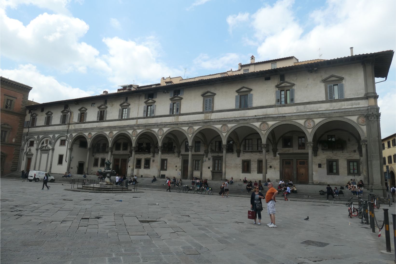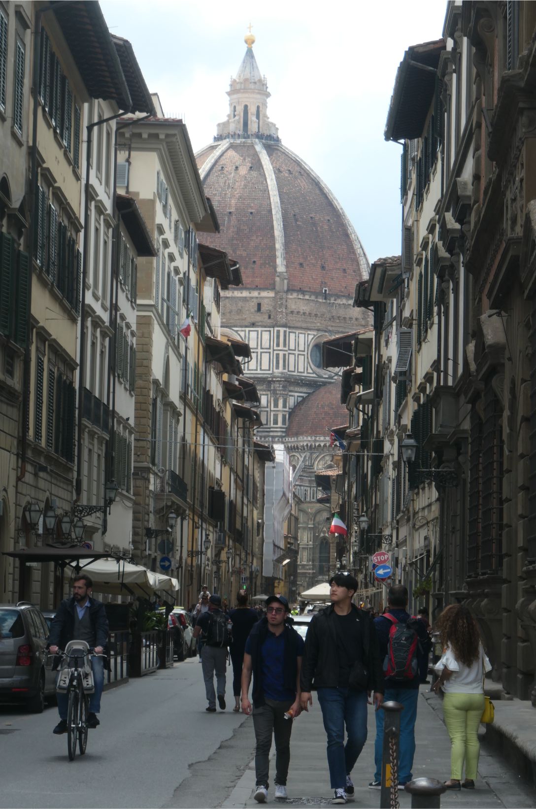 I was really looking forward to seeing our accommodation, as it is our first stay in an AirBnB. I booked the place in a historic area of the city within walking distance of some of the tourist highlights. We weren’t disappointed. As you can see from the set of photos below, it is clean and well stocked with everything we are likely to need during our five night stay. It’s on the ground floor of a large building that occupies one side of the Piazza della Santissima Annunziata, and apparently elsewhere in this building is museum housing Michelangelo’s David. We’ll probably go looking for him tomorrow. As the photos show, the piazza also hosts another museum, a large bronze statue and a couple of fountains. And right at the far end of the street, maybe two hundred metres away, is the Duomo of the Santa Marie Cathedral of Florence. Wow!