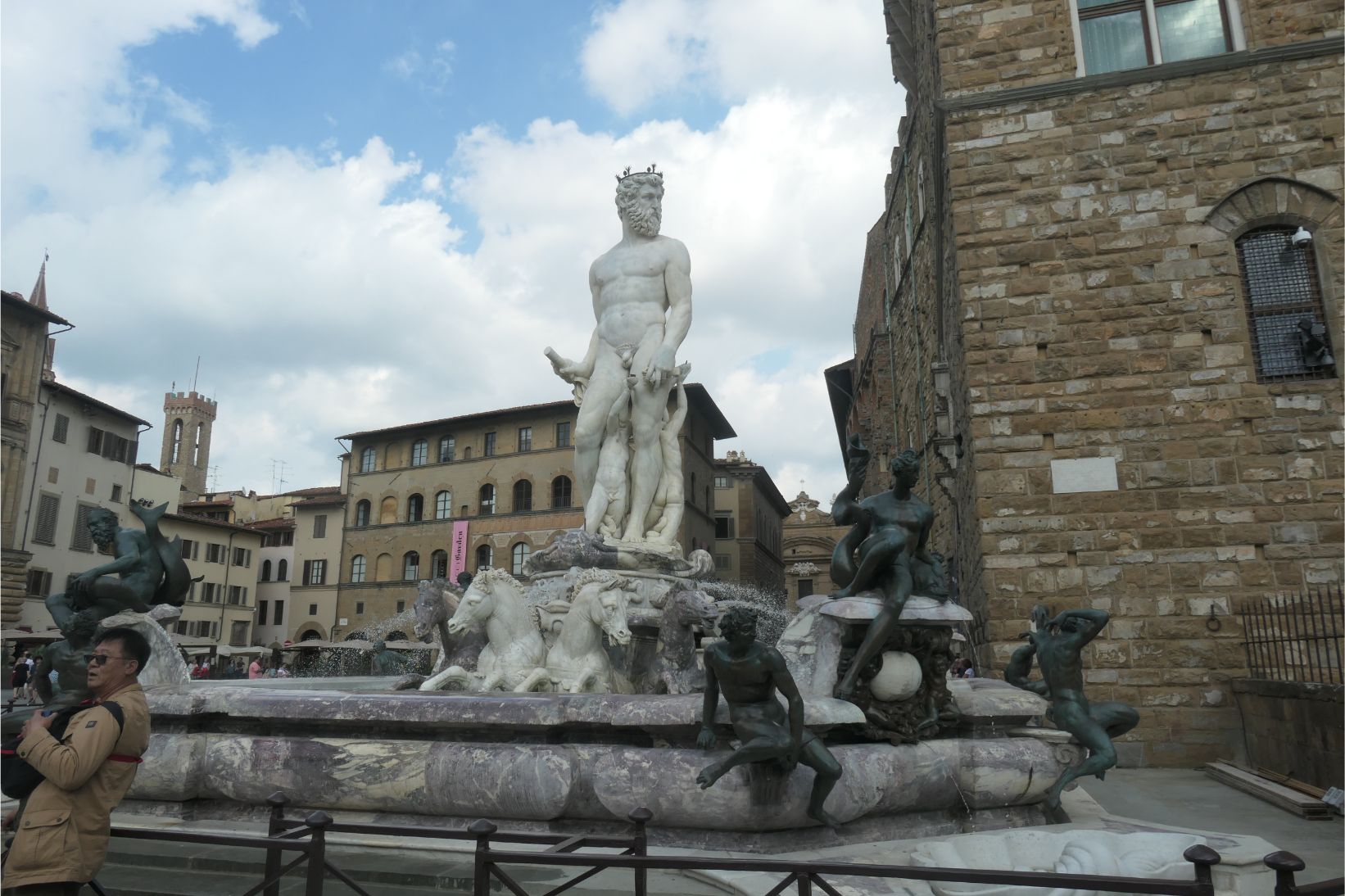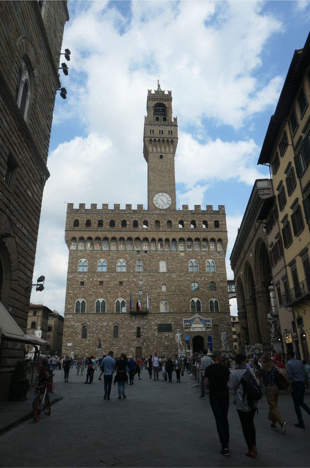 We walked down through the town towards the river, and the next building of interest we passed was the Palazzo Vecchio, with its rather unusual shaped tower. The palazzo has been Florence’s city hall since the medieval era. We’ll try to have a look inside if time permits over the next few days here. And right alongside the palazzo we found the Uffizi, which I’ll write about in my next post.