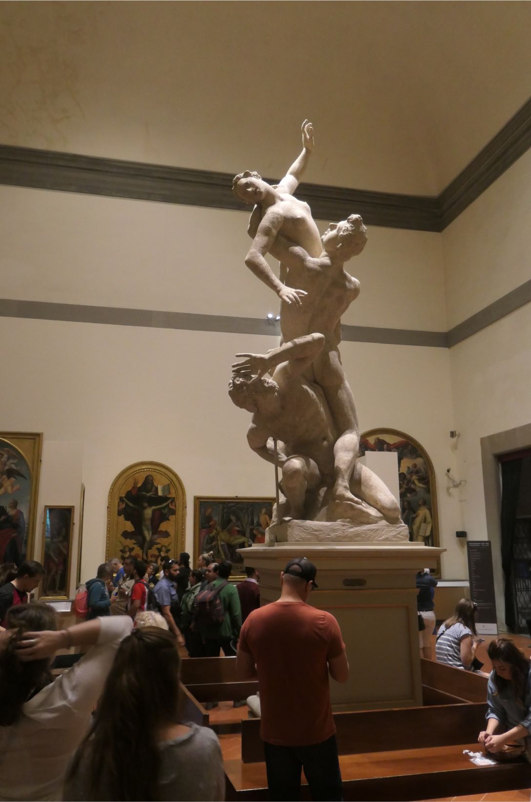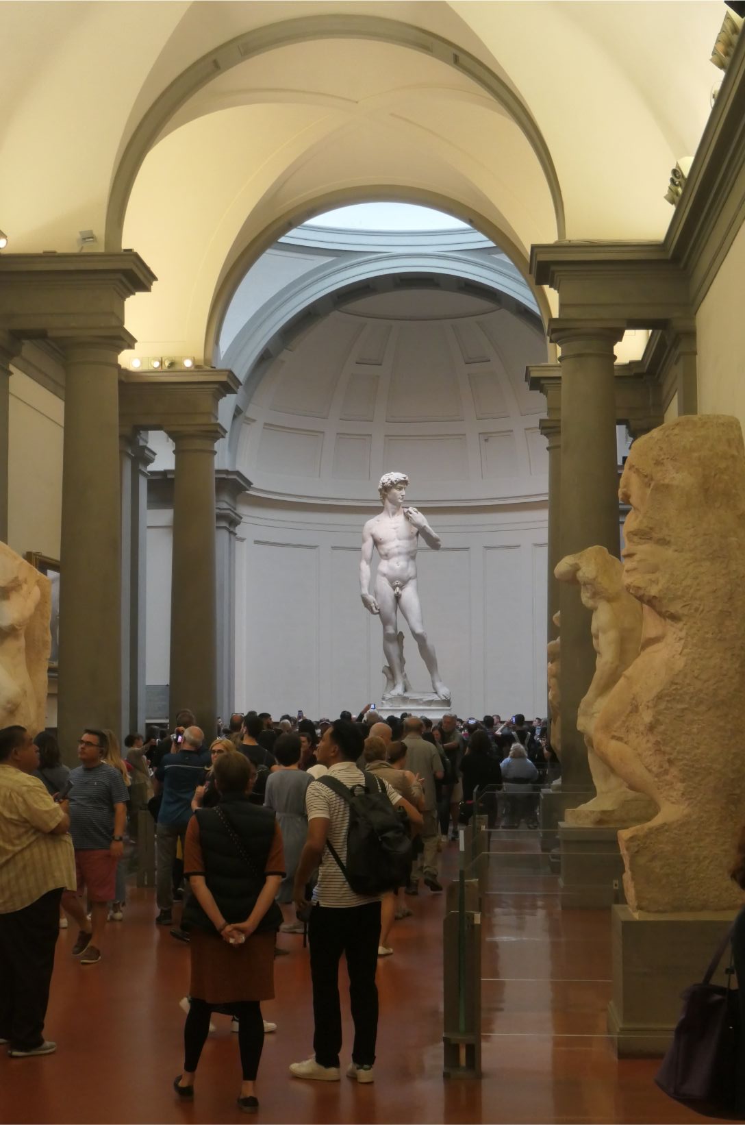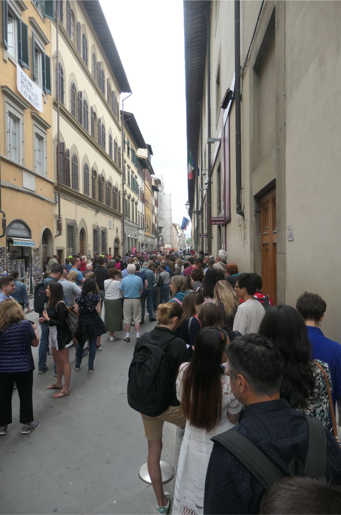 This morning we walked around two corners of the large building on the piazza where we are staying and joined the end of the queue to enter the Galleria dell’Accademia, which is another one of Florence’s art museums housing priceless Florentine Renaissance masterpieces. It was a static queue for most of the time. Every fifteen minutes, the door man counted twenty people and opened the gate for them to enter the building. The skip-the-line queue alongside of us moved just a little faster than we did, kind of like a snail racing a sloth. So, for most of the two hours we stood in line, nothing much happened. We started chatting to the American family behind us and that helped to make the two hour wait a lot more enjoyable.
