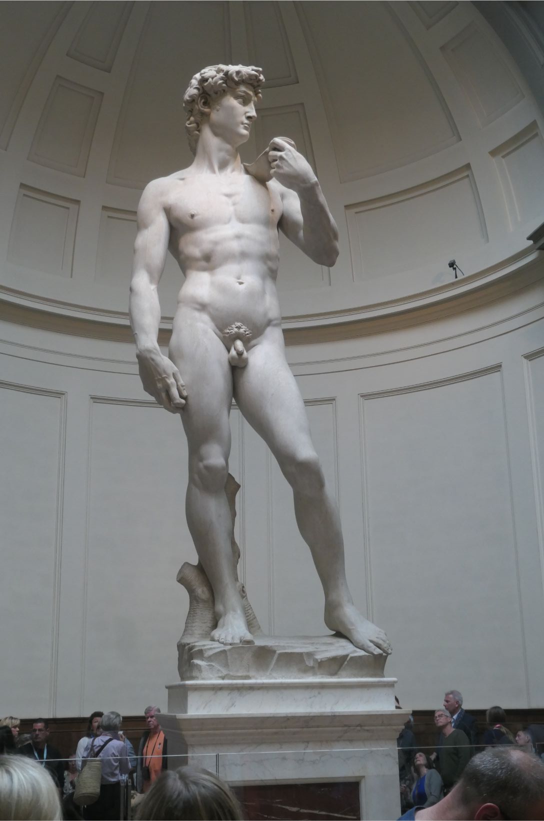 In the next room the first thing I saw was a couple of unfinished huge marble sculptures, clearly Michelangelo creations. I said to Marg, “Hey look at these works. They’re Michelangelo’s,” to which she replied, “of course, look what’s down there.” I shifted my gaze to the other end of the gallery and there was David on a raised plinth in all his naked glory. It really was a stunning sight. He is every bit as magnificent as he has appeared in all the photos I’ve seen and art books I’ve read. David is a monumental work in every sense. We took our time and walked slowly around him. The two hours spent waiting in line now seemed totally like time well spent.