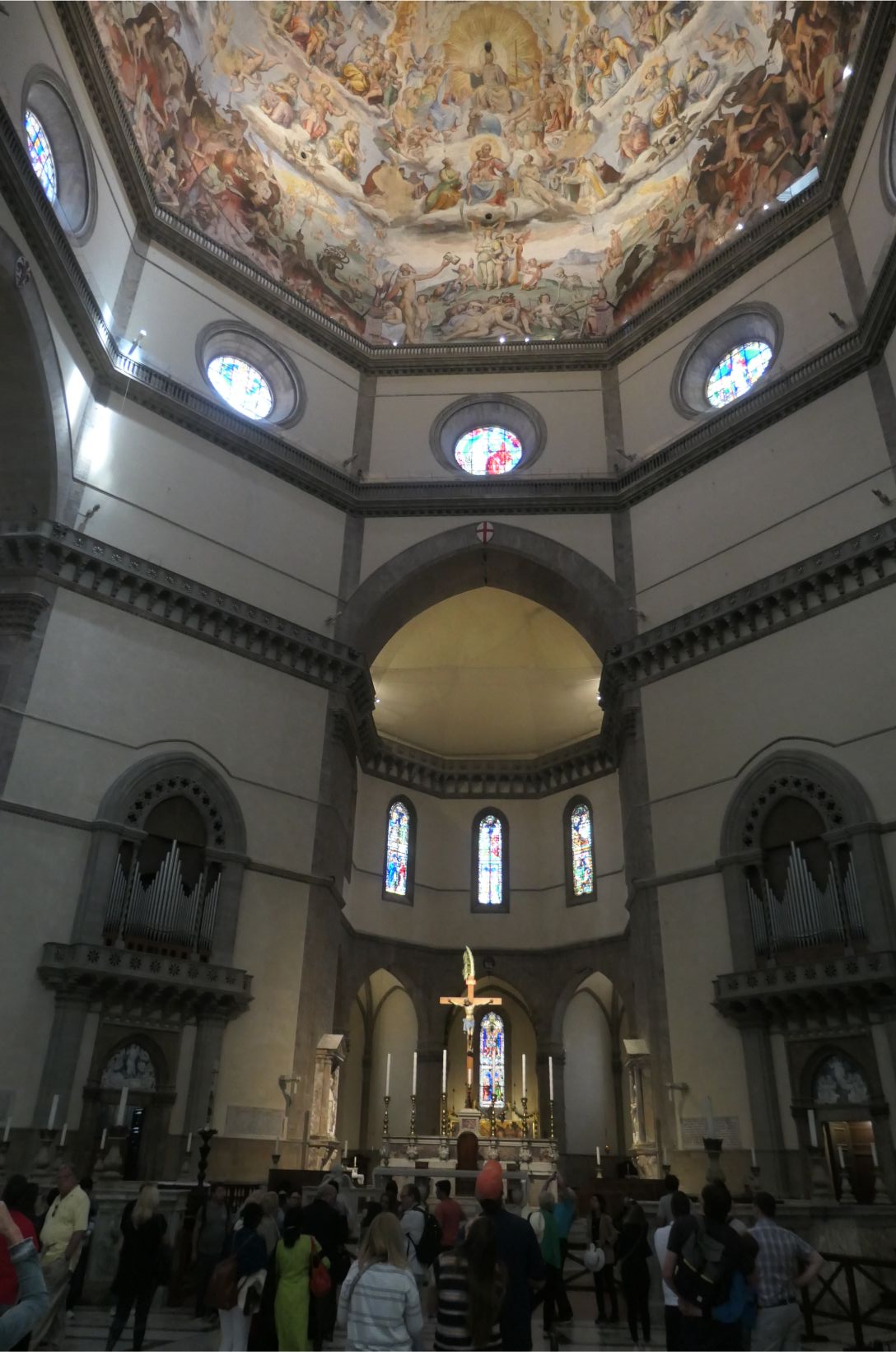 We walked down the Santa Marie Cathedral and joined another long line, though one which moved a good deal faster than David’s queue. It probably only took about ten to fifteen minutes to gain entry to the cathedral. Like others we have visited in recent times across Europe, it was a vast space inside with high walls and a ceiling so high you couldn’t imagine how anyone in medieval times could ever build it. But its interior decoration was quite sparse in comparison with other cathedrals we’ve visited and there were large areas of wall space that had no paintings or other forms of artwork on them at all. Instead, it was the painted ceiling of the inner dome of the Duomo that captured everyone’s attention.