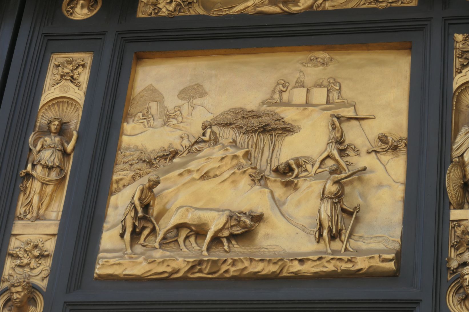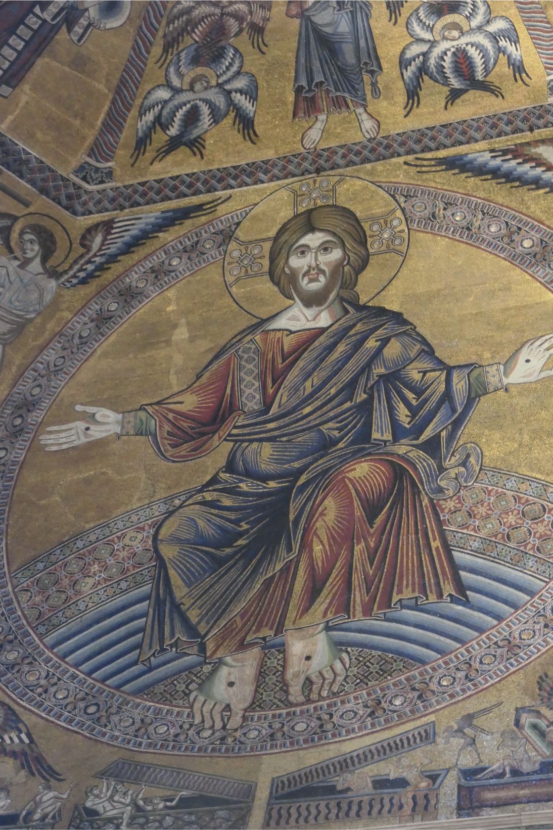 We left the cathedral and entered the adjacent baptistry. This earlier building also featured an octagonal dome-like ceiling that may have inspired Brunelleschi and his colleagues when they were planning the design for the Duomo. It was under restoration when we visited, but we were able to see some untouched sections of the ceiling, and, like everything we have seen here in Florence, they were quite remarkable.