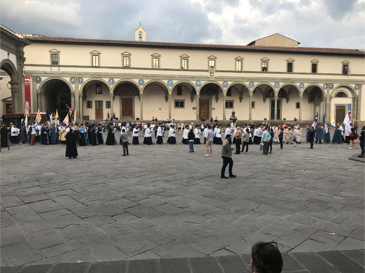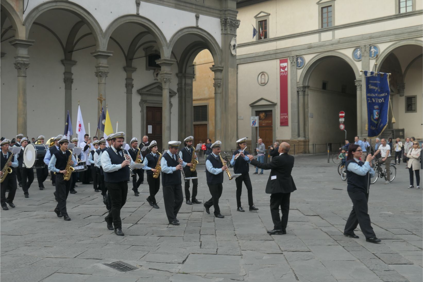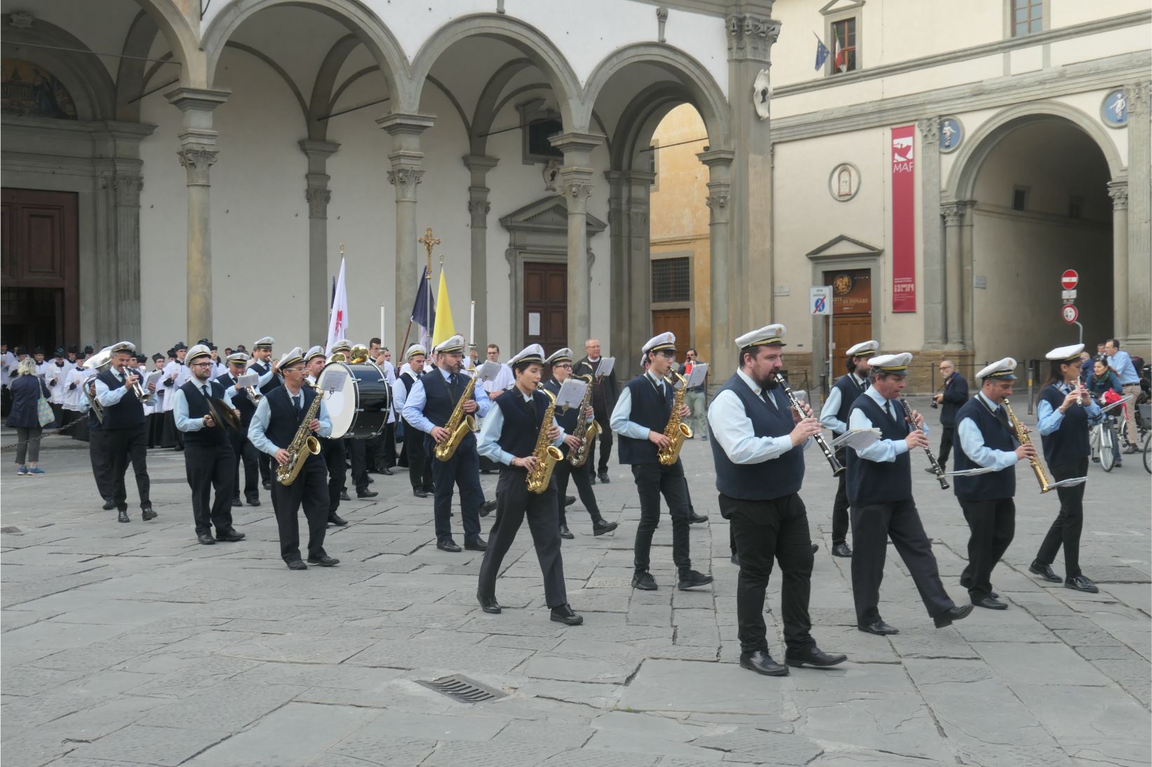 We stopped and ate dinner in a restaurant near the Palazzo Vecchio on our way home from the Boboli Gardens, then walked home to our piazza. As we entered the piazza we could see a marching band in uniform assembled with their instruments in front of the Basilica of the Santissimo Annunziata. We only had to wait five minutes when they began to play and march in the direction of the Duomo.