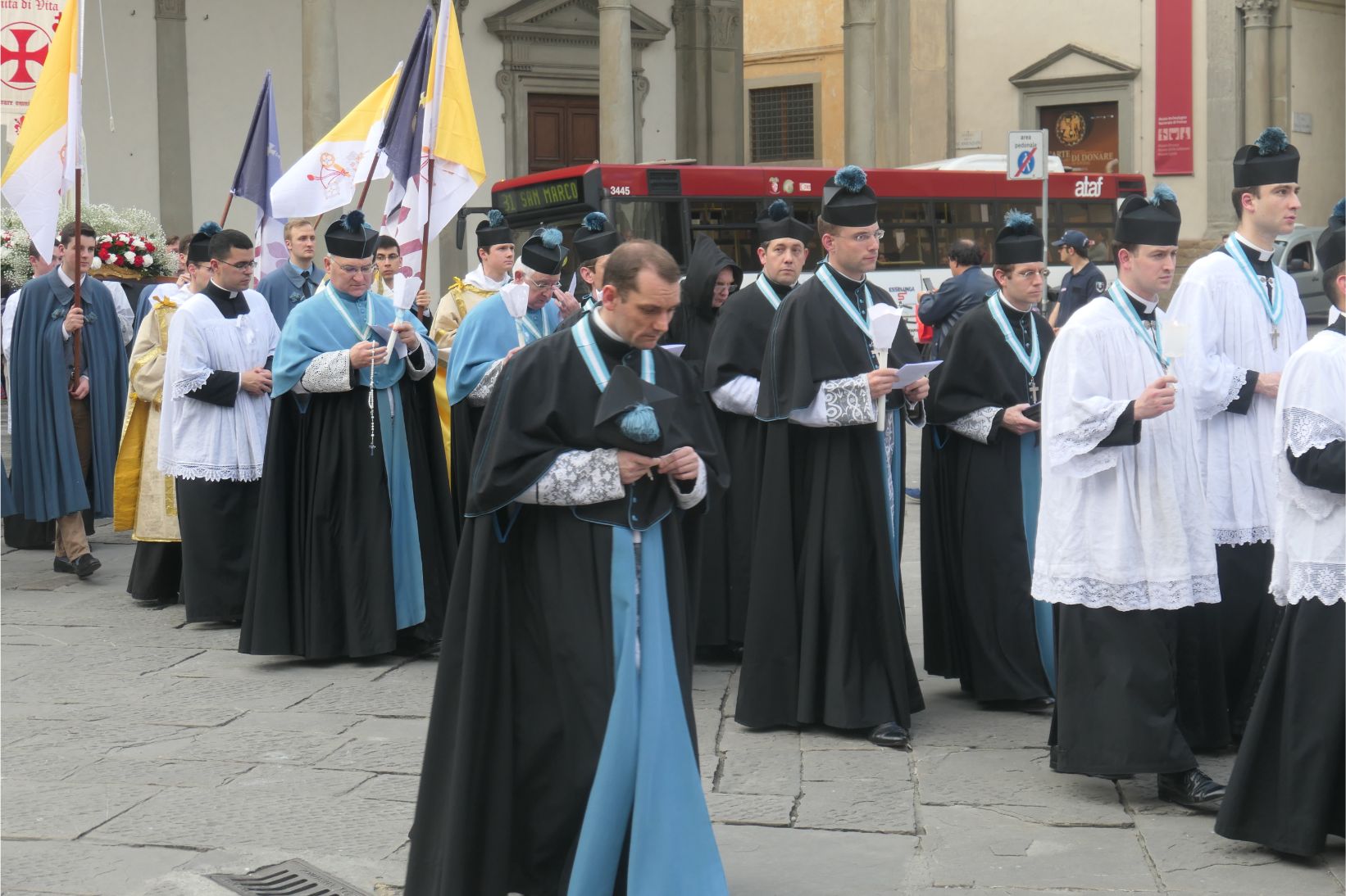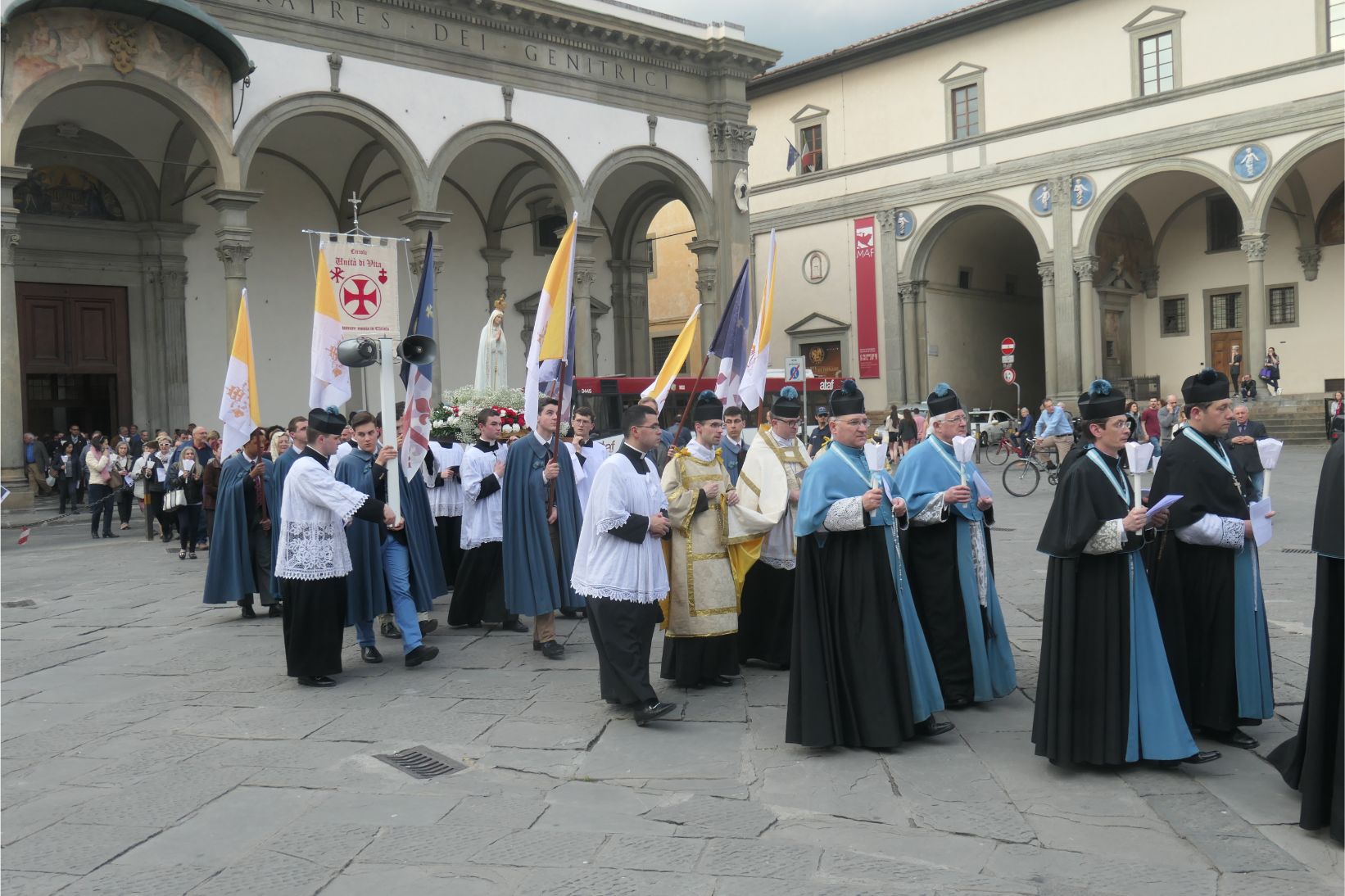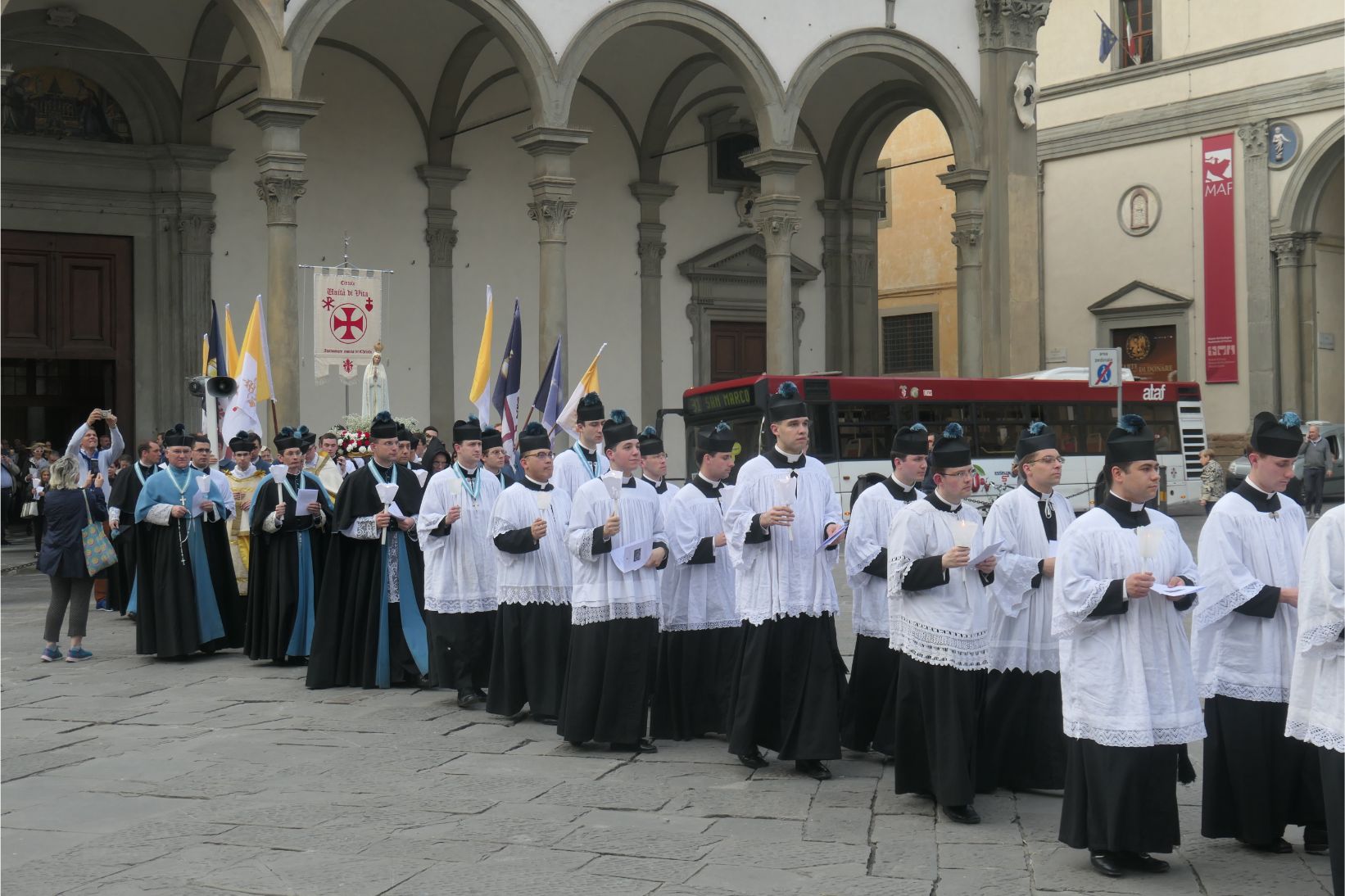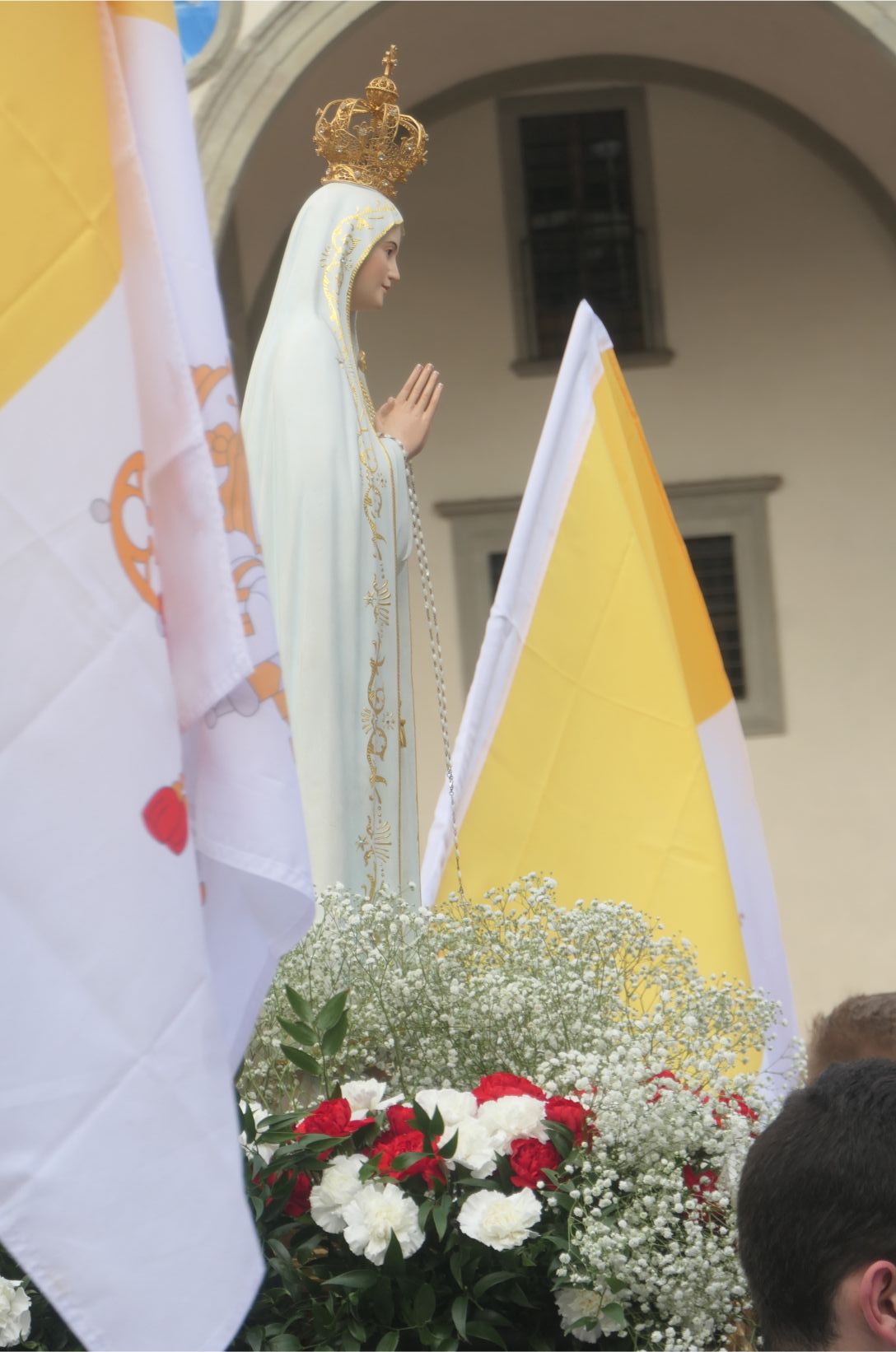 Immediately behind, all in their religious robes and vestments, marched a procession of people emerging from the door of the basilica. I don’t know the roles of the different groups in the procession, so I cannot describe them here, but some appeared from their dress to be quite important, and some carried banners. In the midst of the procession an icon of the Virgin Mary, surrounded by banners and flowers, was carried. Lay parishioners brought up the tail of the procession as the march continued down the street towards the Santa Maria Cathedral.