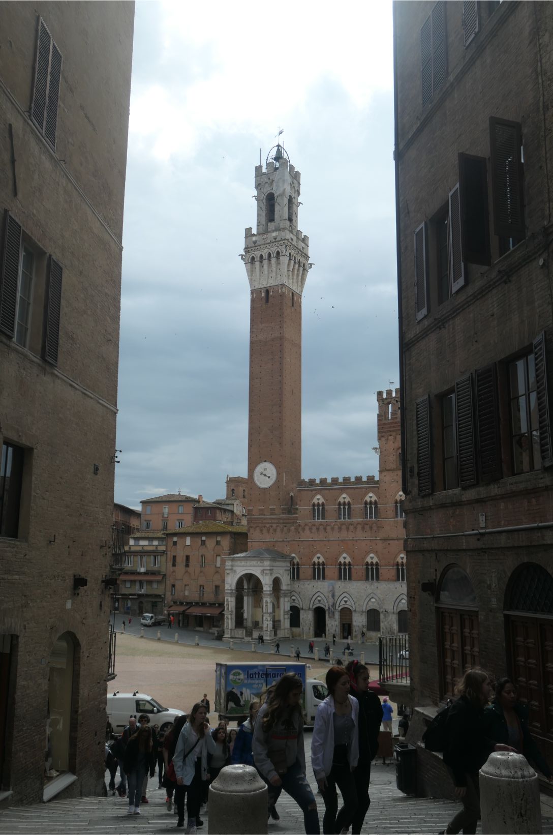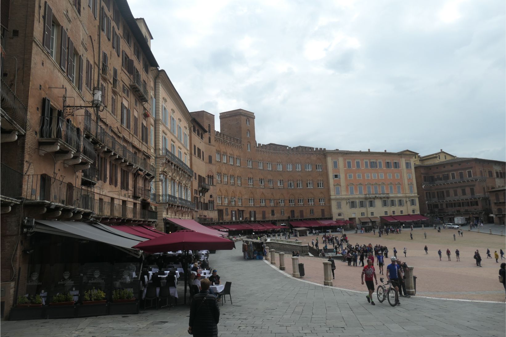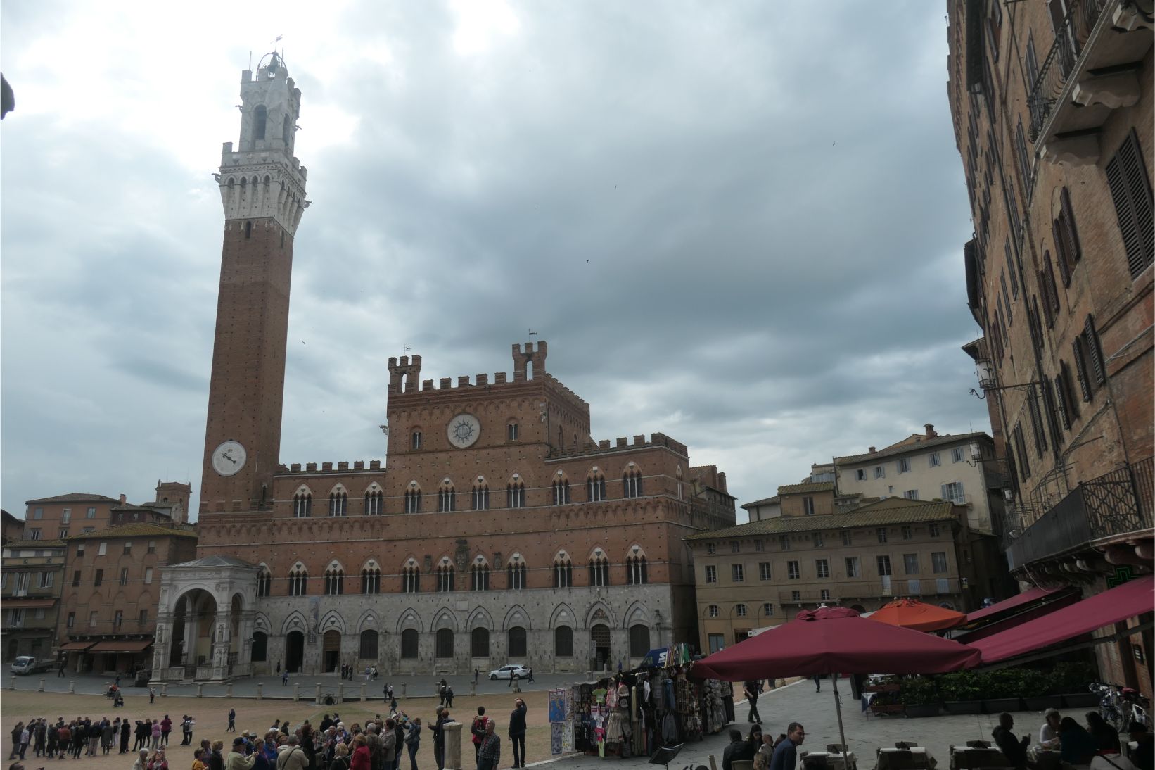 For our final day in Florence, Marg and I were booked on a twelve hour bus tour of three locations in Tuscany – Siena, San Gigminano and Pisa. We had to set the alarms early as we had to walk to the bus stop past the railway station and be there by 7.25am. Our tour bus was filled to capacity with 61 people plus our tour guide. Soon after we left Florence we were driving through the easily recognisable Tuscan landscape – rolling green hills dotted with red poppies, olive groves and vineyards, large hilltop houses in shades of yellow surrounded by tall cypress trees, or small rustic cottages gathered together in villages.