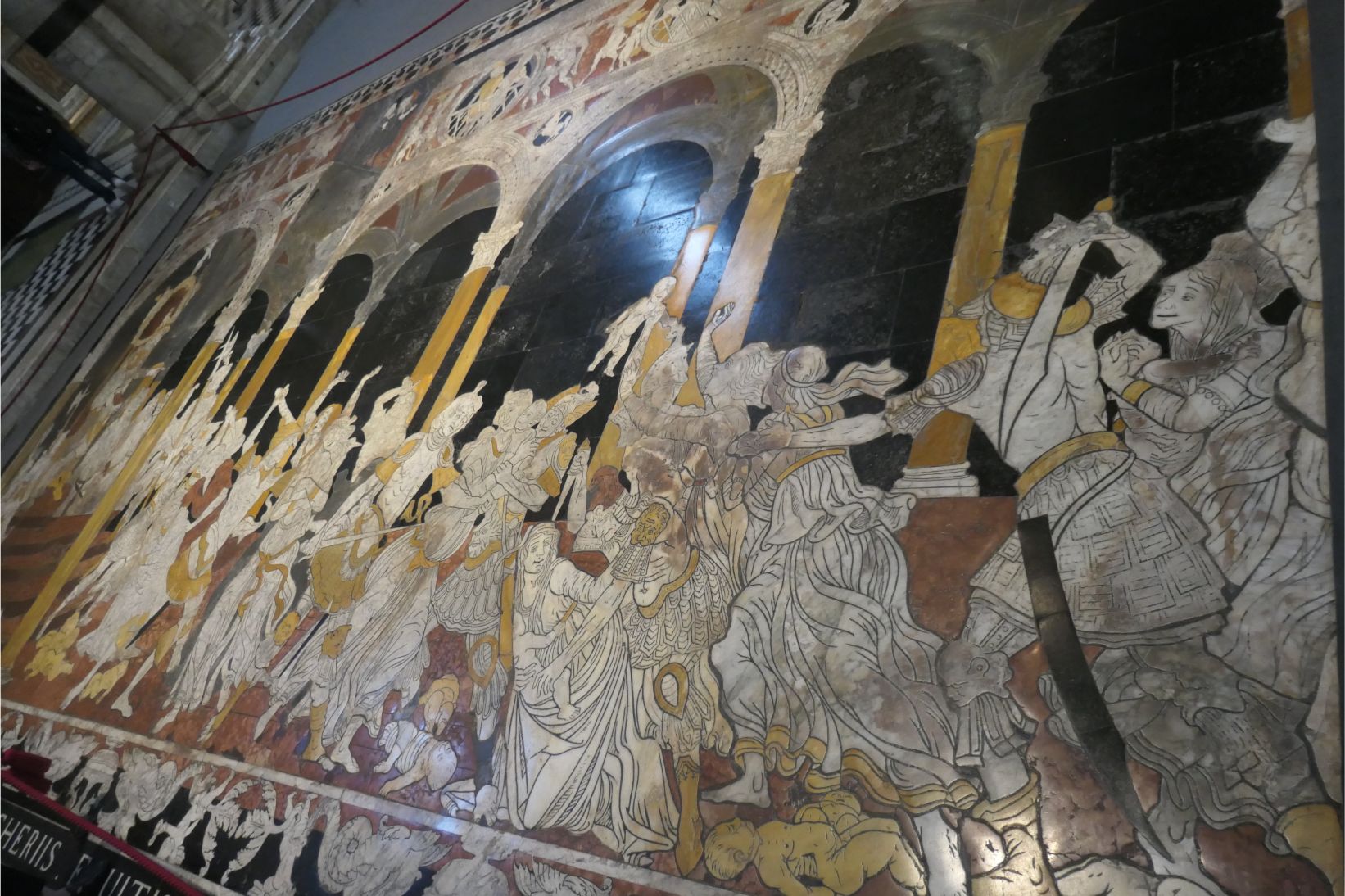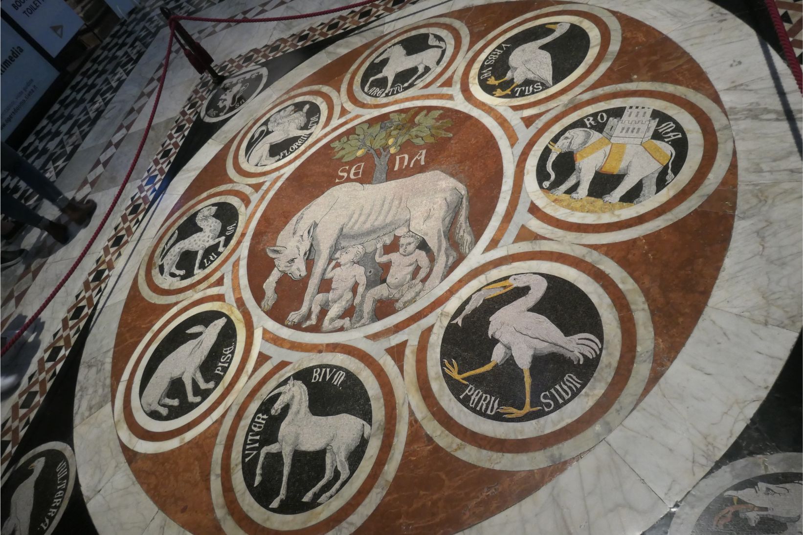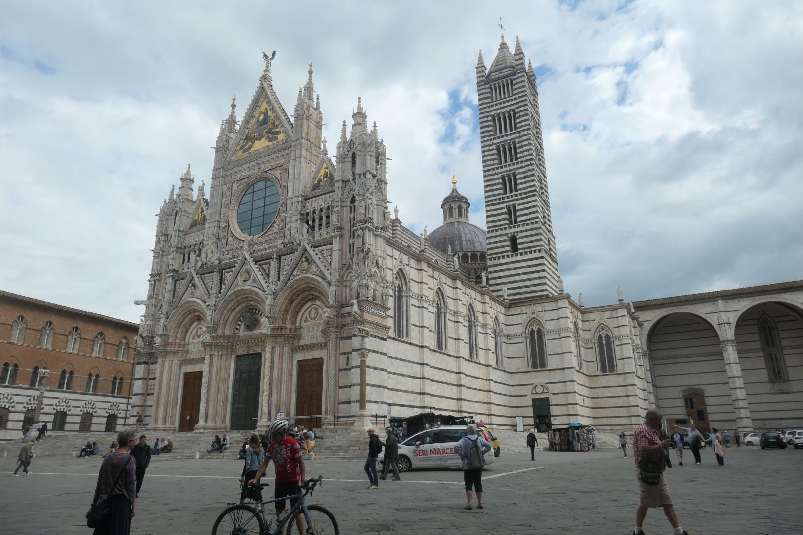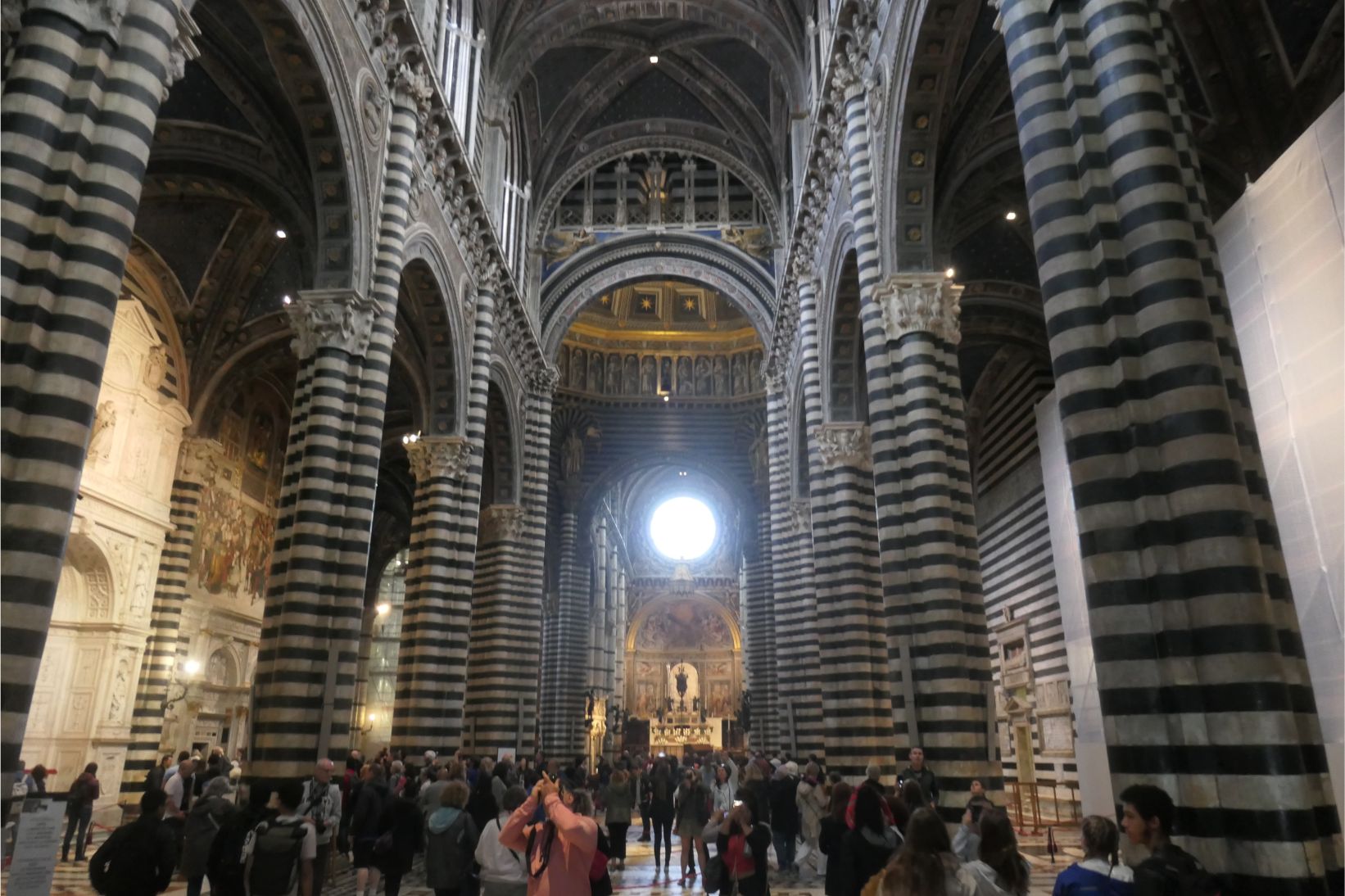 After our coffees, we repeated the steep uphill climb to the cathedral, as it was approaching 10.30am, opening time. We had to stand in a long, slow queue, and for a time we wondered if we would even gain entrance before it was time to return to our bus. Eventually we made it into the cathedral, but we were left with only ten minutes to explore and enjoy it. The most stunning features for me were the stripes of white marble and greenish-black marble that distinguish Siena’s church from any others we’ve seen here in Europe. Additionally, the inlaid marble mosaic art that covers virtually the entire floor of the cathedral is quite exceptional. Sadly, we could not stay too long, and we moved back through the town quite quickly to the bus, regretting the fact that we could not stay longer. We both agreed that we would have liked to spend two or three days in Siena. It really appealed to us.