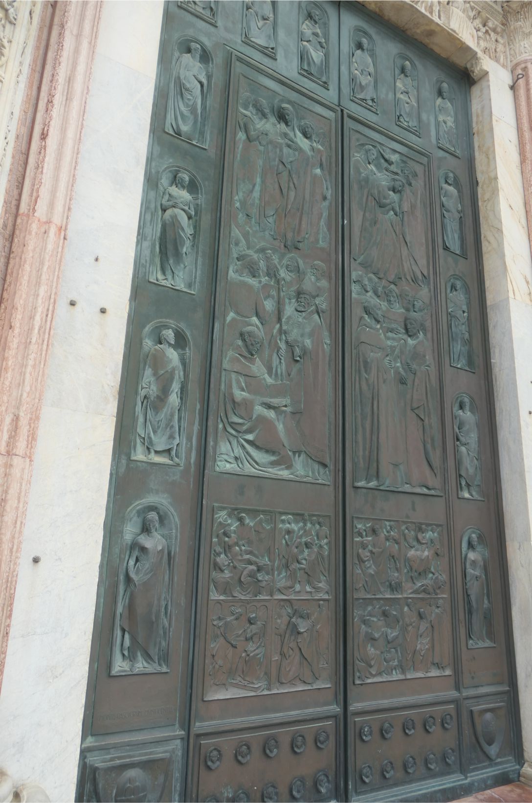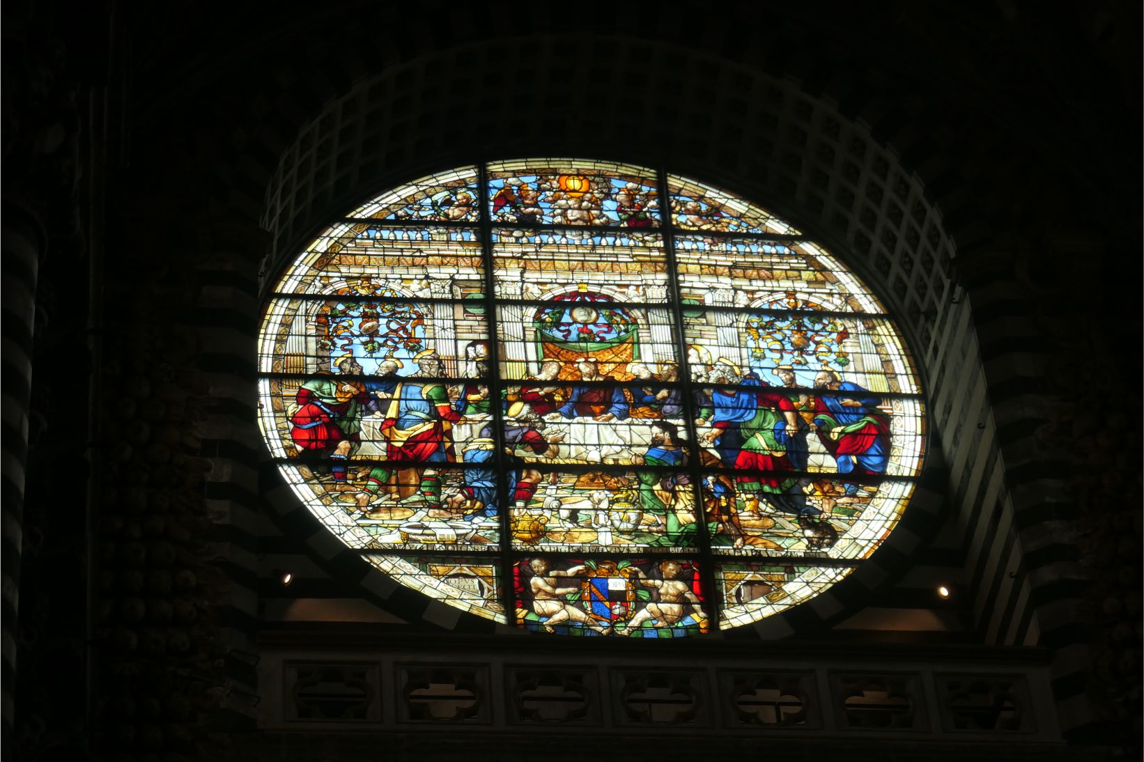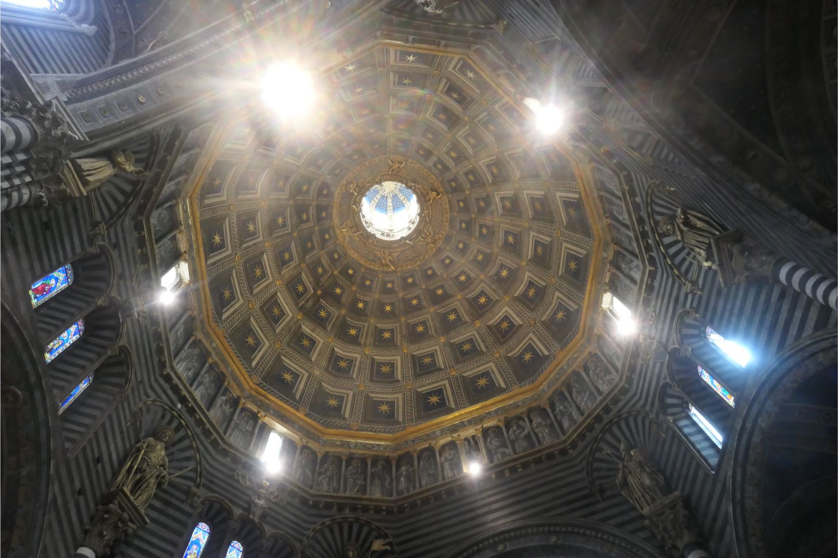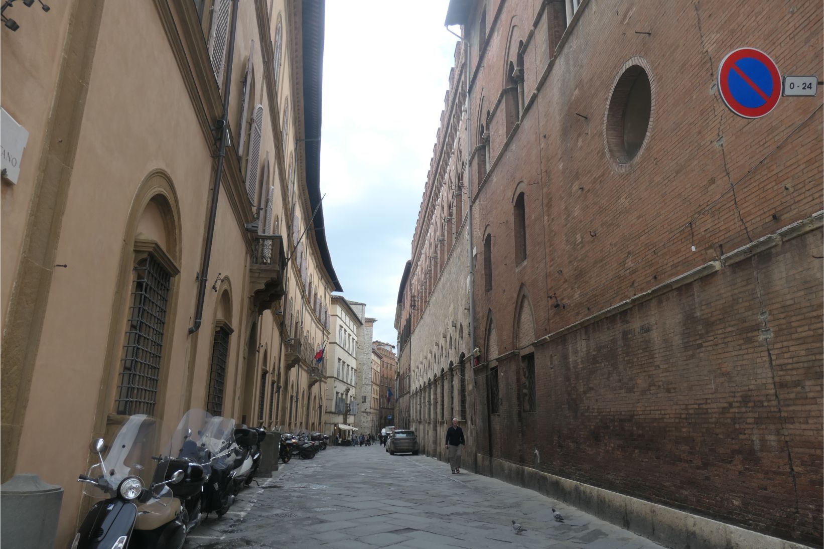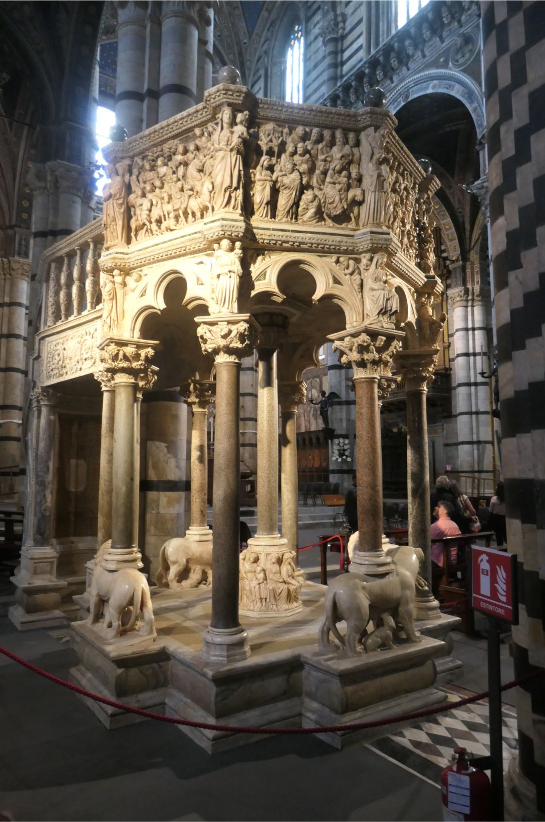 After our coffees, we repeated the steep uphill climb to the cathedral, as it was approaching 10.30am, opening time. We had to stand in a long, slow queue, and for a time we wondered if we would even gain entrance before it was time to return to our bus. Eventually we made it into the cathedral, but we were left with only ten minutes to explore and enjoy it. The most stunning features for me were the stripes of white marble and greenish-black marble that distinguish Siena’s church from any others we’ve seen here in Europe. Additionally, the inlaid marble mosaic art that covers virtually the entire floor of the cathedral is quite exceptional. Sadly, we could not stay too long, and we moved back through the town quite quickly to the bus, regretting the fact that we could not stay longer. We both agreed that we would have liked to spend two or three days in Siena. It really appealed to us.