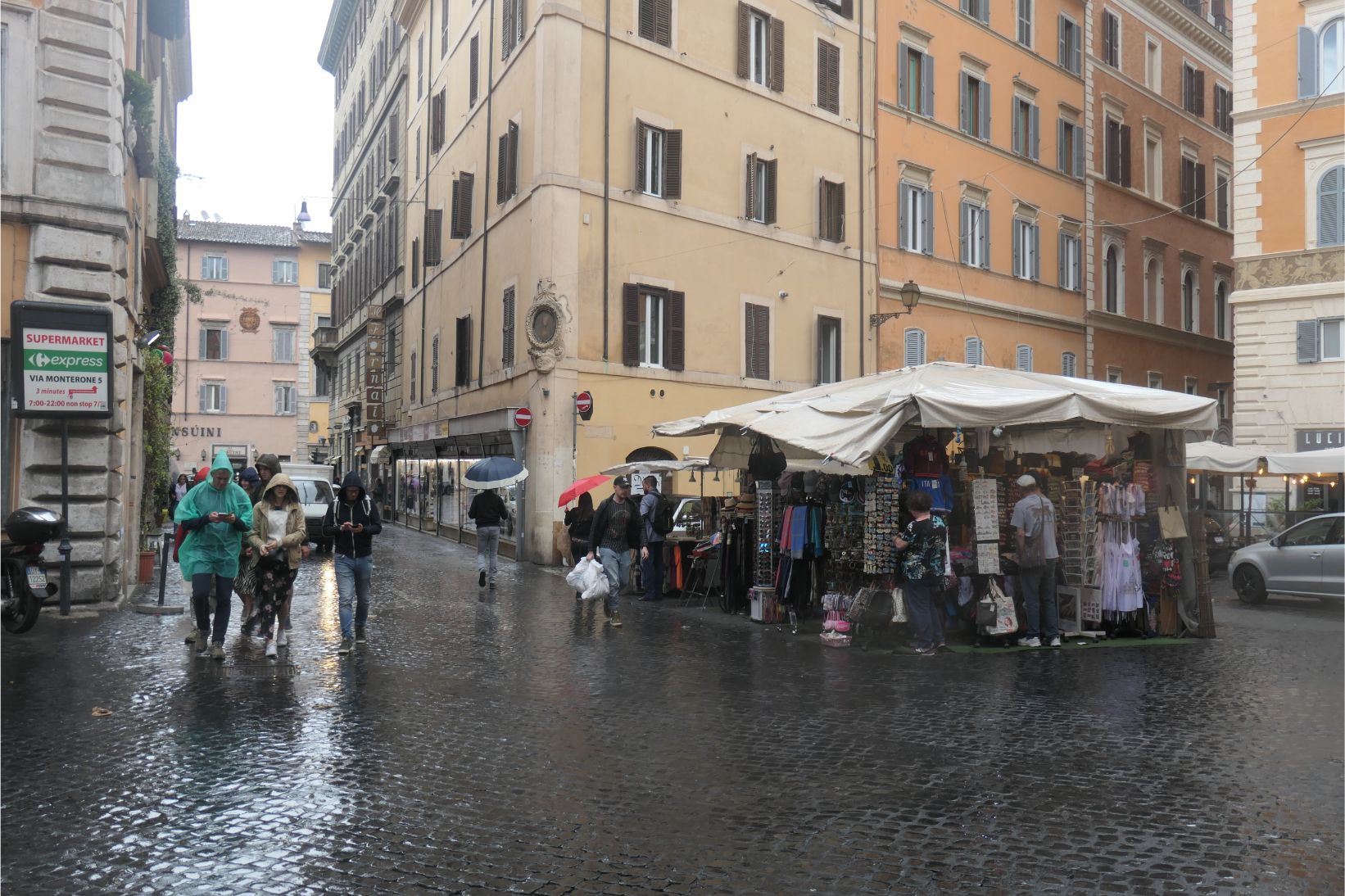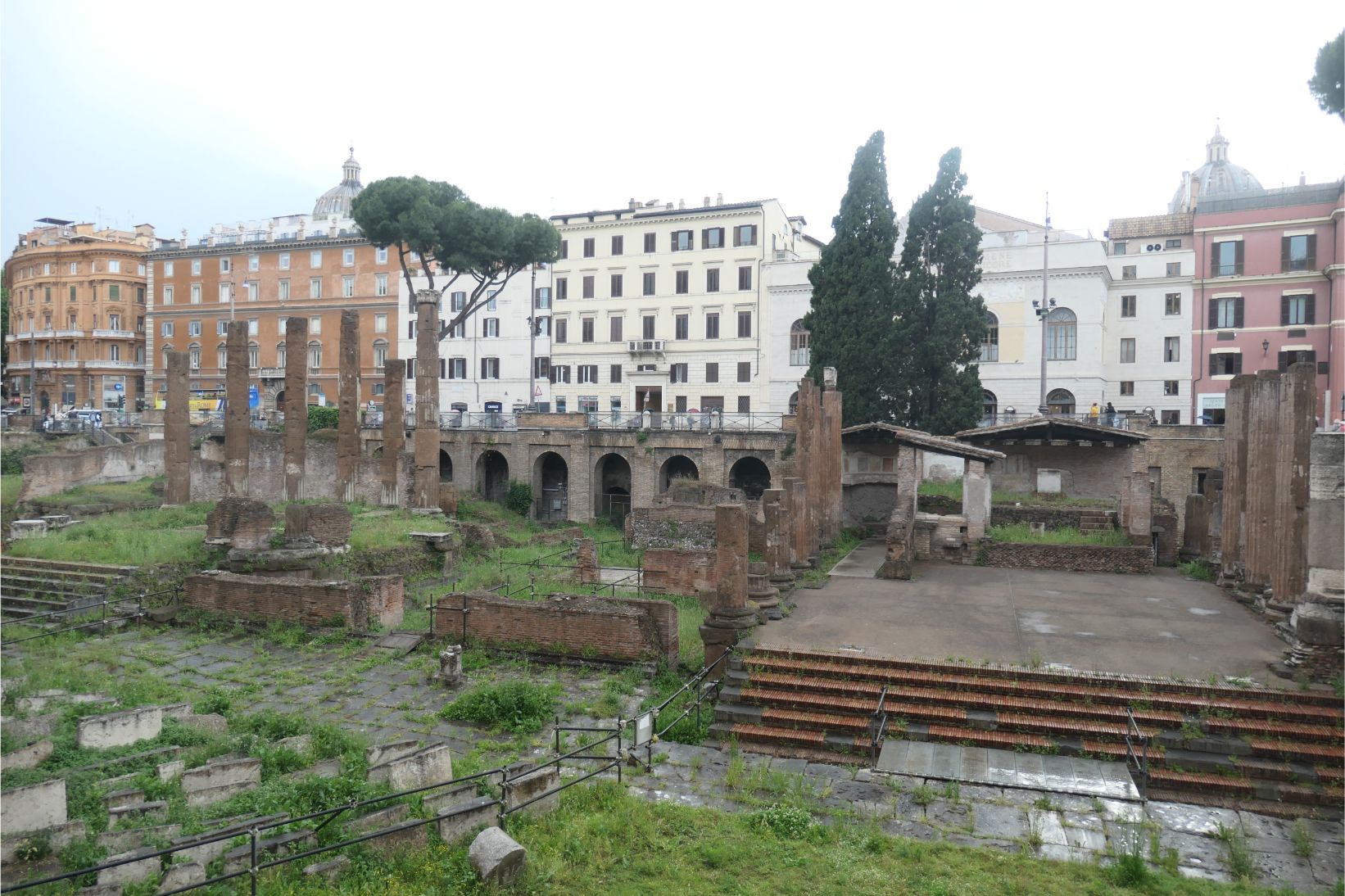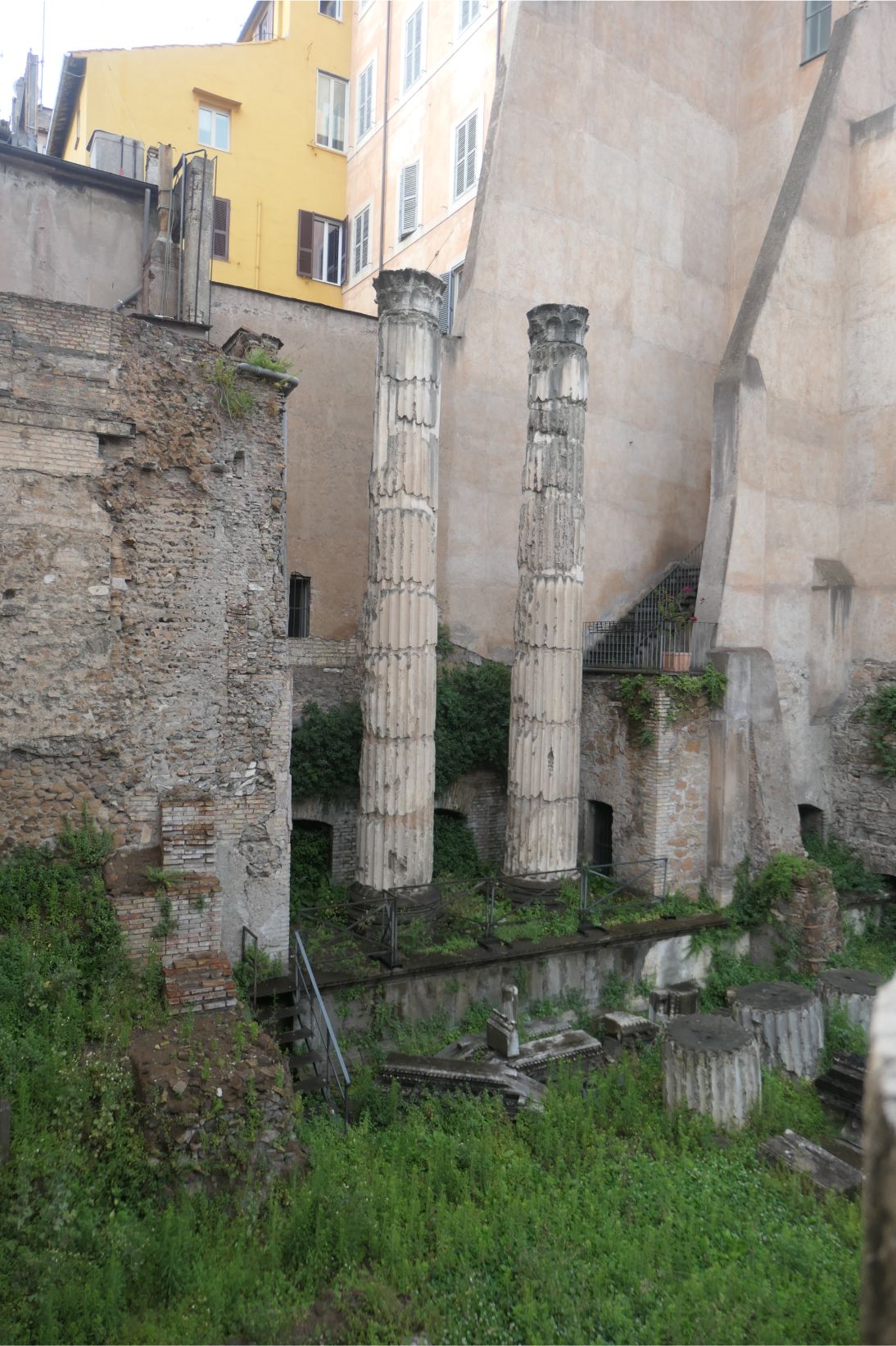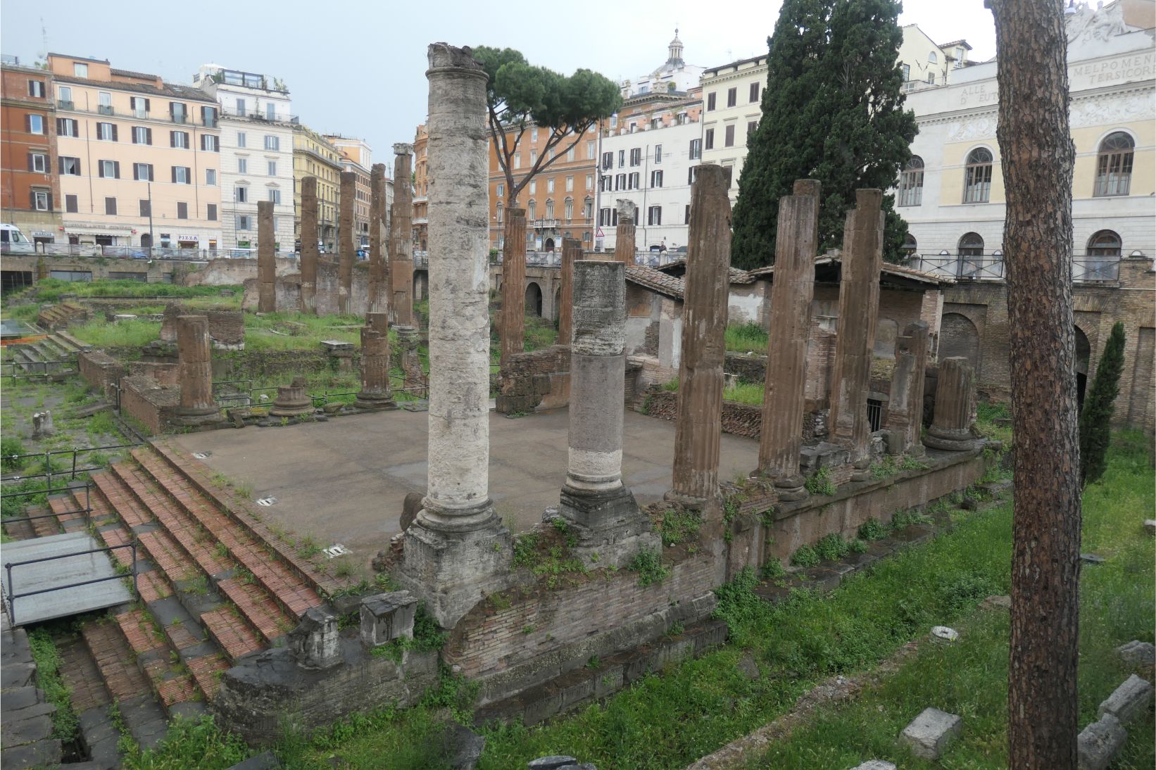 A little further down the road we came across our first Roman ruins at Largo di Torre Argentina. In this square are the remains of Roman temples and Pompey’s Theatre. A few columns and arched walls still stand, while others lie where they’ve fallen over the years. We didn’t stop for long here as it was still raining. In nearby streets we passed other Roman relics.
