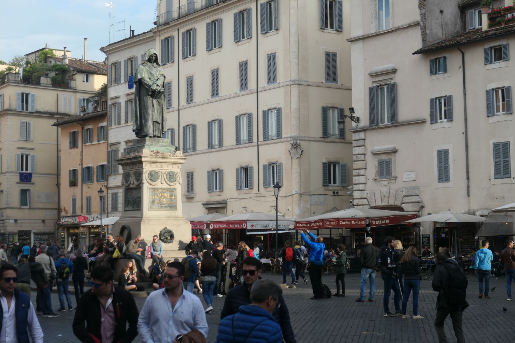 The sun was shining as we made our way back to the apartment. The Hare Krishnas were singing and dancing near the Argentina ruins. As we walked back through the Campo de’ Fiori piazza, the sunlight fell on the statue of Giordano Bruno, a Dominican friar who proposed theories about the structure of the universe, who was burned at the stake for heresy in this piazza in 1600. The gloomy, brooding nature of the statue is indicative of Bruno’s tragic fate.