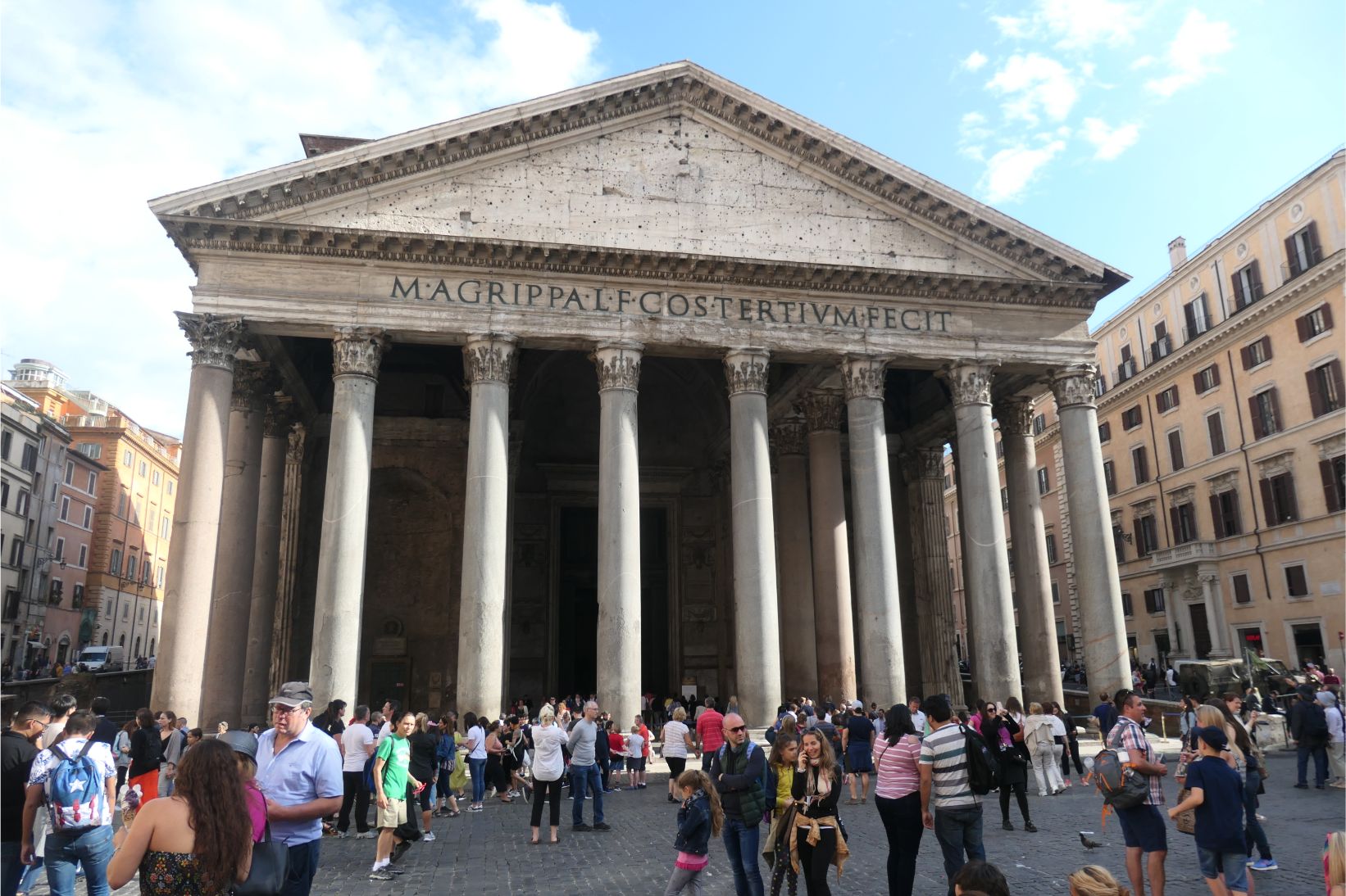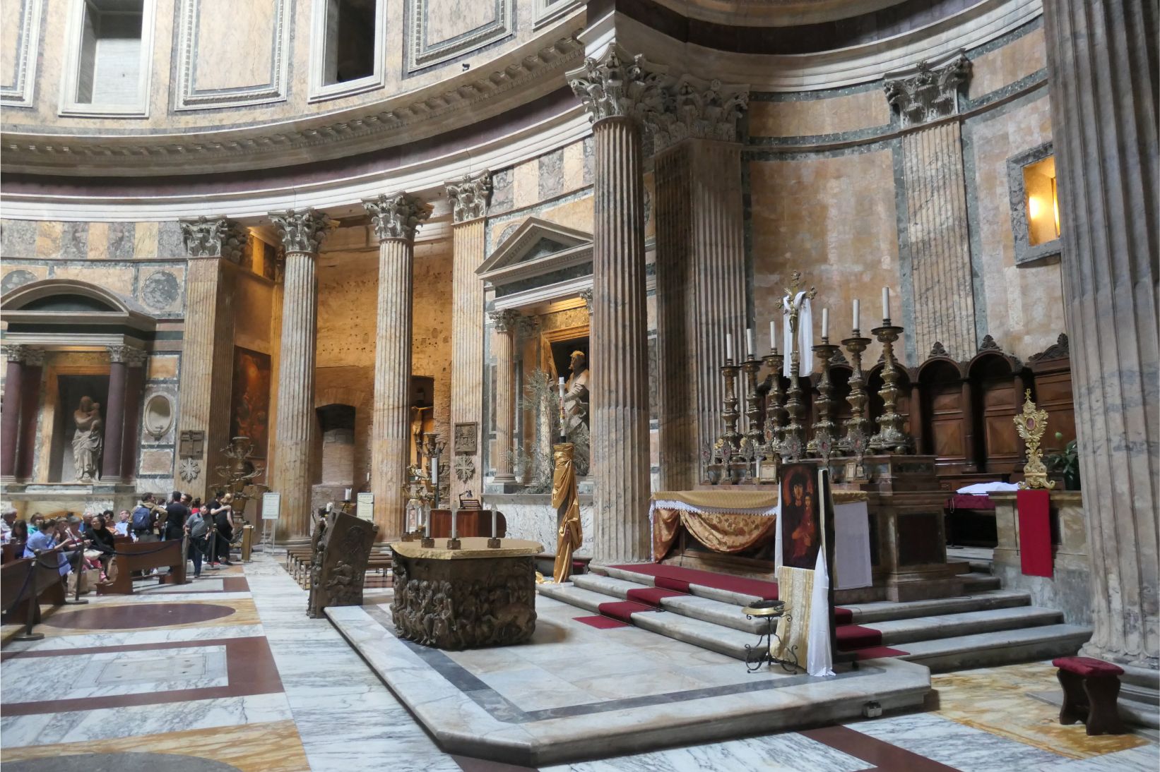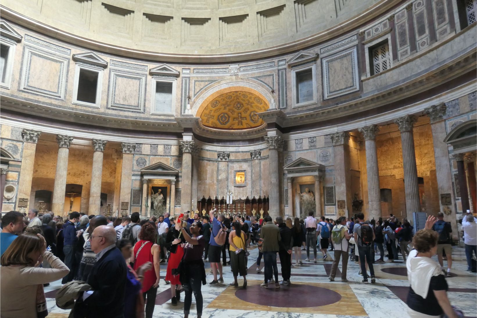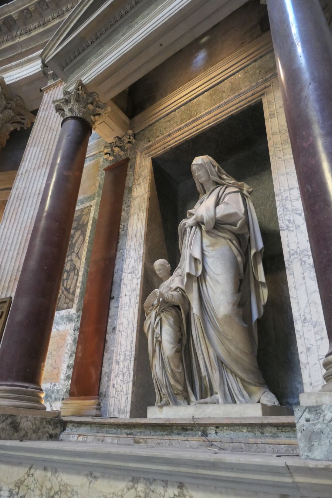 The Pantheon was our final stop. They say it is the best preserved example of a Roman building in this city. It was once a temple, but now it is a church. It has a really interesting dome-shaped roof. There is a large hole in the centre of the dome where the rain comes in. There are small holes in the centre of the tiled floor for the rain water to drain away. Although not quite as ornate as some of the grander churches and cathedrals we’ve visited, the Pantheon still has much to admire, with its beautiful sculptures and massive columns.