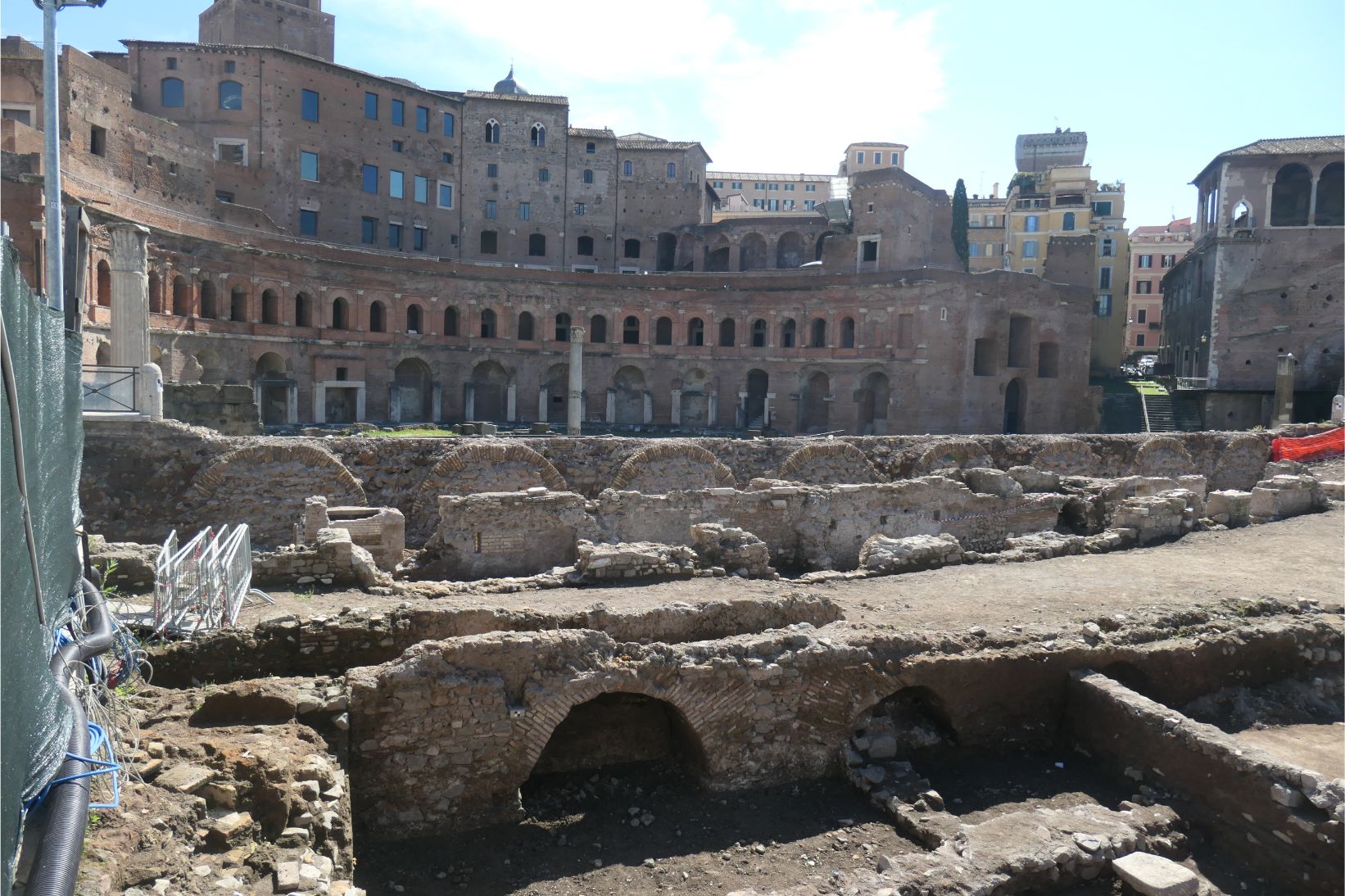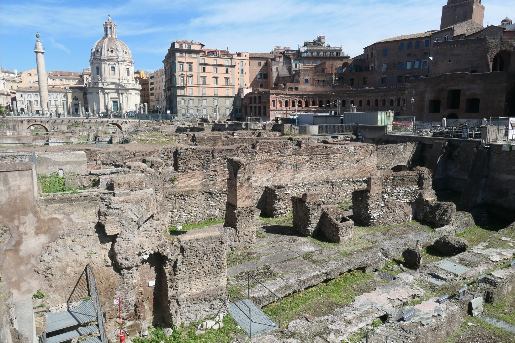 We stopped at a few places along the Via del Fori Imperiali to view the antiquities to our left. The most visually stunning of them was Trajan’s Column, constructed to commemorate his victories in two wars. It is decorated with a continuous frieze that winds round and round the column a total of twenty-three times and measures around two hundred metres in length. The column towers over the ruins of Trajan’s Forum, some parts of which remain standing today.