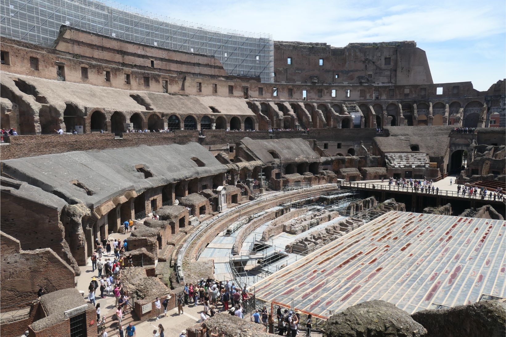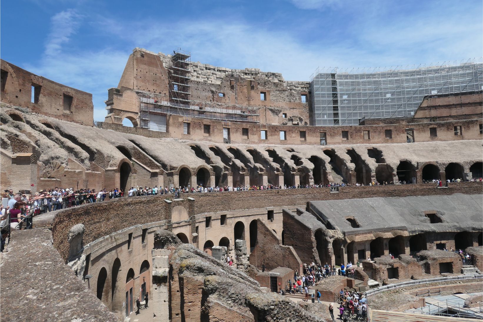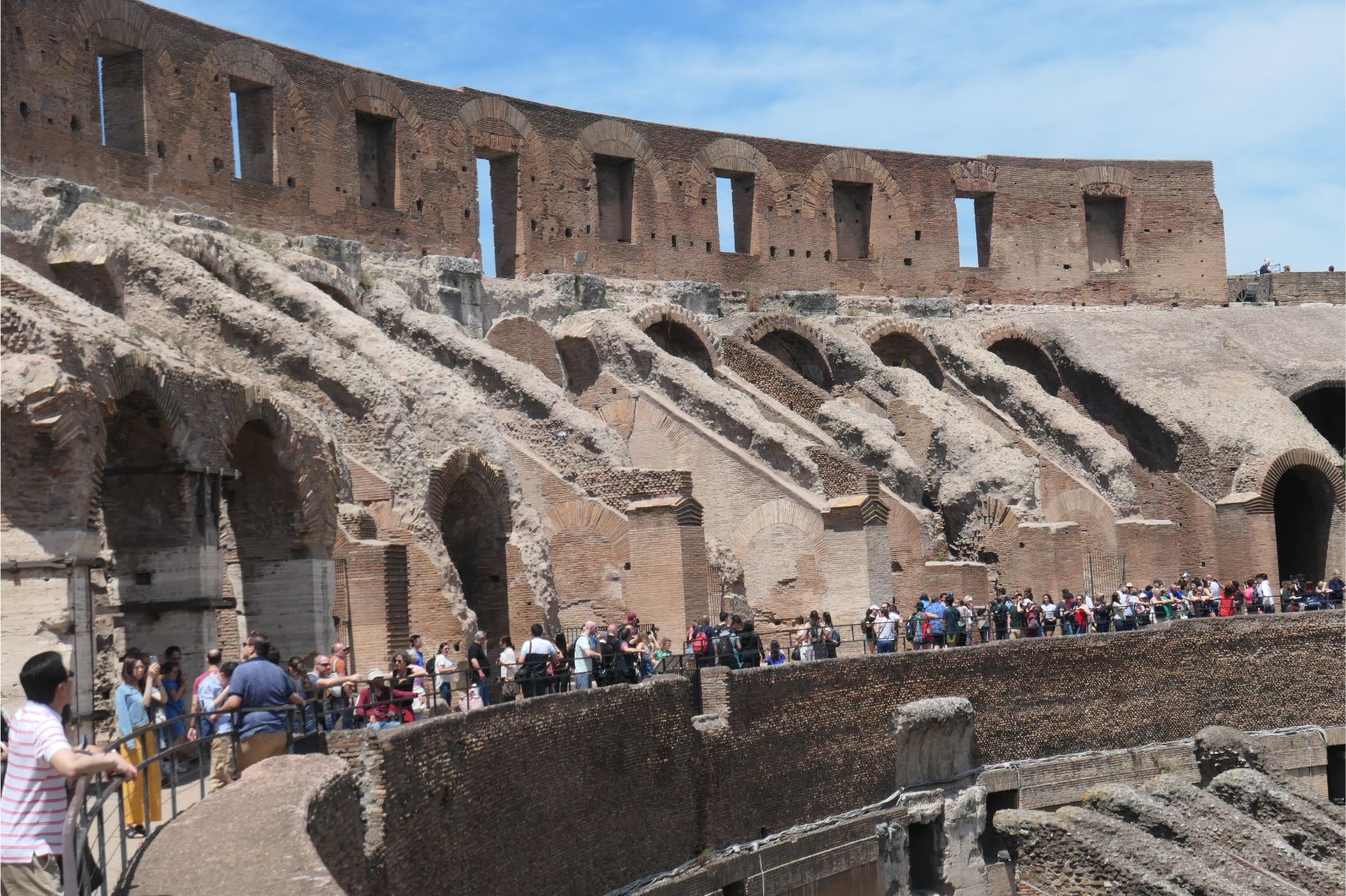We had wisely purchased skip-the-line tickets for the Colosseum. They allowed us to join a much shorter line to enter the security scanning area. From there we were free to explore the structure at our own pace. We headed up the steep stairs to the second level. Artefacts and displays on this level explained how the structure was built and what happened in the arena. It was helpful to see reconstructions of how it might have looked in ancient times and where people would sit to watch the events, as many parts of the original structure no longer remain. Marg and I agreed that it would have been quite a challenge for a spectator to make it all the way to the top of the stadium and then get safely down again on the very steep steps.