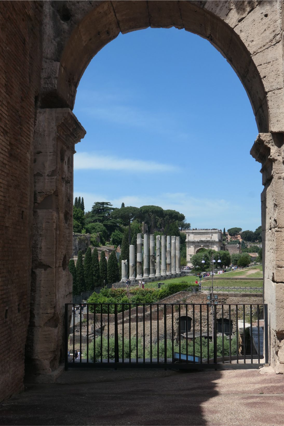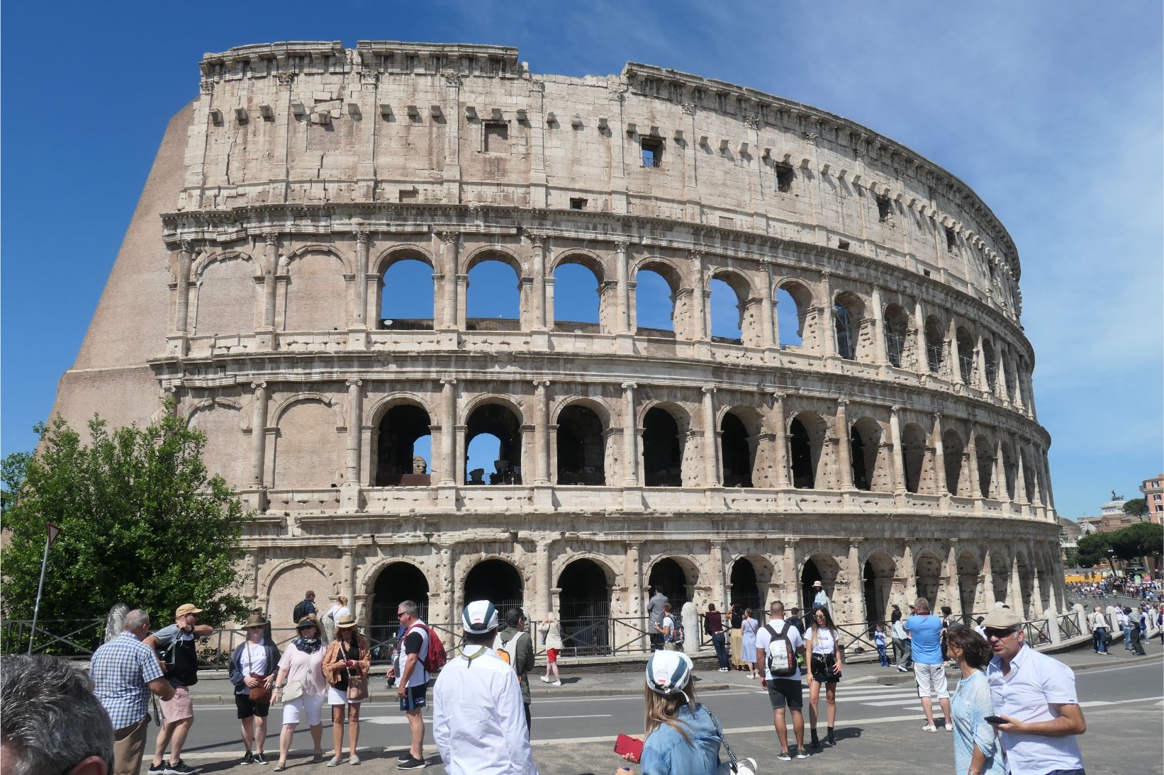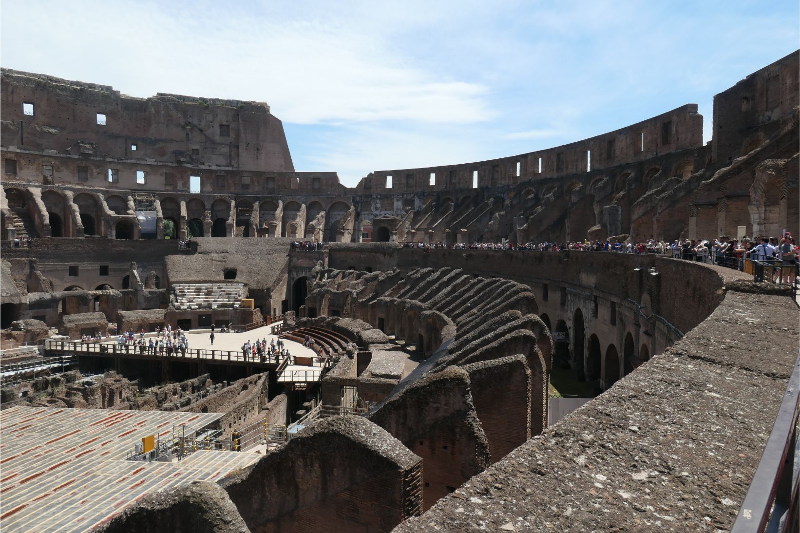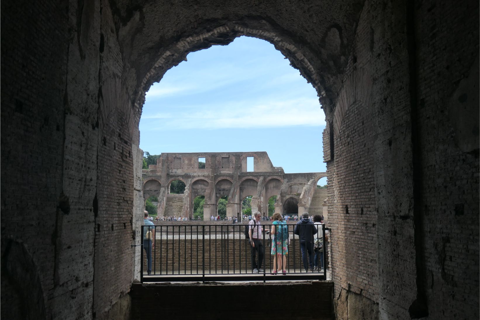 We had wisely purchased skip-the-line tickets for the Colosseum. They allowed us to join a much shorter line to enter the security scanning area. From there we were free to explore the structure at our own pace. We headed up the steep stairs to the second level. Artefacts and displays on this level explained how the structure was built and what happened in the arena. It was helpful to see reconstructions of how it might have looked in ancient times and where people would sit to watch the events, as many parts of the original structure no longer remain. Marg and I agreed that it would have been quite a challenge for a spectator to make it all the way to the top of the stadium and then get safely down again on the very steep steps.