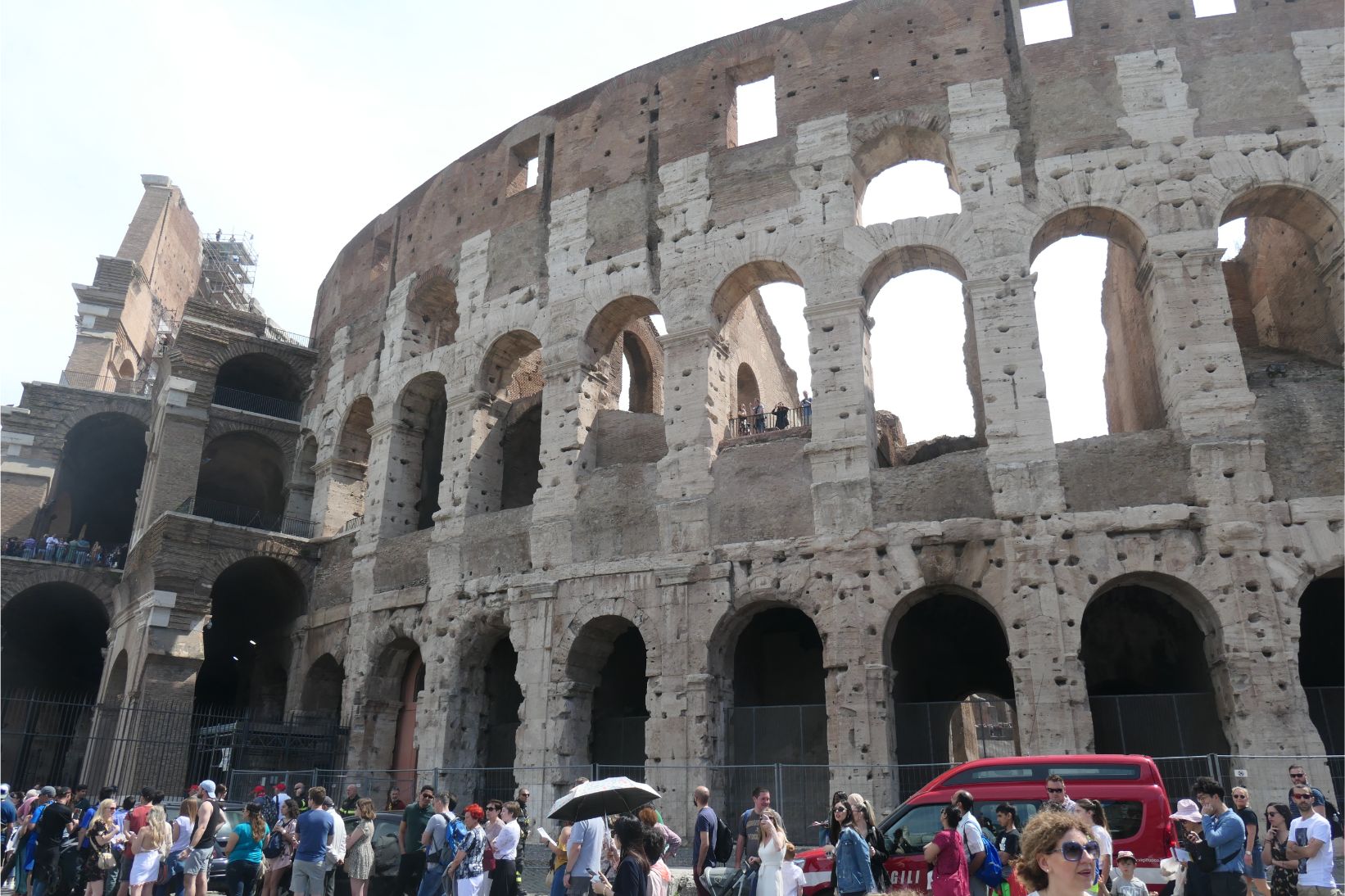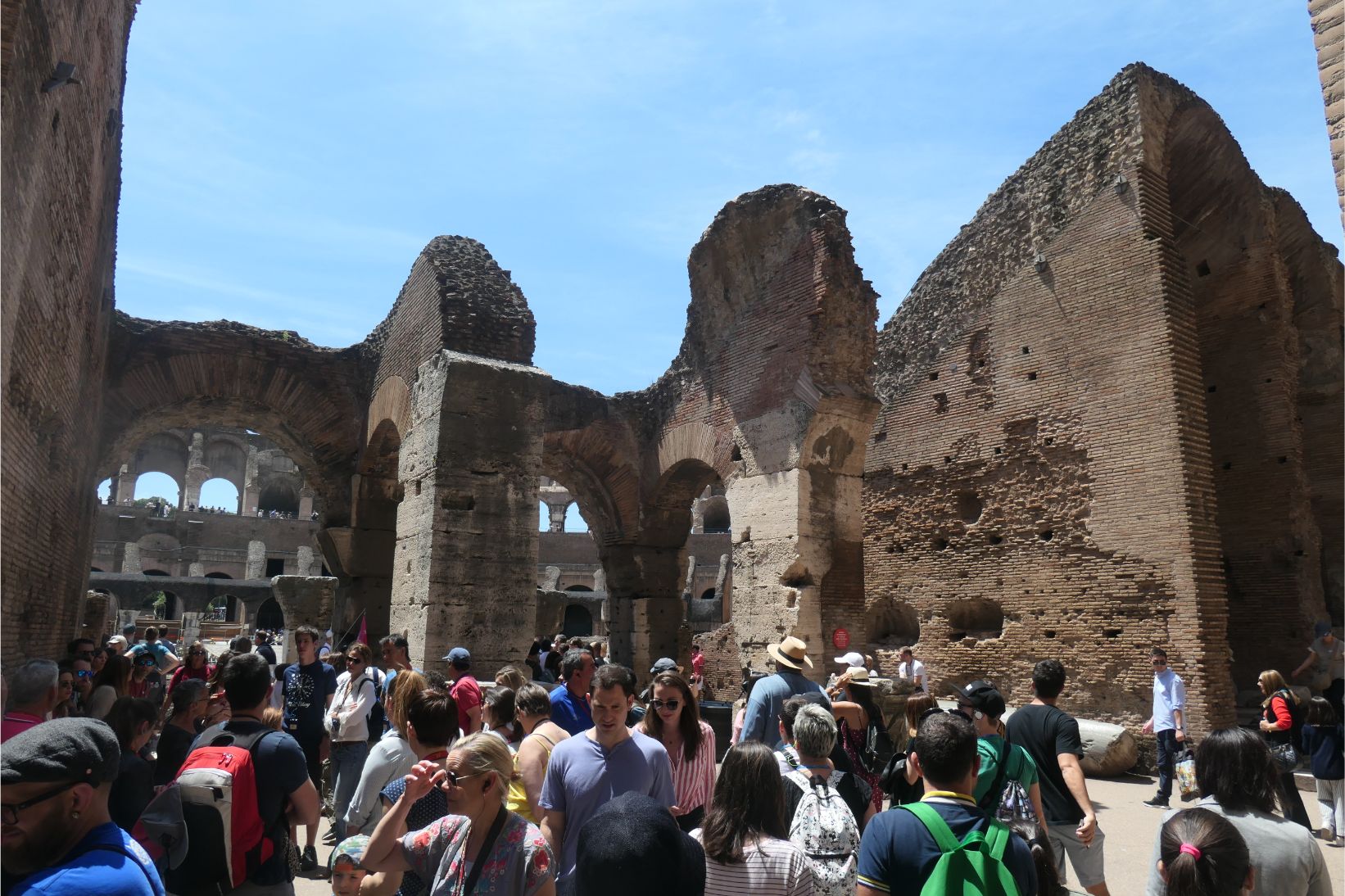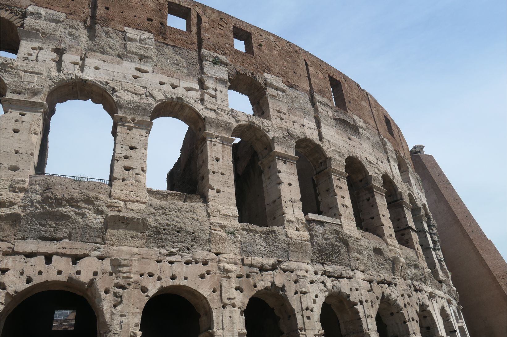 We went out from the galleries into the sunshine and walked in a slow circle around the upper level. Whilst it was fascinating to look at the familiar arched walls of the Colosseum from a distance, it was also really interesting to view them up close, examining the brickwork and the placement of huge marble blocks to see how it had all been put together. One impression I came away with is that it appears to be remarkably solid and likely to still be standing centuries from now. Despite the brutal deaths that occurred here, where people were sometimes hunted to death by animals for the entertainment of spectators, we concluded that this really is a place of great beauty and remarkable architectural design and building knowhow.