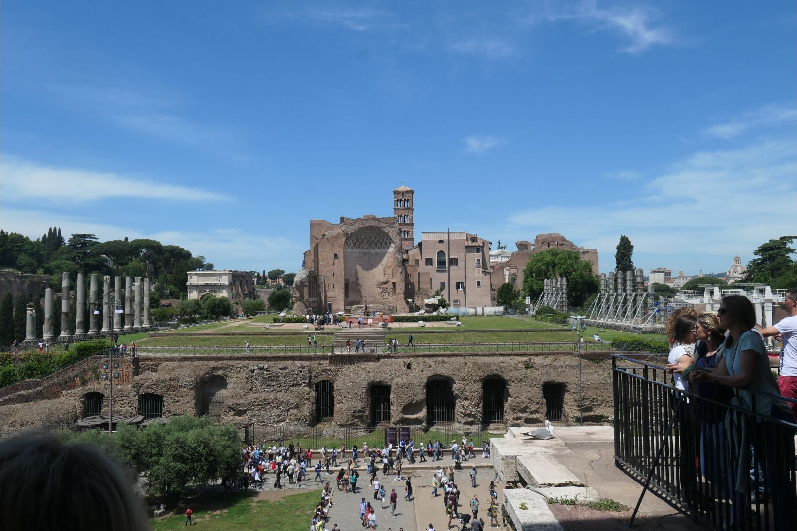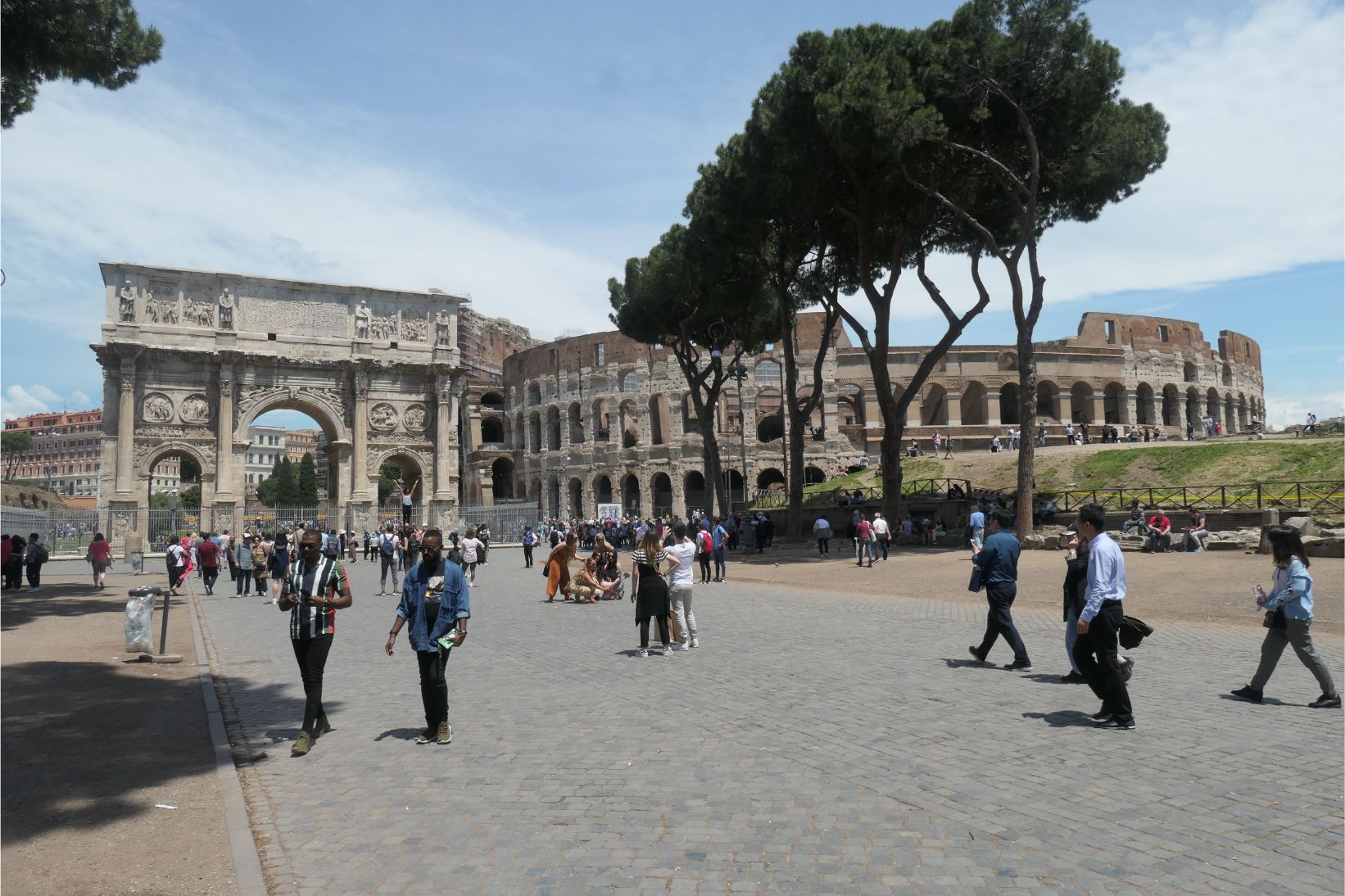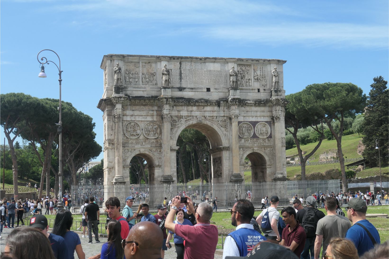 We went out from the galleries into the sunshine and walked in a slow circle around the upper level. Whilst it was fascinating to look at the familiar arched walls of the Colosseum from a distance, it was also really interesting to view them up close, examining the brickwork and the placement of huge marble blocks to see how it had all been put together. One impression I came away with is that it appears to be remarkably solid and likely to still be standing centuries from now. Despite the brutal deaths that occurred here, where people were sometimes hunted to death by animals for the entertainment of spectators, we concluded that this really is a place of great beauty and remarkable architectural design and building knowhow.