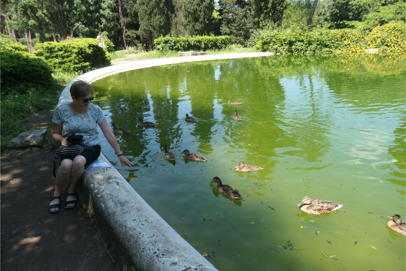 The sun was quite hot in the centre of the piazza. We climbed the stairs into the large park that houses the Villa Borghese. There it was good to walk around for a while in the shade of the trees. This was quite a popular park with both tourists and locals. Many people were hiring pedal-operated tuk tuks and riding along the paths that criss-crossed the gardens. We sat by the small lake for a while, watching the ducks, then found a panini place and ordered take away so we could sit on a park bench and eat our lunch in the park.