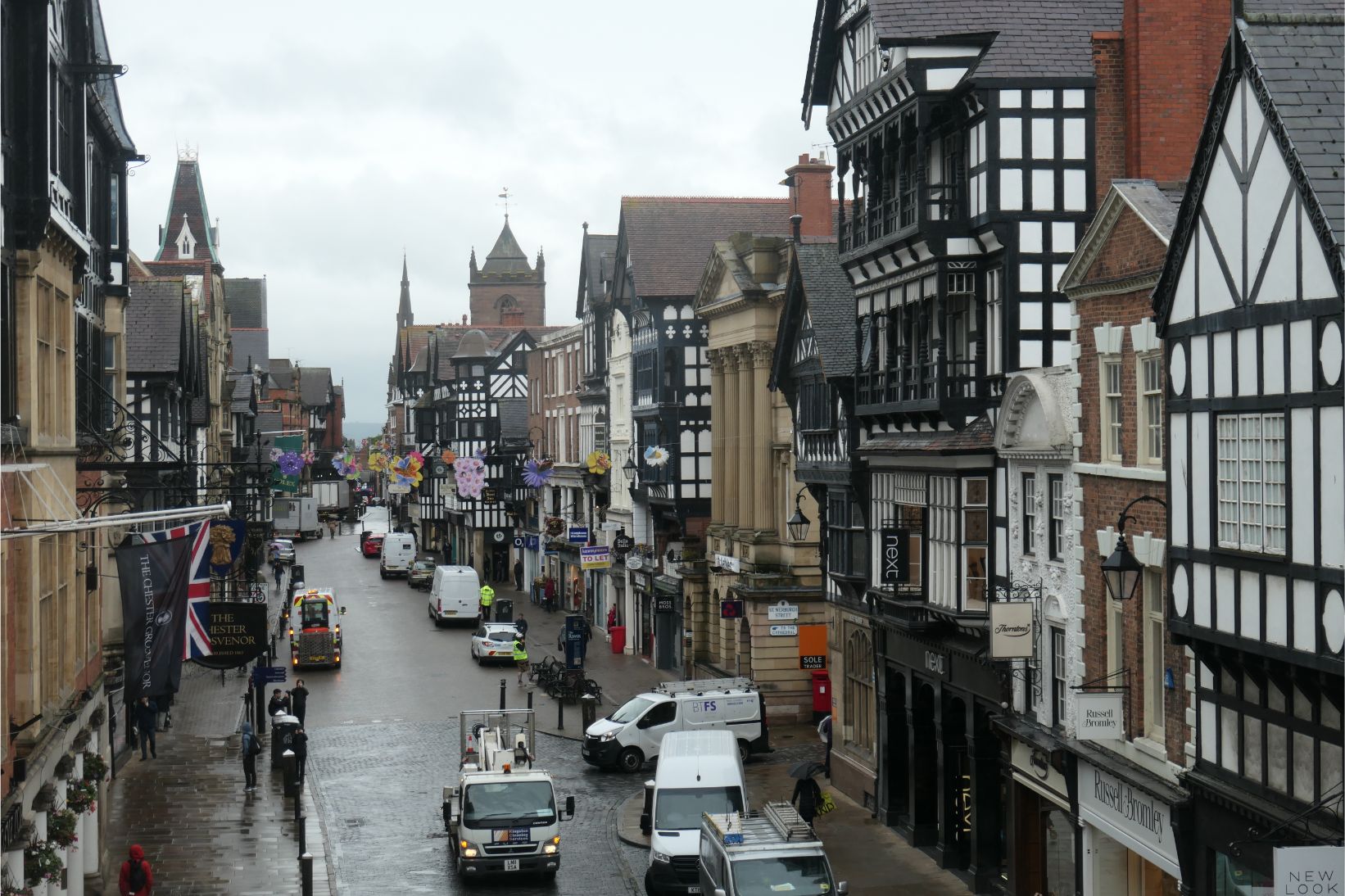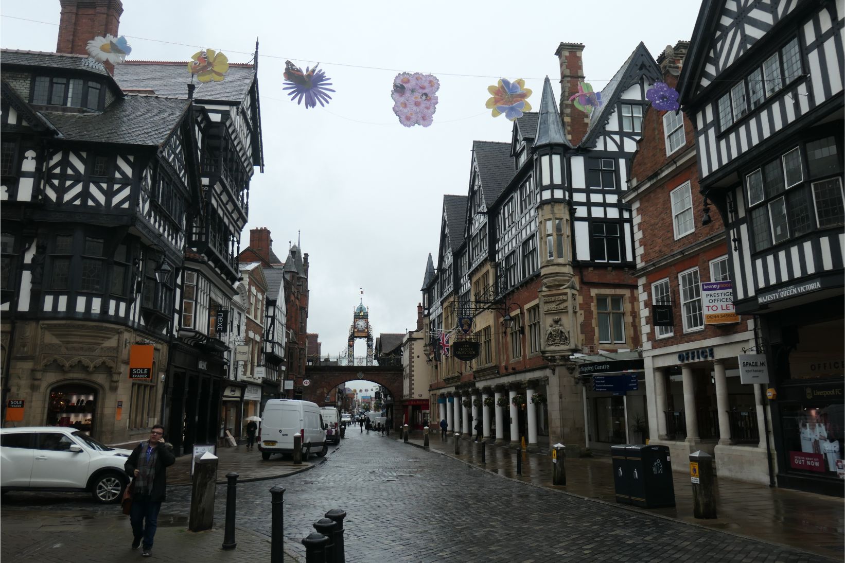 This morning’s first stop was the historic English town of Chester, in Cheshire, just a little way from the border with North Wales. Chester was a Roman town, and we walked for a short way along the Roman city wall. Chester is also famous for the magnificent rows in the heart of its shopping precinct. The rows are covered walkways on the first floor level of the main thoroughfares, which are directly on top of the shops at street level. And there are many example of beautiful half timbered buildings in these streets as well. Chester oozes old world charm, and we loved it. After a guided walk through the old town, we were left with about 20 minutes spare time to explore the city, so we made a beeline for a wool shop and Marg was delighted to be able to buy some new wool from the British Isles.